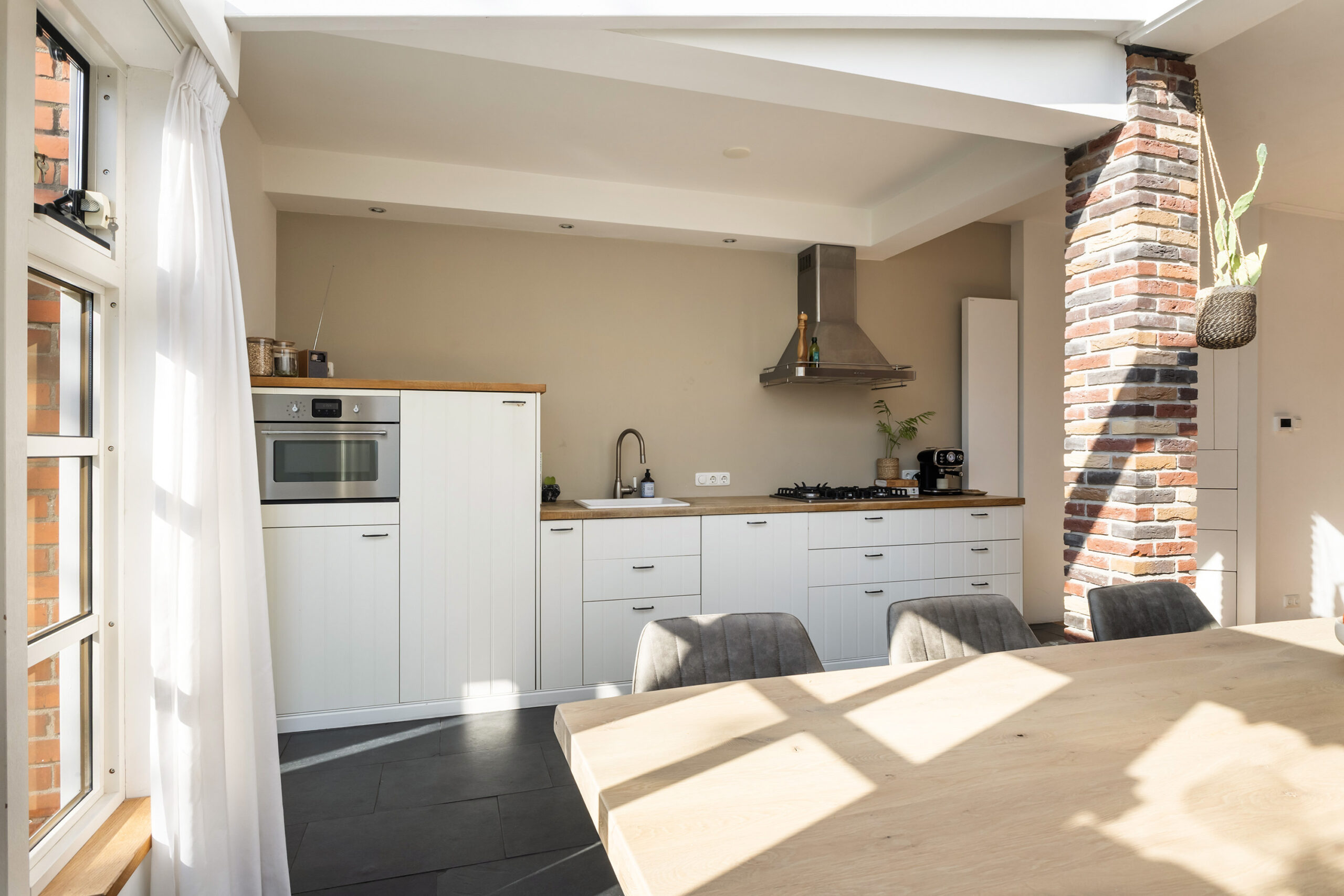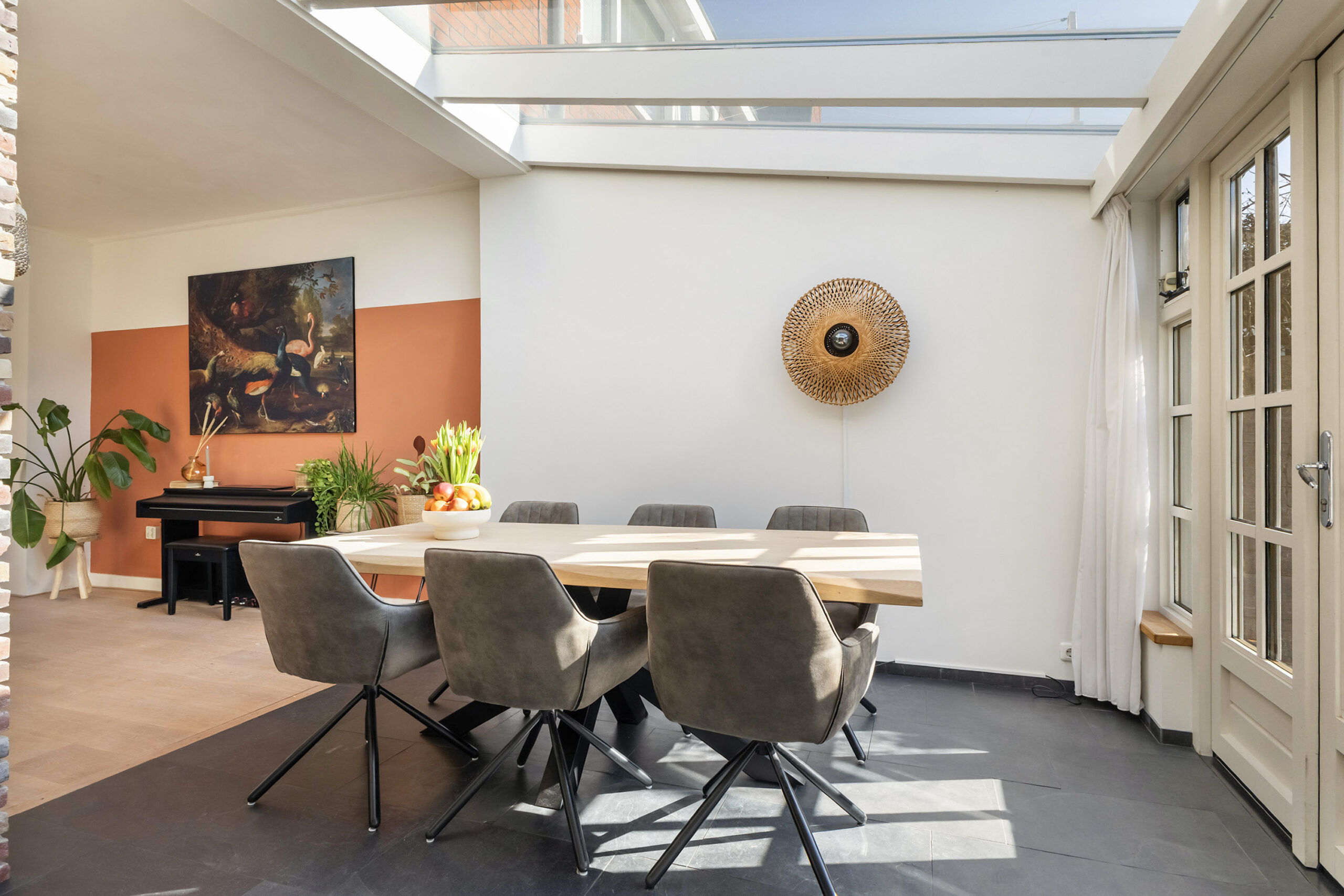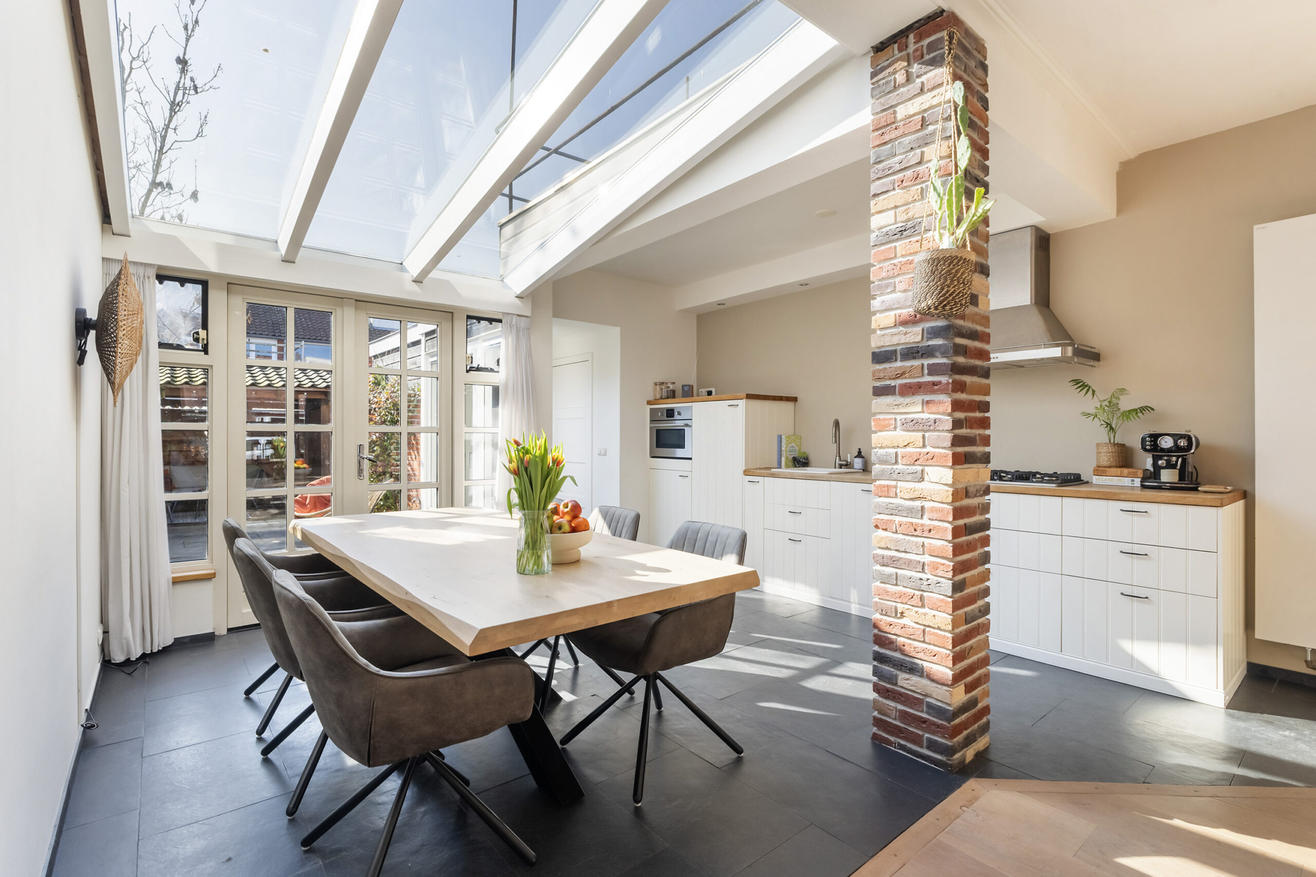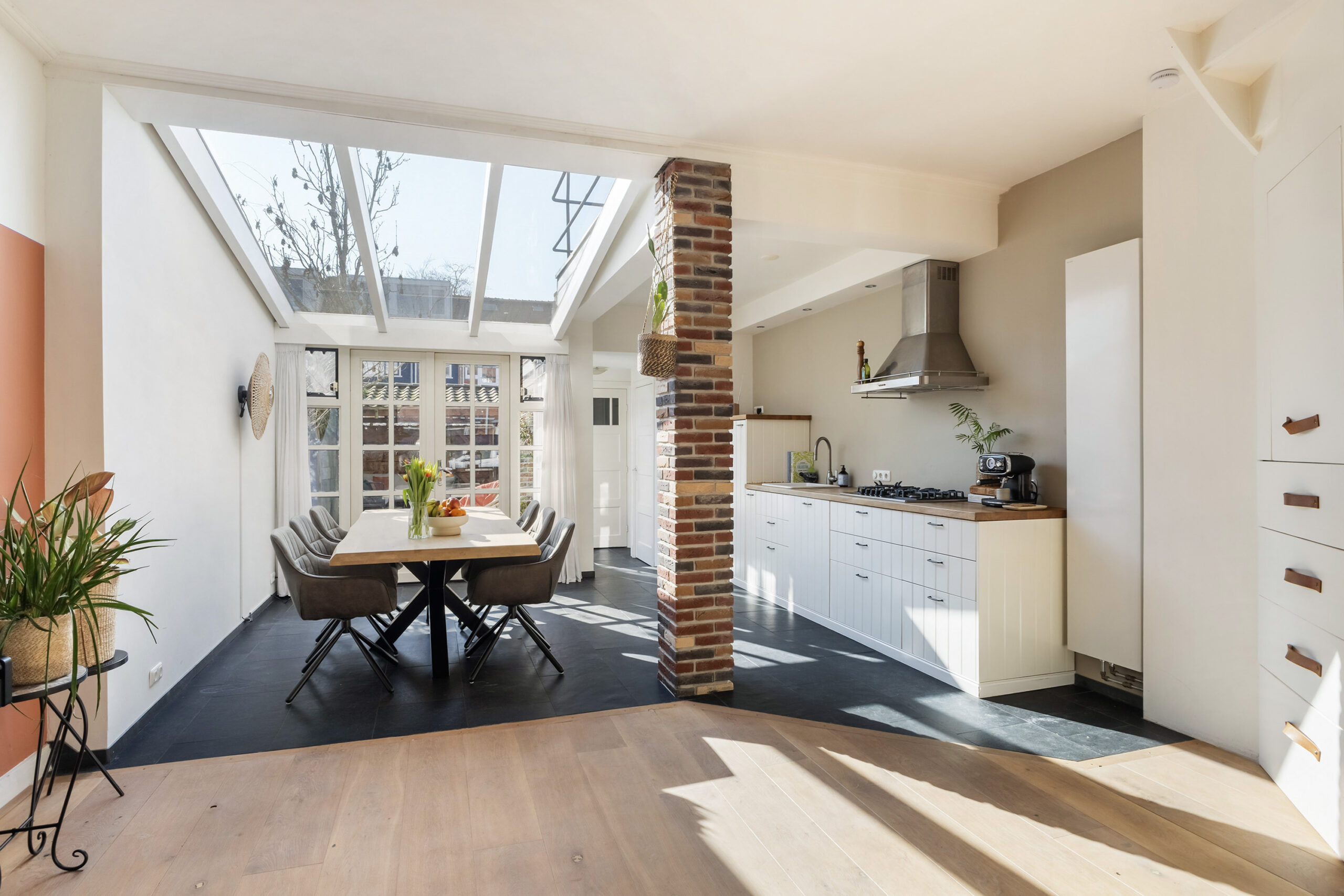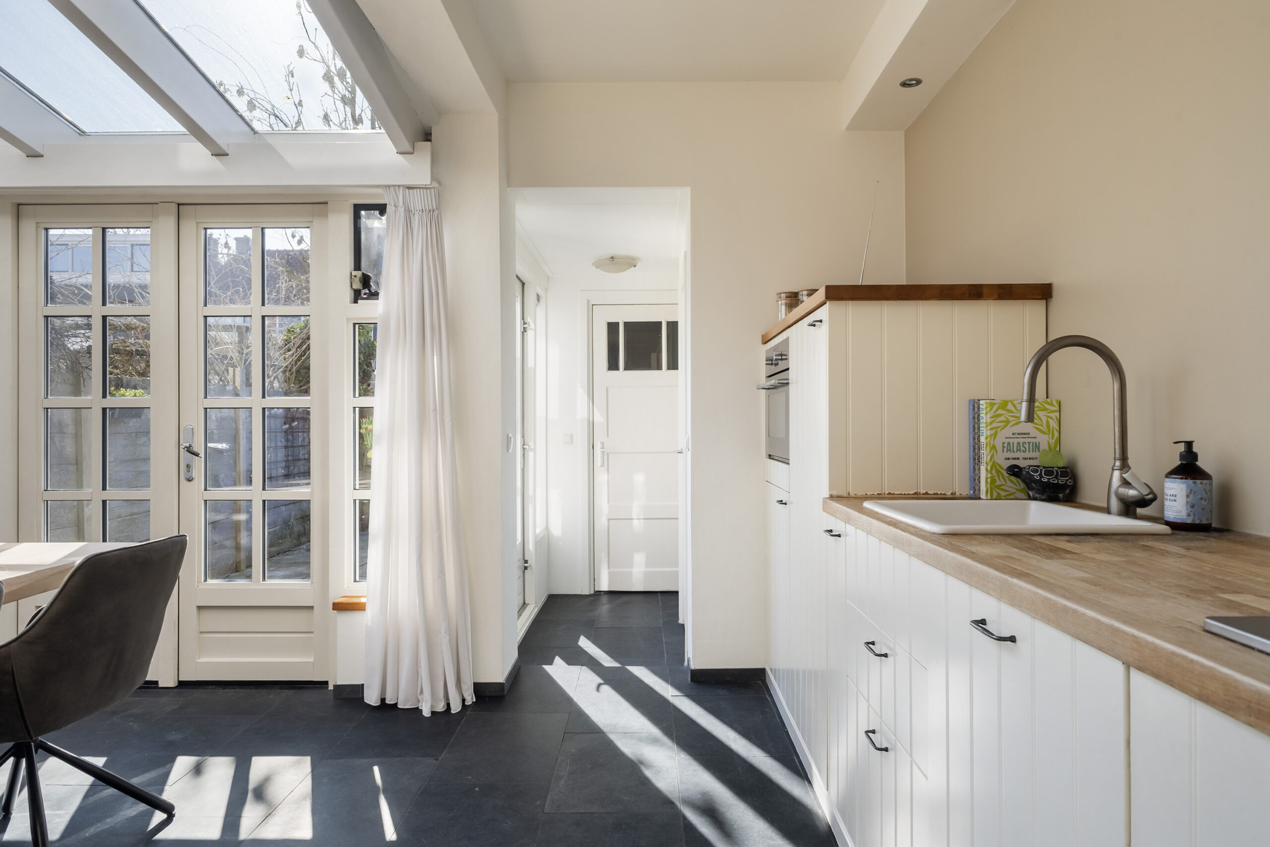 – woonkamer met aangebouwde serre, open keuken (2016) met inbouwapparatuur, openslaande deuren naar de achtertuin