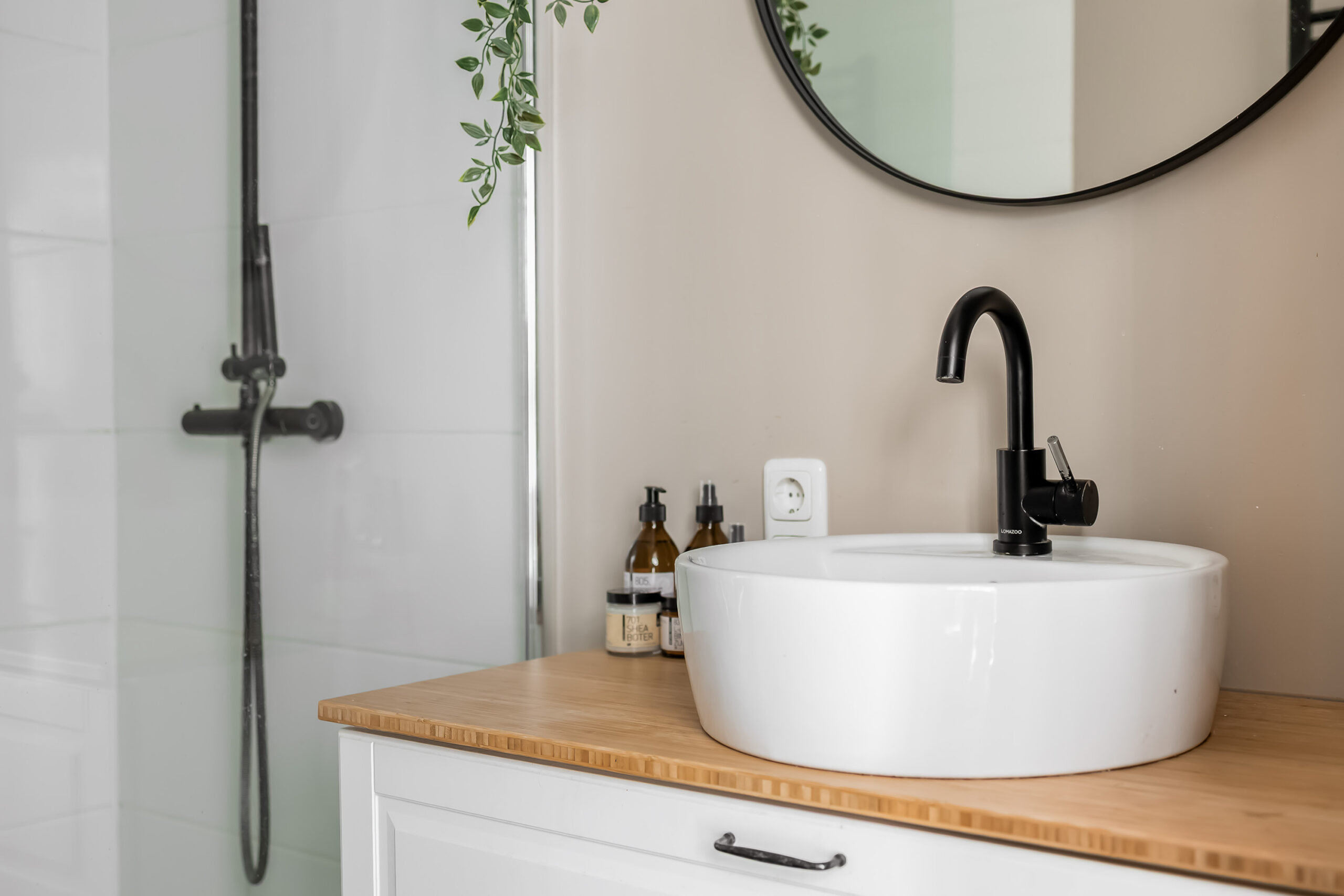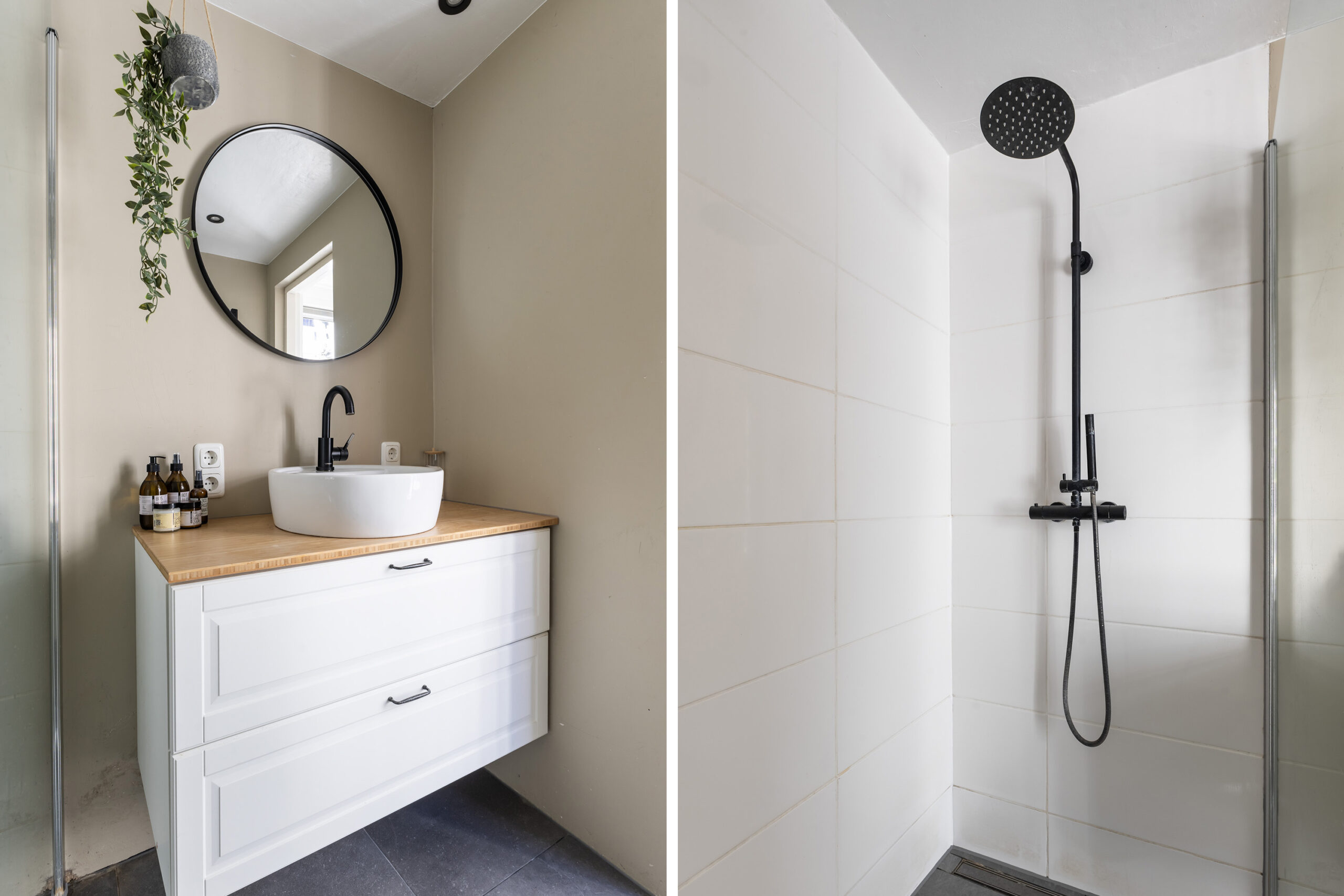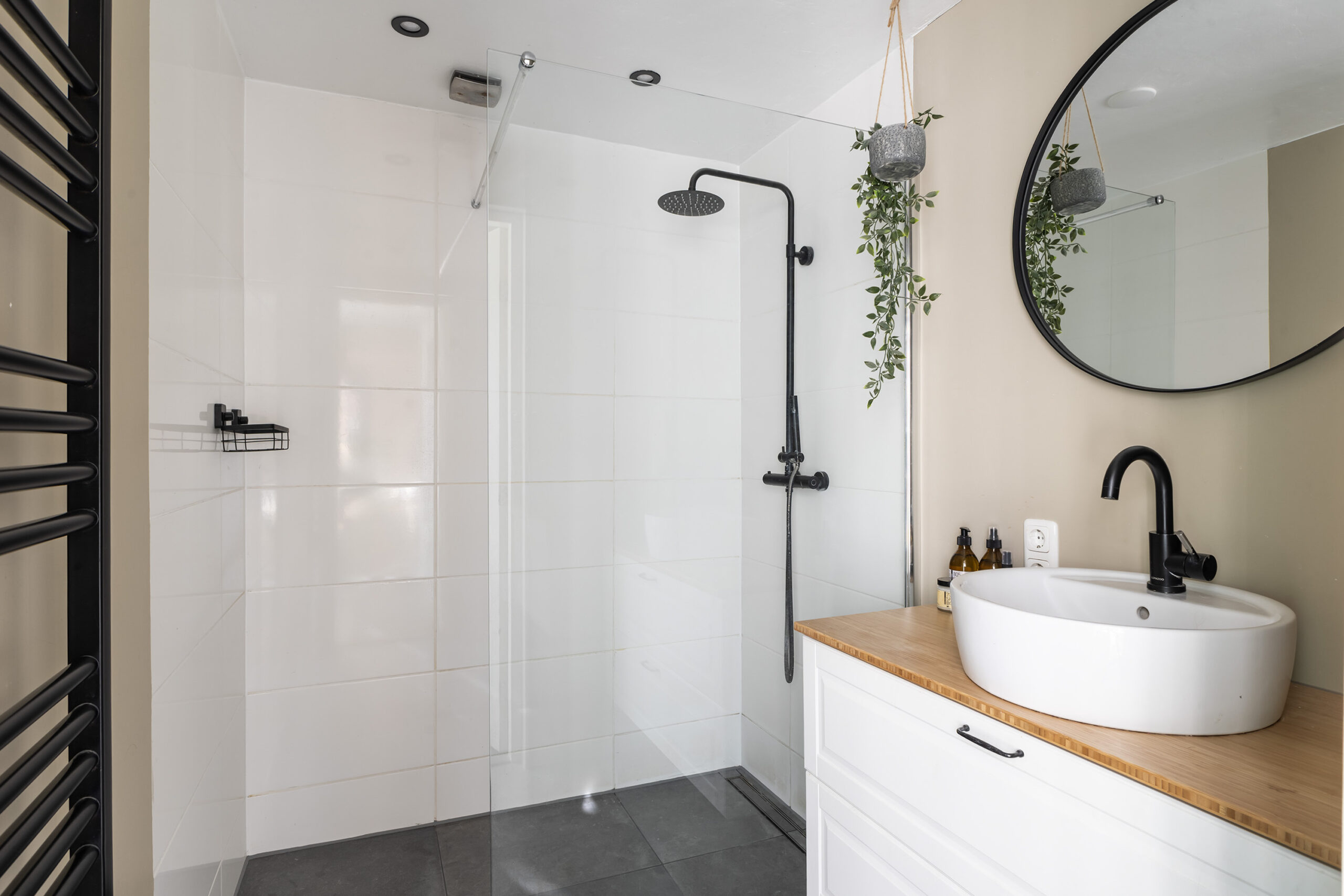 – moderne badkamer (2020) op de begane grond, voorzien van inloopdouche, wastafel met wastafelmeubel, designradiator en verlichte laden