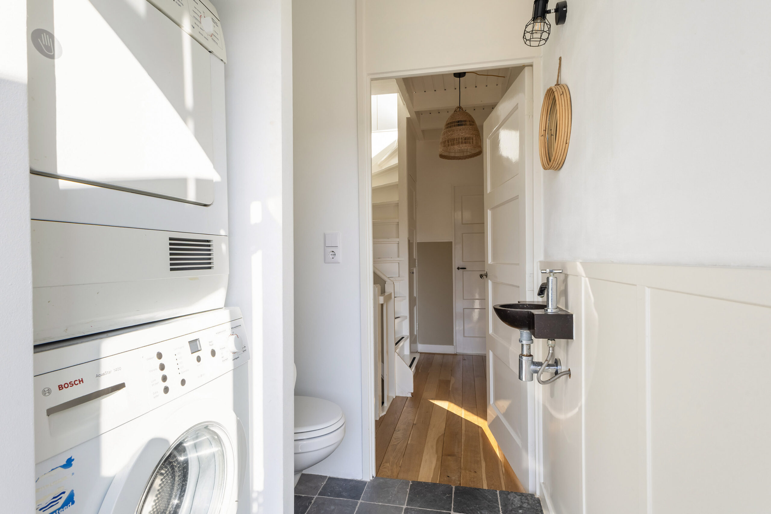 – eerste verdieping met 3 slaapkamers en een wasruimte met witgoedaansluiting, wastafel, toilet en toegang tot droogplat