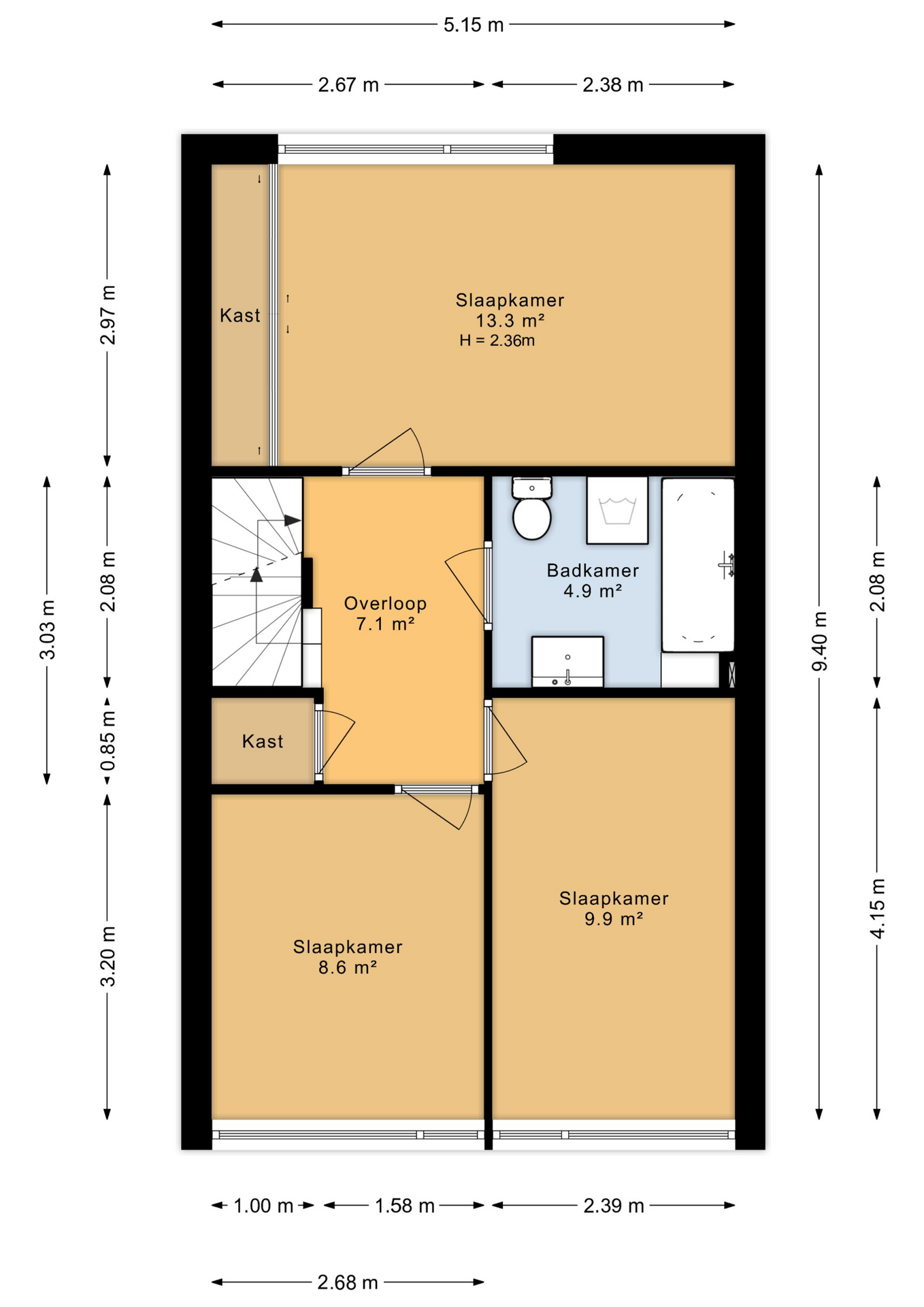 Centrale overloop van waaruit toegang tot 3 slaapkamers en de badkamer. De twee slaapkamers aan de voorzijde zijn respectievelijk 8,6 m2 en 9,9 m2 groot. De master bedroom van 13,3 m2 bevindt zich aan de achterzijde en beschikt over een ruime inbouwkast. De badkamer is voorzien van een wastafel met meubel, toilet, ligbad met douche en wasmachineaansluiting.