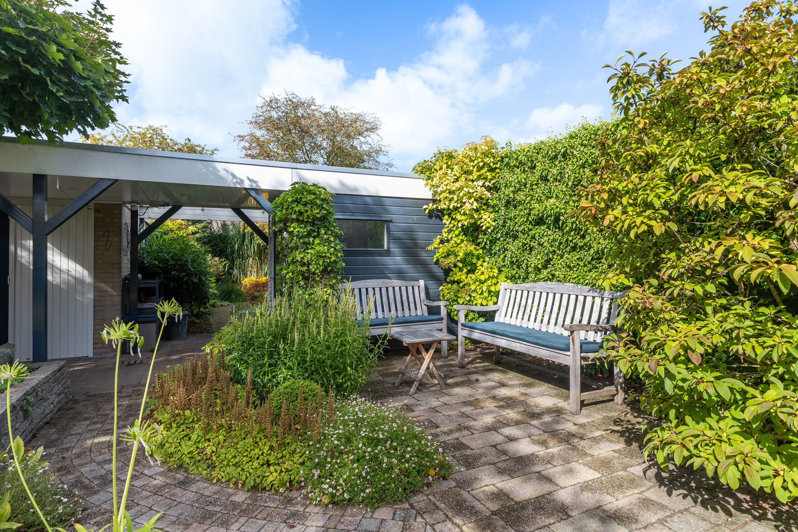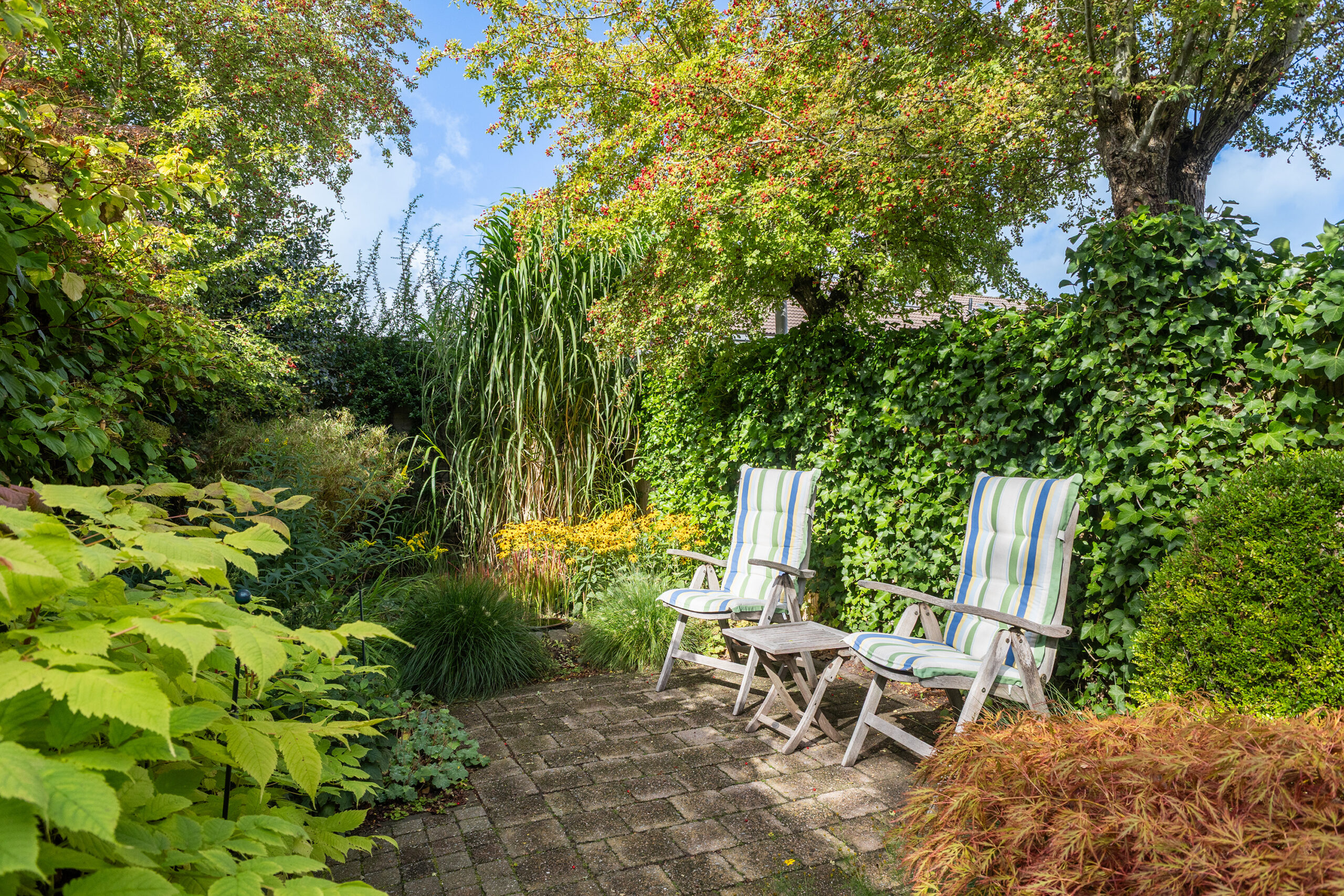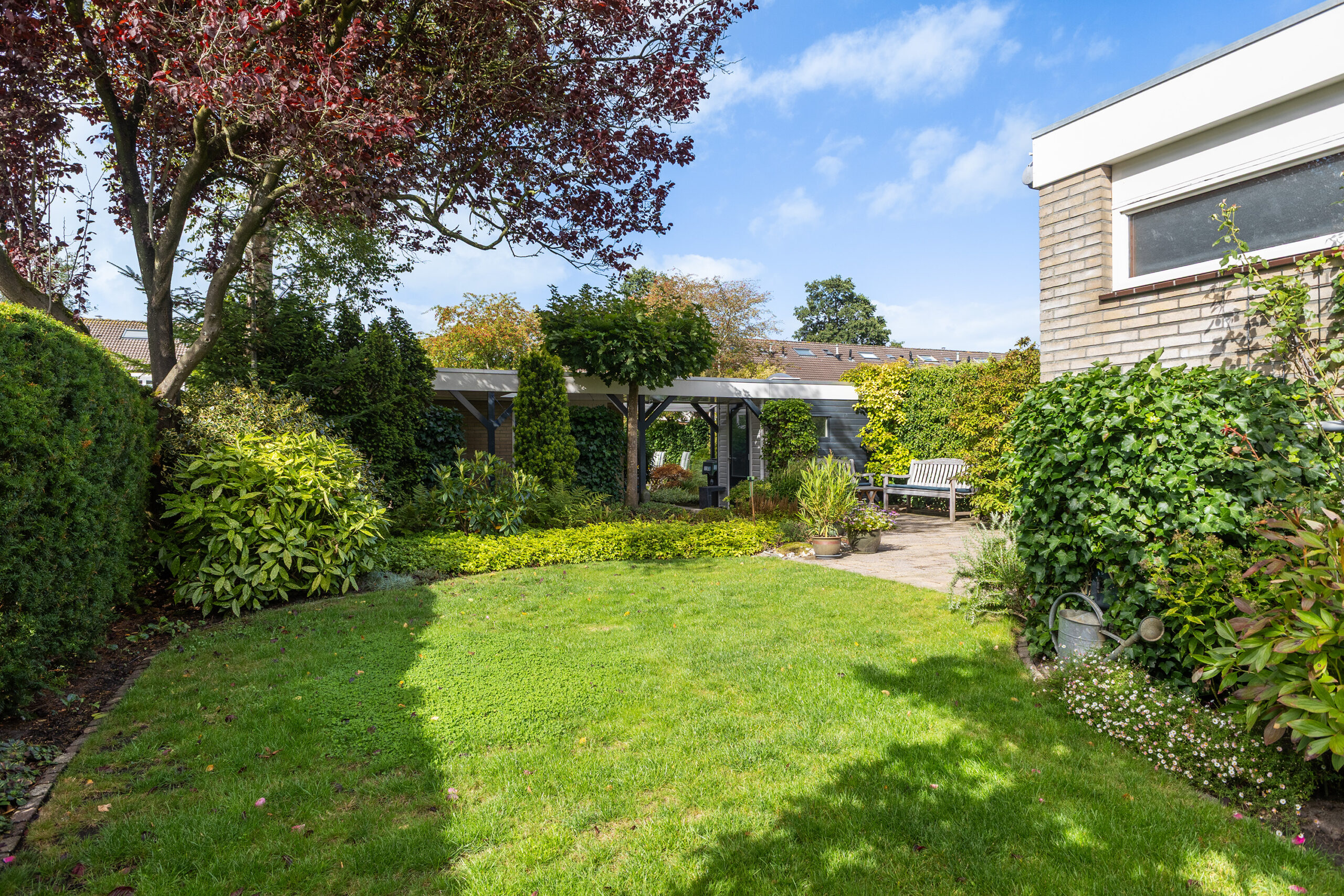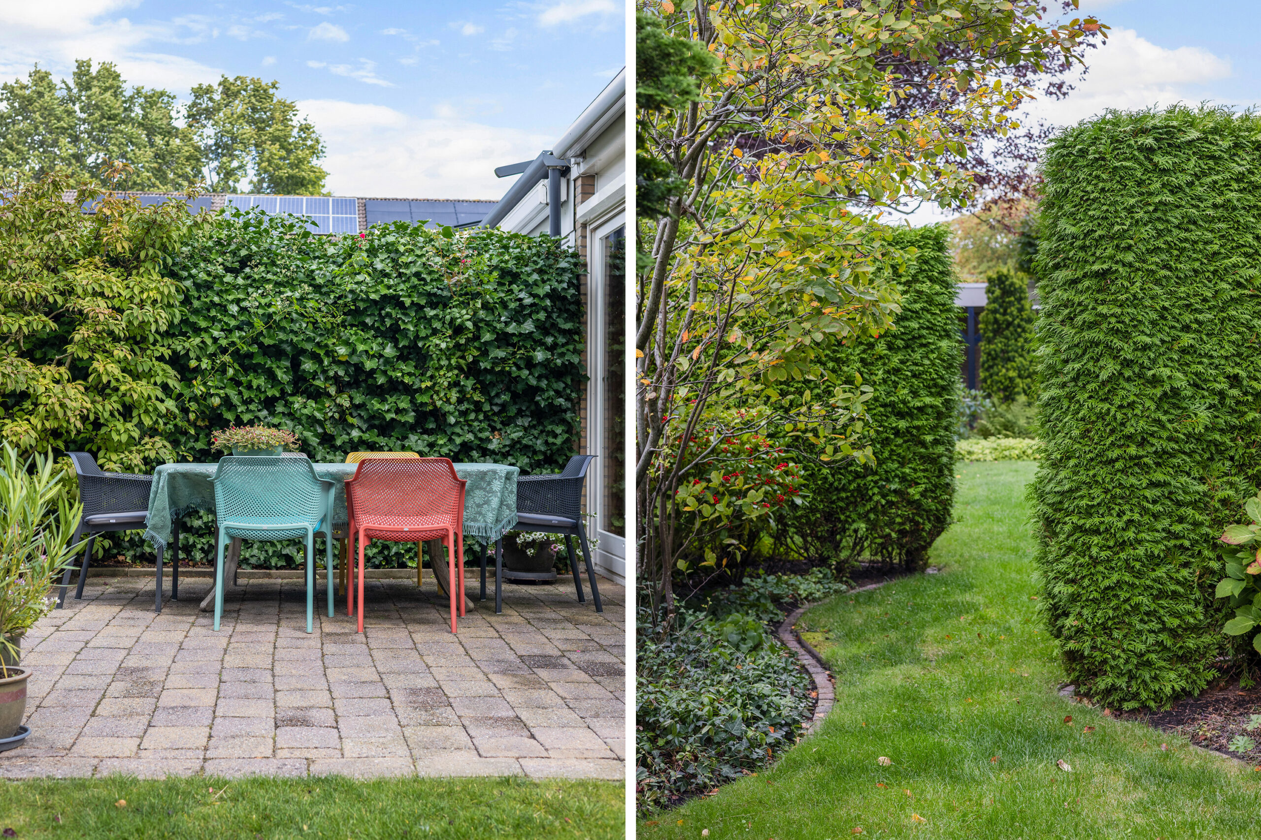 De fraai aangelegde, royale achtertuin is gelegen op het westen en beschikt over een vrijstaande garage, overkapping (voor motor of fietsen) en een fietsenhok. De ruim 3 meter brede garage heeft een elektrische sectionaaldeur en een loopdeur naar achteren. Achter de garage bevindt zich een extra stuk tuin. Tevens is er een brede zij-tuin aanwezig, welke is gelegen op het zuiden. Door de bomen en hoge heggen is er volop privacy.