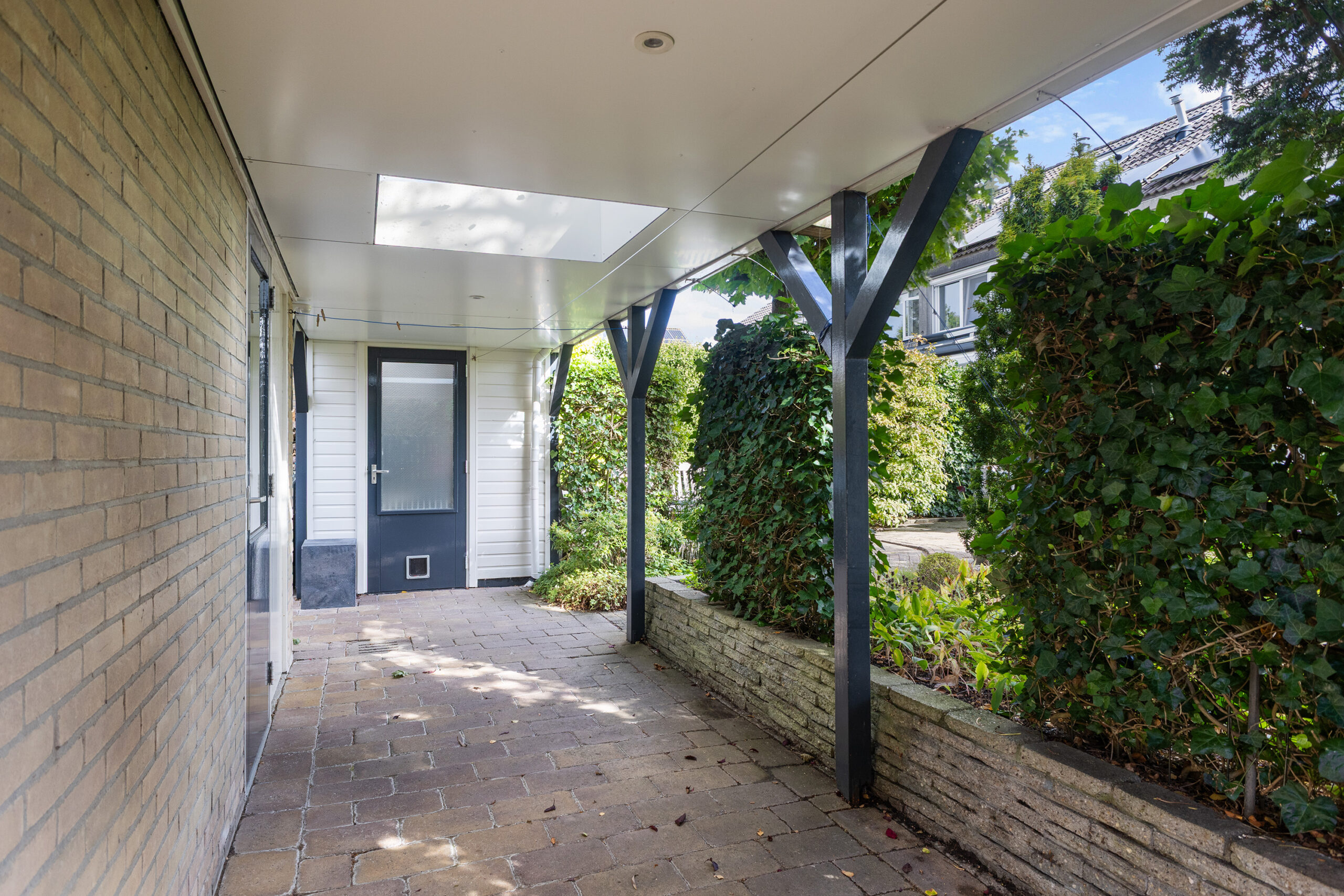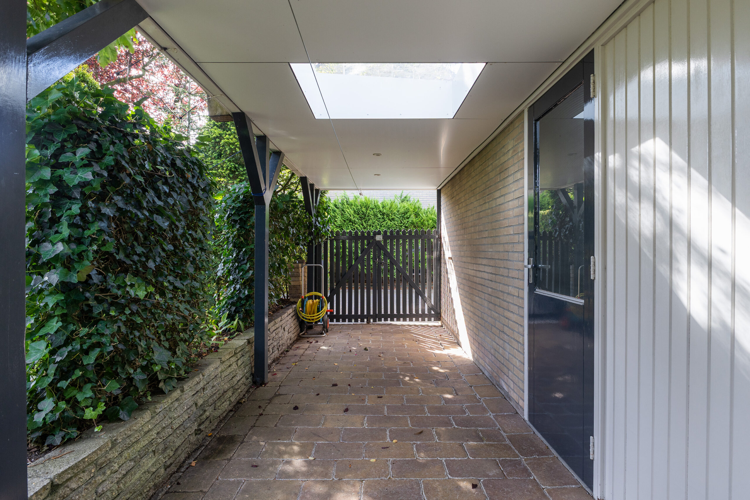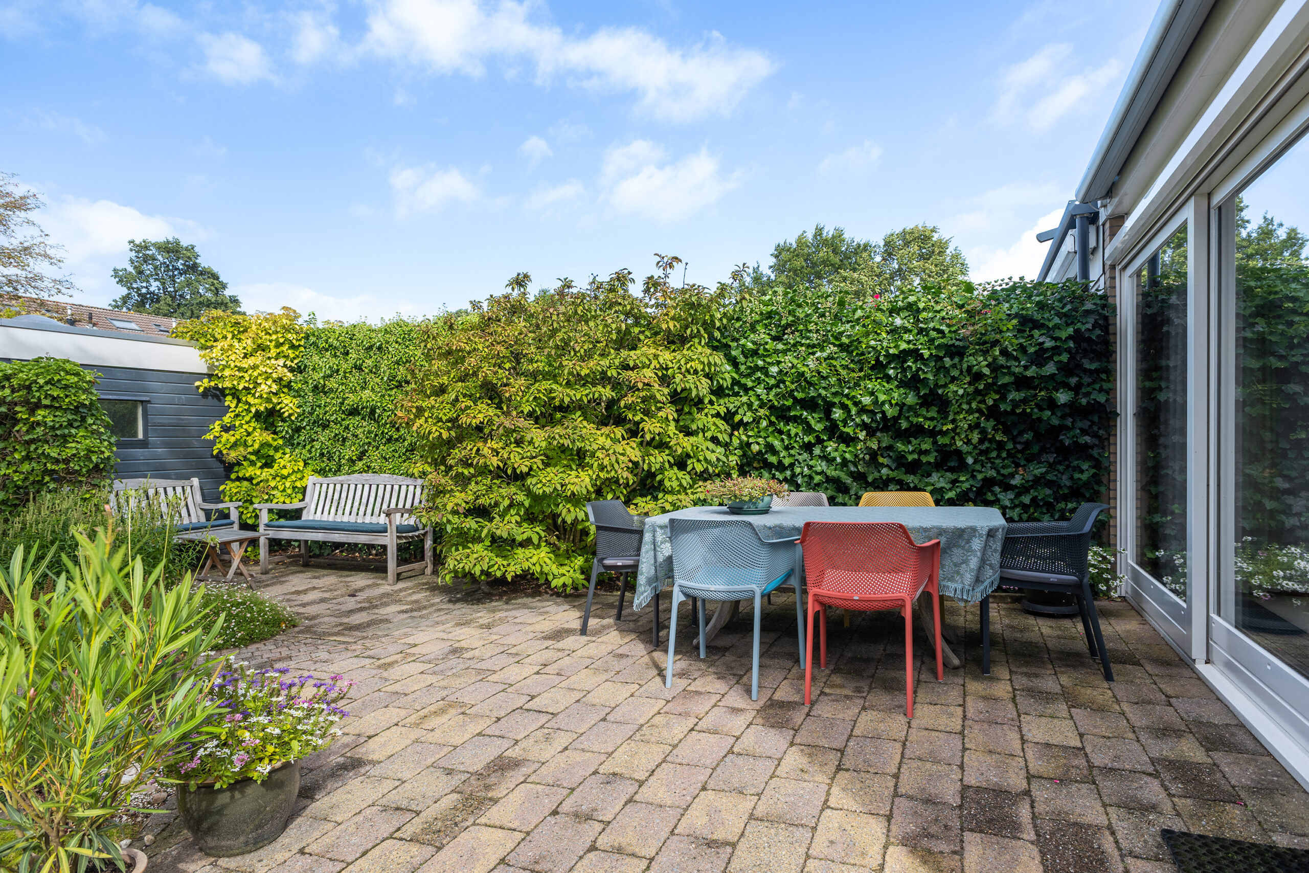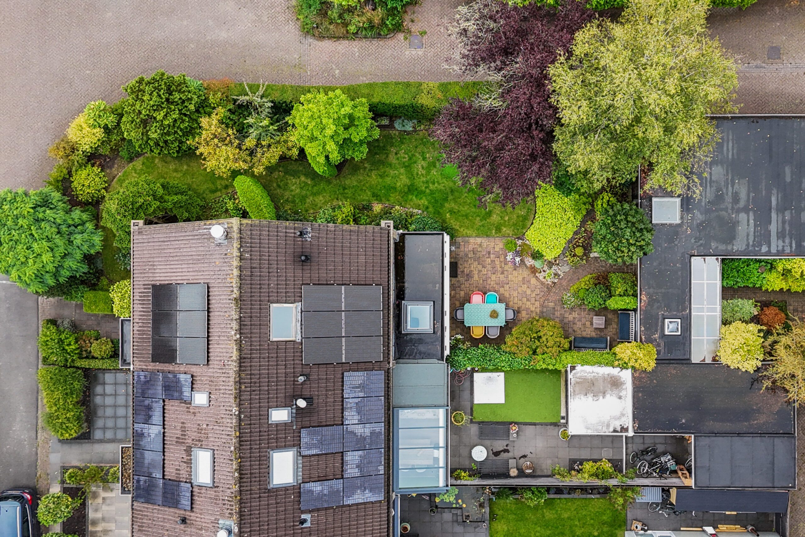 De fraai aangelegde, royale achtertuin is gelegen op het westen en beschikt over een vrijstaande garage, overkapping (voor motor of fietsen) en een fietsenhok. De ruim 3 meter brede garage heeft een elektrische sectionaaldeur en een loopdeur naar achteren. Achter de garage bevindt zich een extra stuk tuin. Tevens is er een brede zij-tuin aanwezig, welke is gelegen op het zuiden. Door de bomen en hoge heggen is er volop privacy.