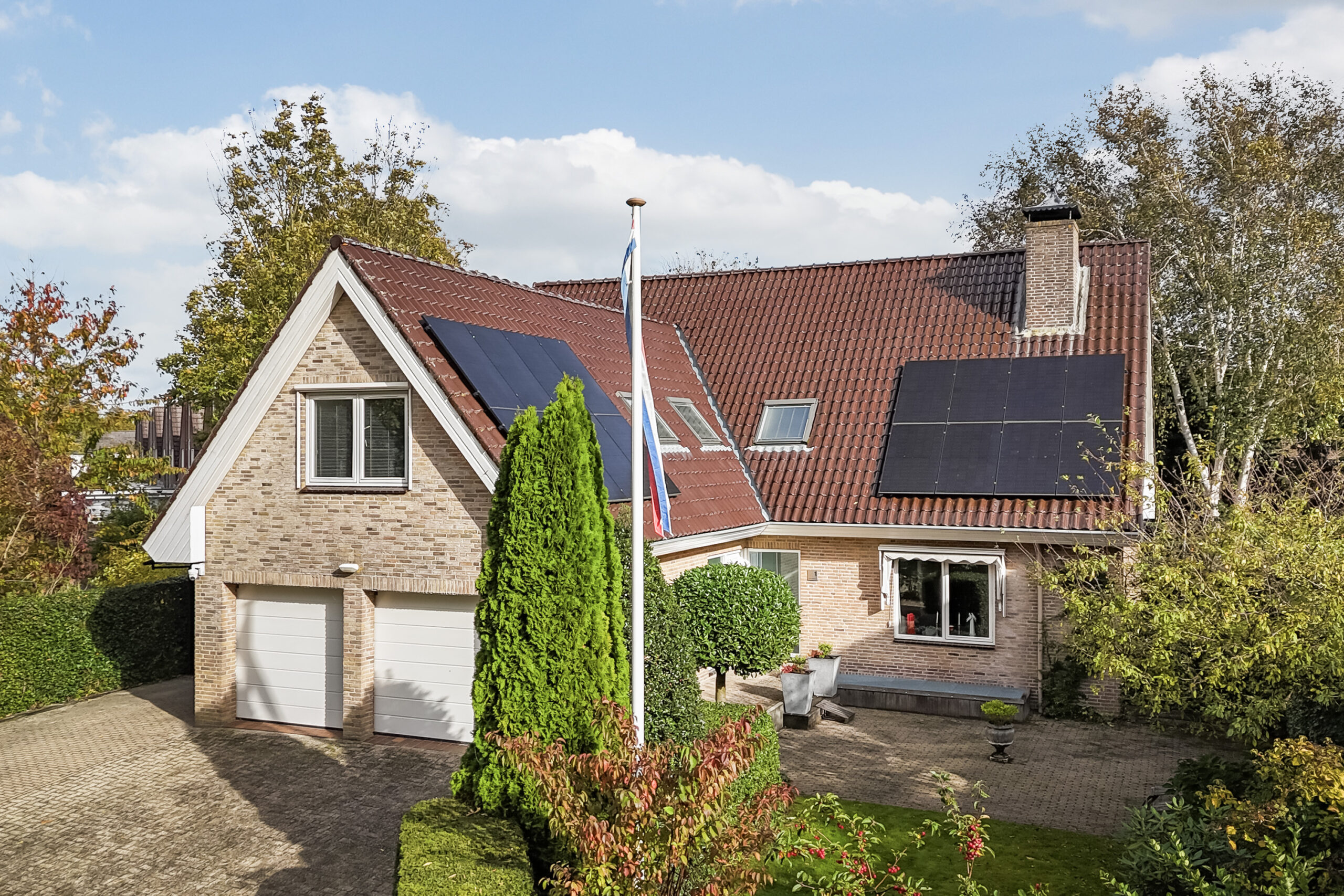Links van de woning is een overkapping voor het parkeren van een auto. Daarnaast biedt de dubbele garage ook nog plaats voor 2 auto’s. Het geheel is uitstekend onderhouden door de huidige eigenaren.