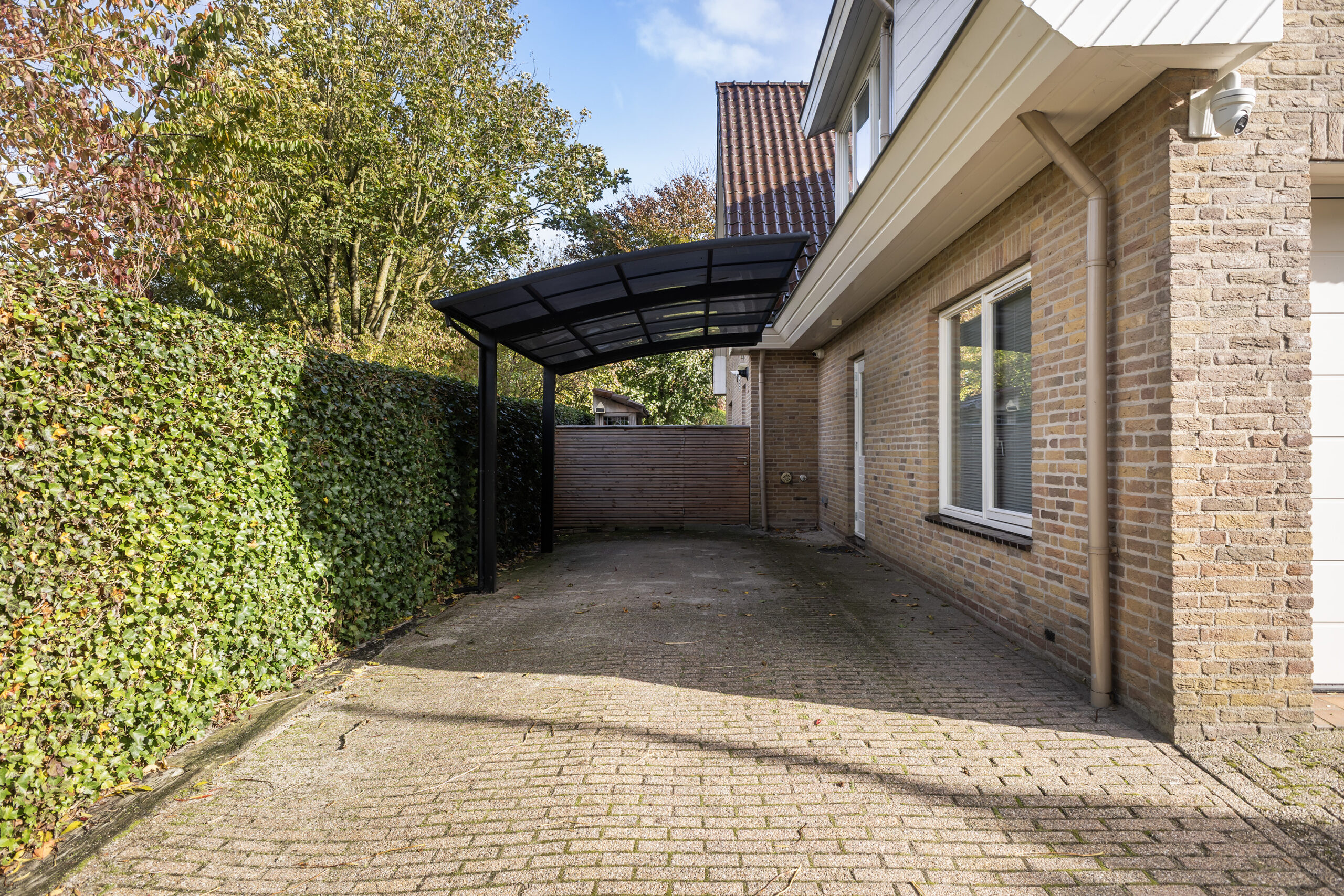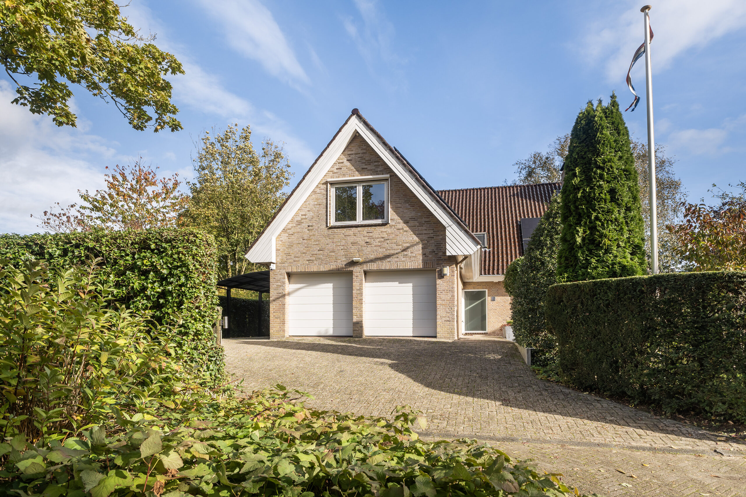 Links van de woning is een overkapping voor het parkeren van de auto, daarnaast biedt de dubbele garage ook plek voor het parkeren van de auto’s.