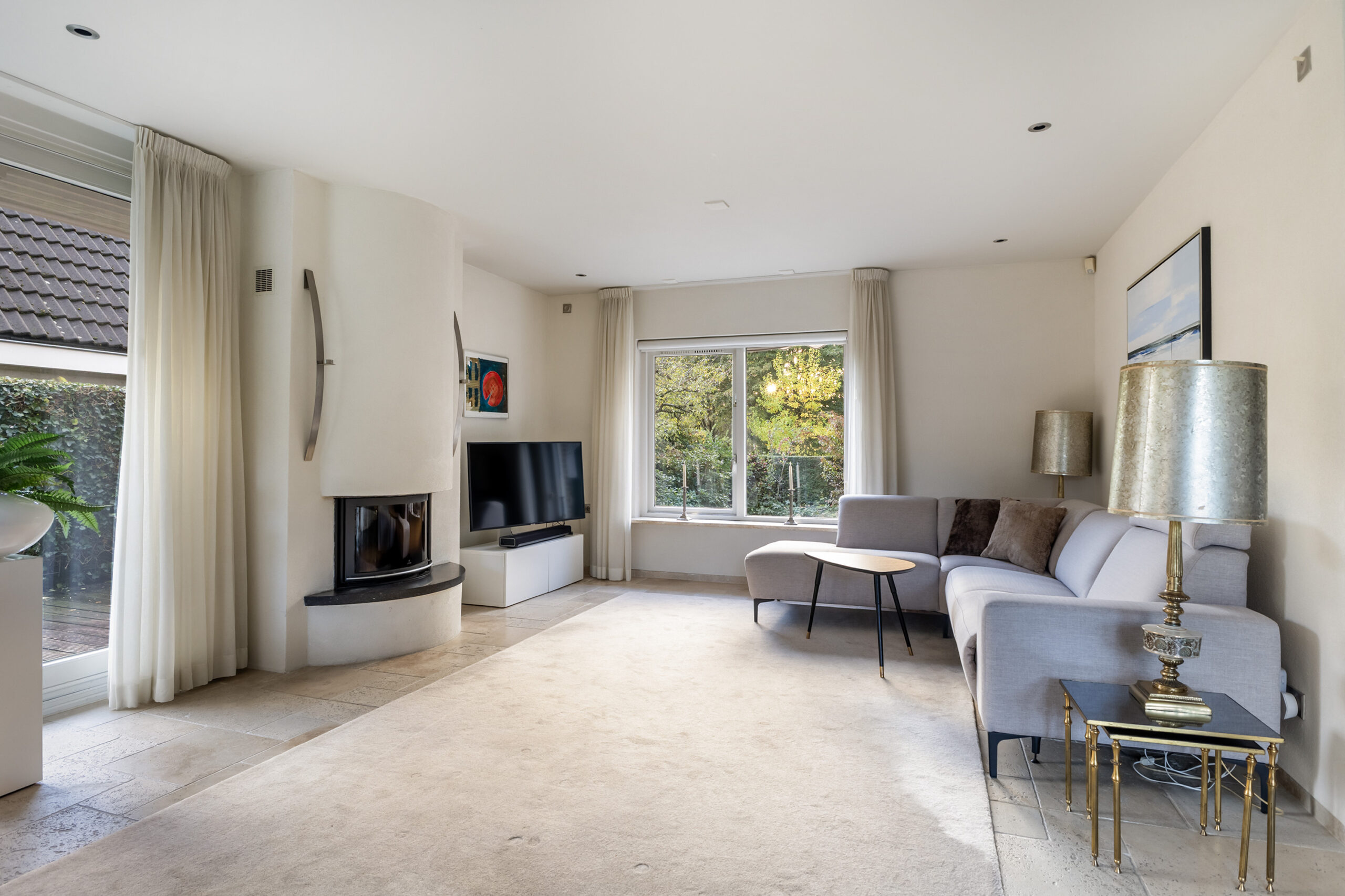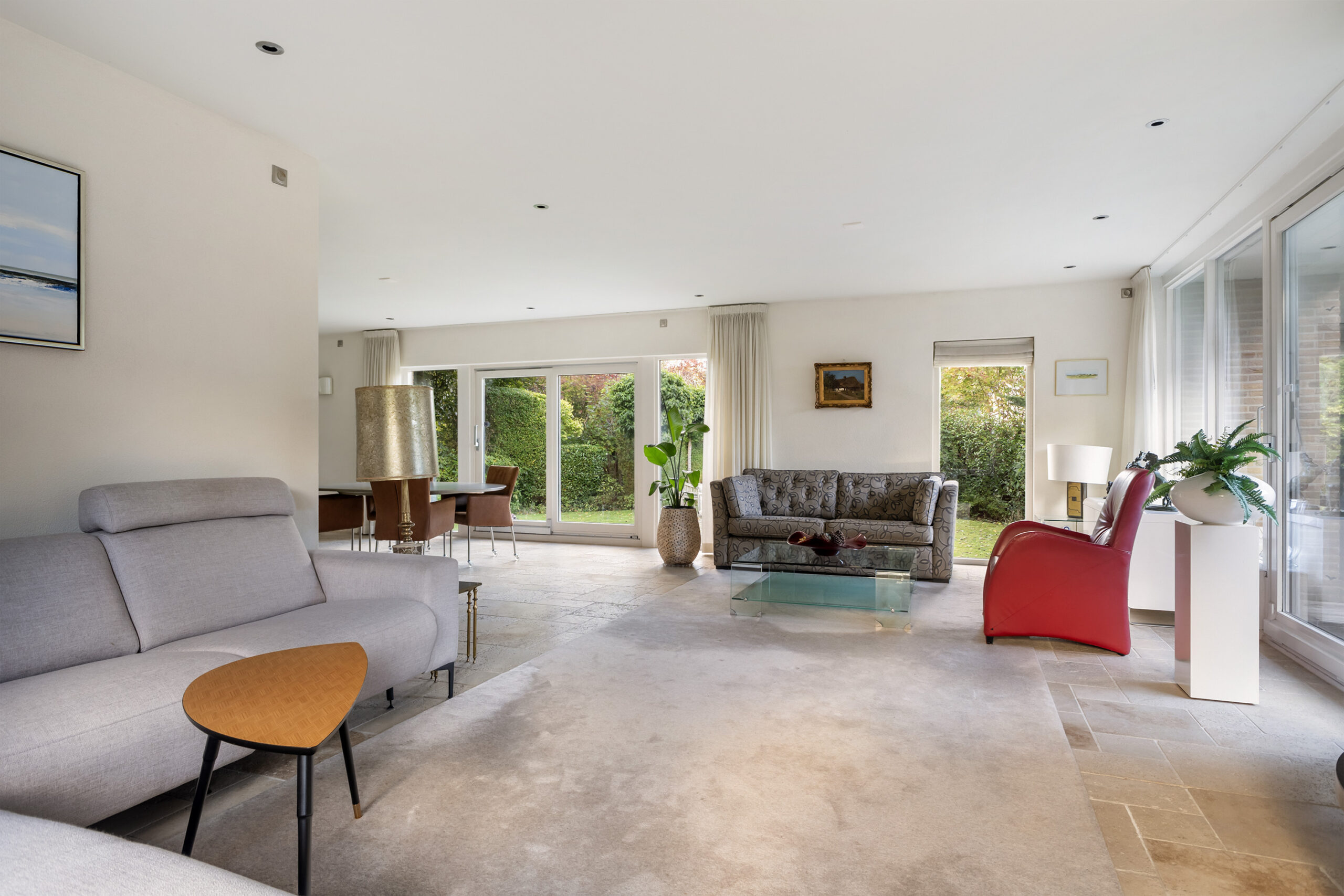 Op de begane grond is een ruime living met schuifpuien naar de tuin.