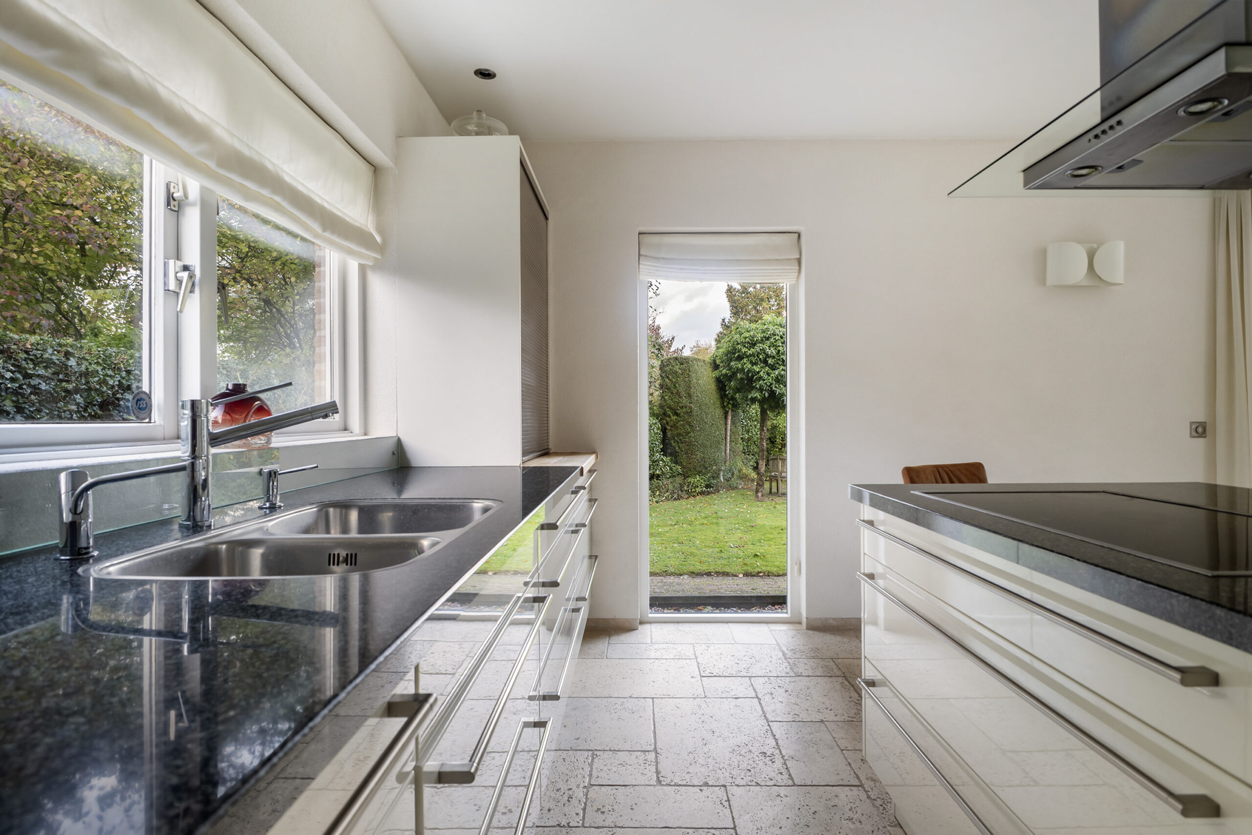 Vanuit de keuken is er een doorloop naar de bijkeuken voorzien van een keukenblok, de wasmachineaansluiting en een buitendeur.