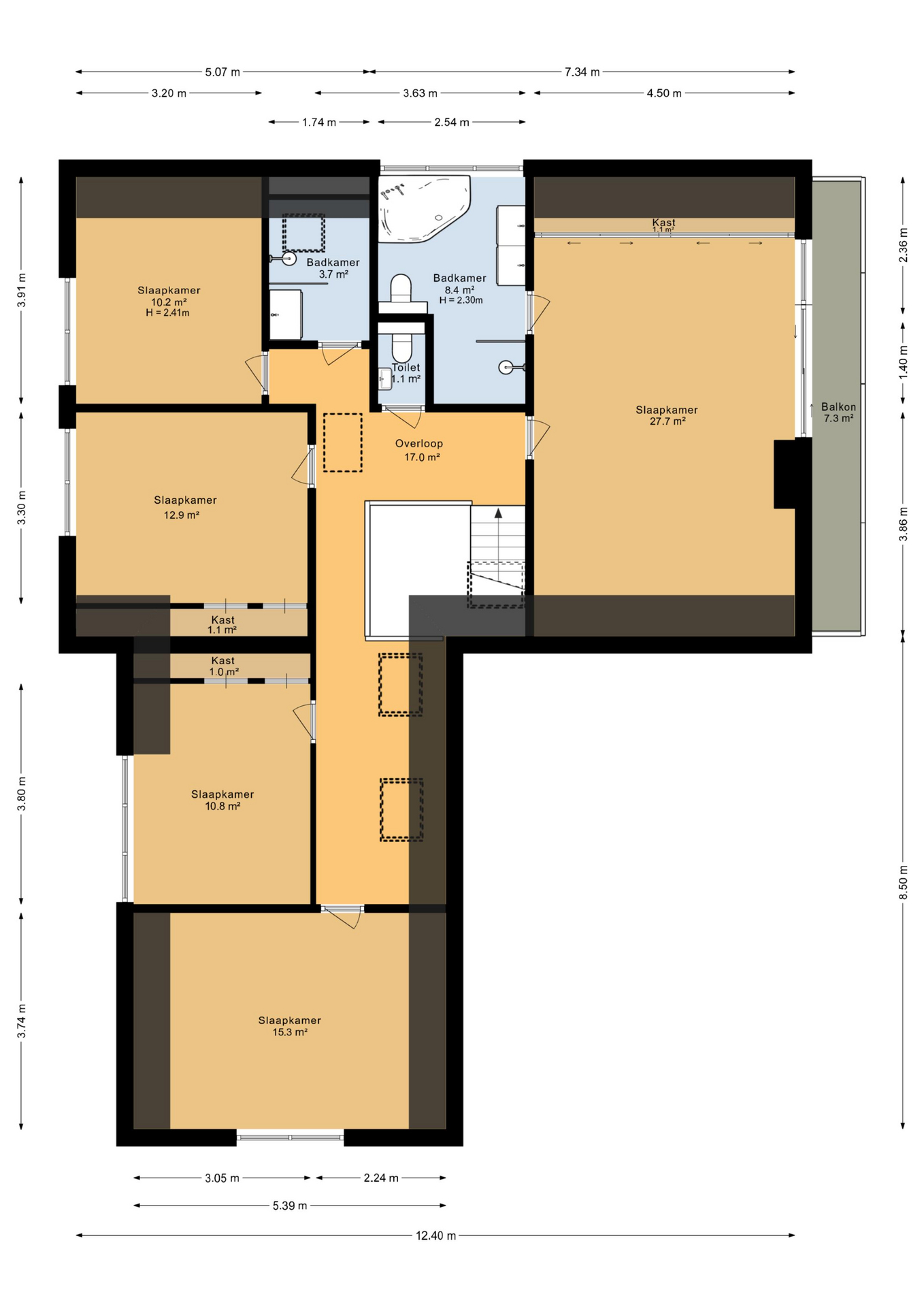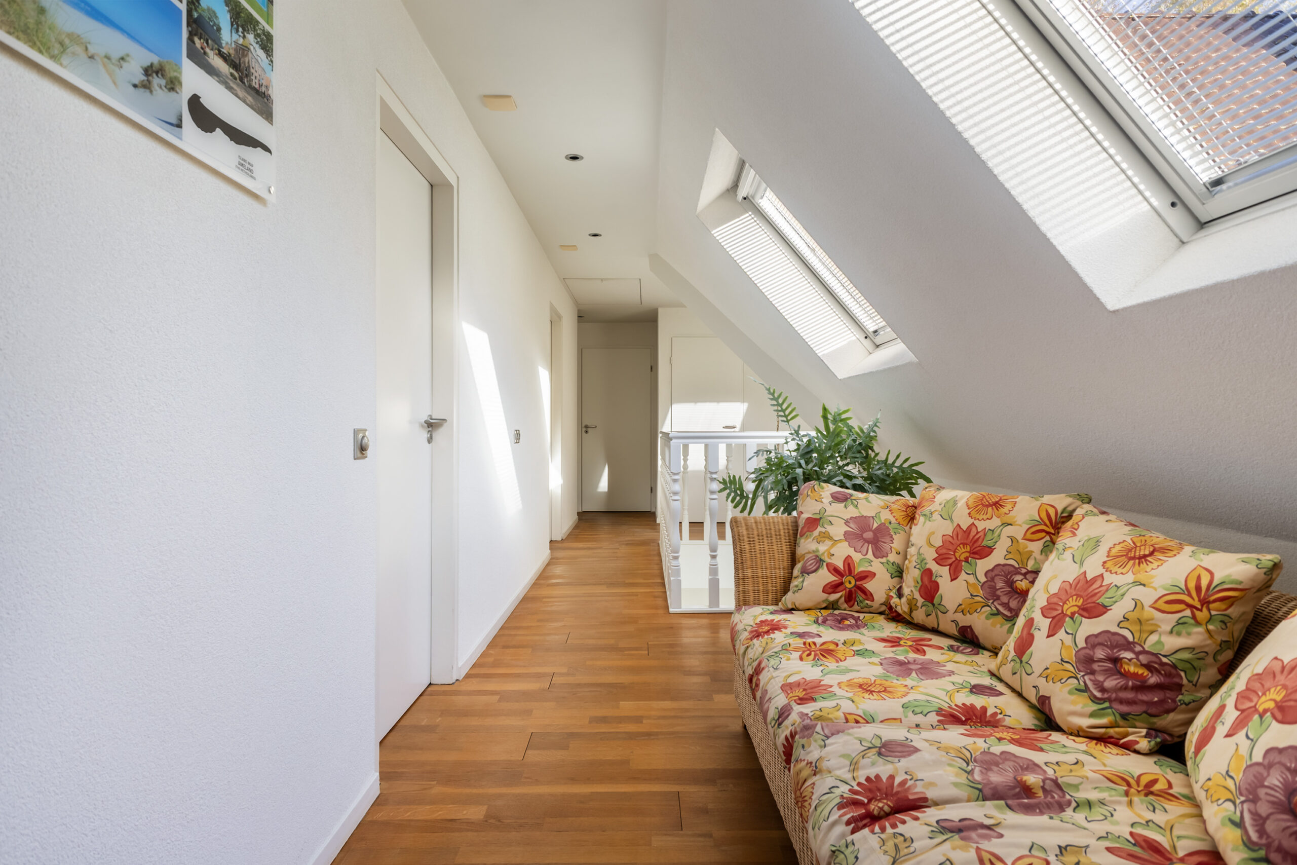 De zéér royale overloop geeft toegang tot de 5 ruime slaapkamers, een apart toilet en de twee badkamers.
