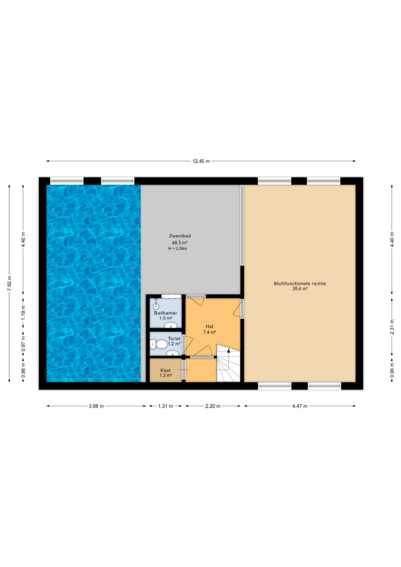 Verder is er een technische ruimte met de apparatuur voor het zwembad.