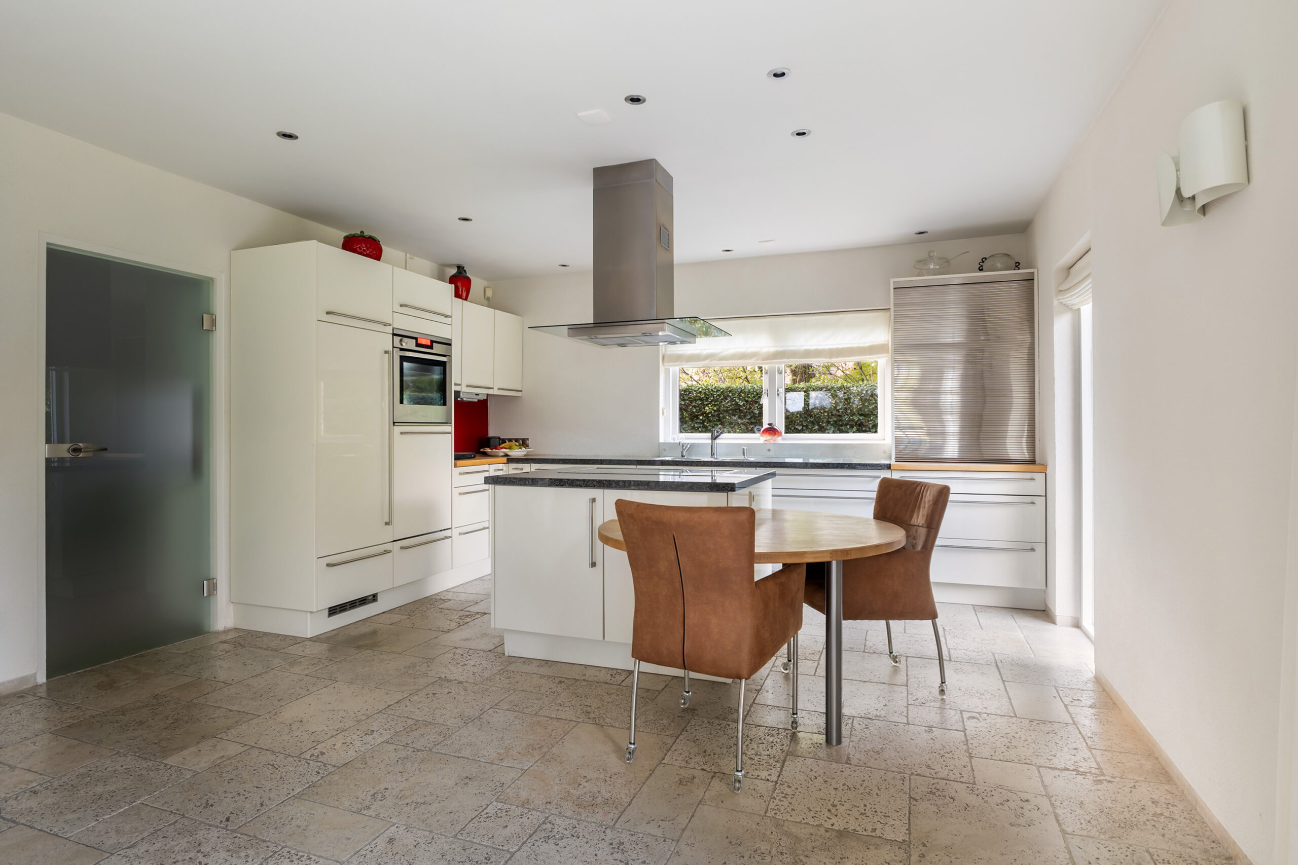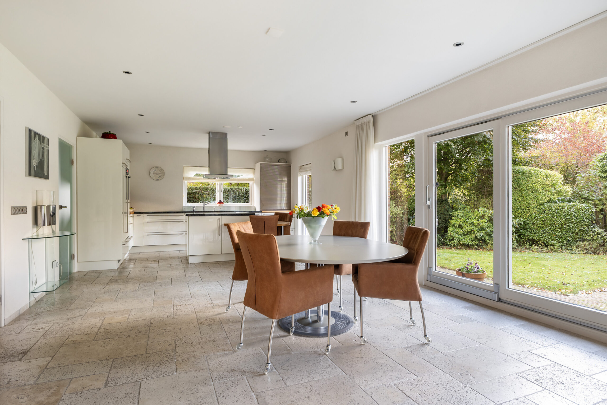 De ruime en lichte living is maar liefst 59 m² groot en heeft veel natuurlijk lichtinval en aan twee zijden een schuifpui naar de achtertuin. De open keuken beschikt over een kookeiland, veel berg- en werkruimte en een apparatuurwand met diverse inbouwapparatuur.