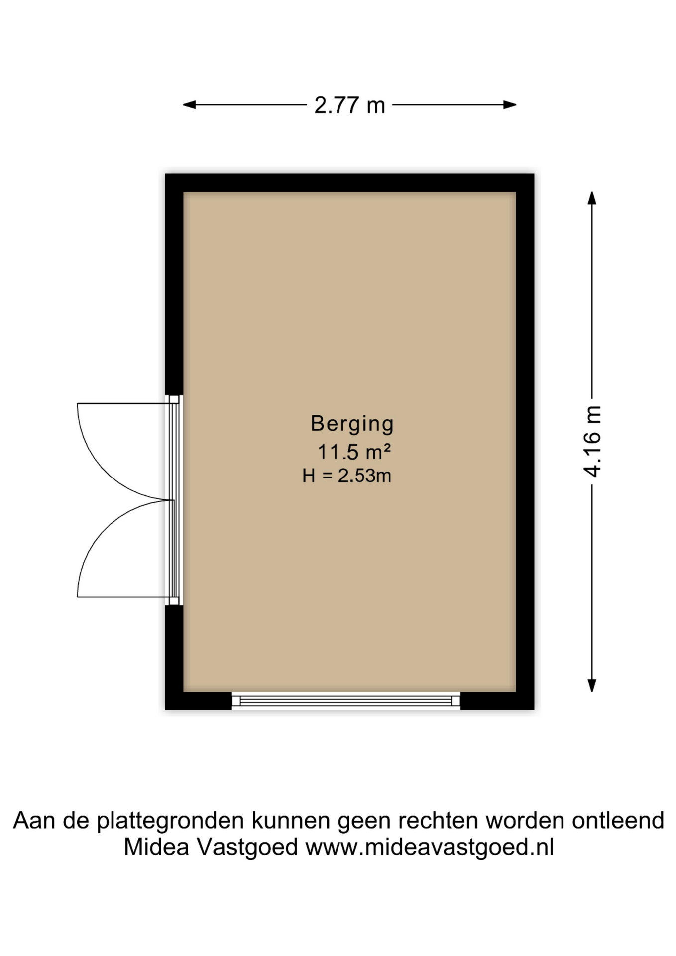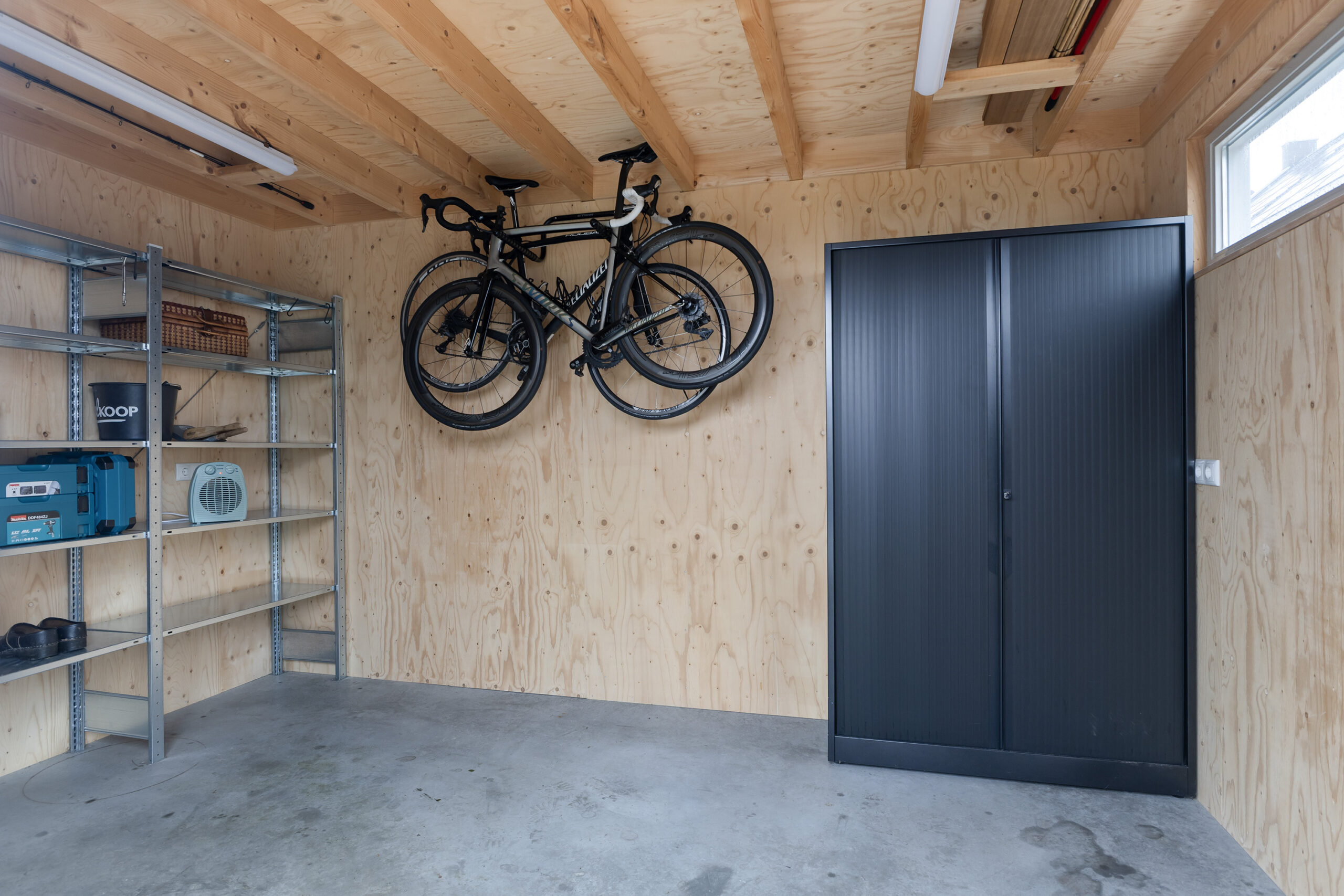 – vrijstaande volledig geïsoleerde houten berging voorzien van elektra en met openslaande deuren