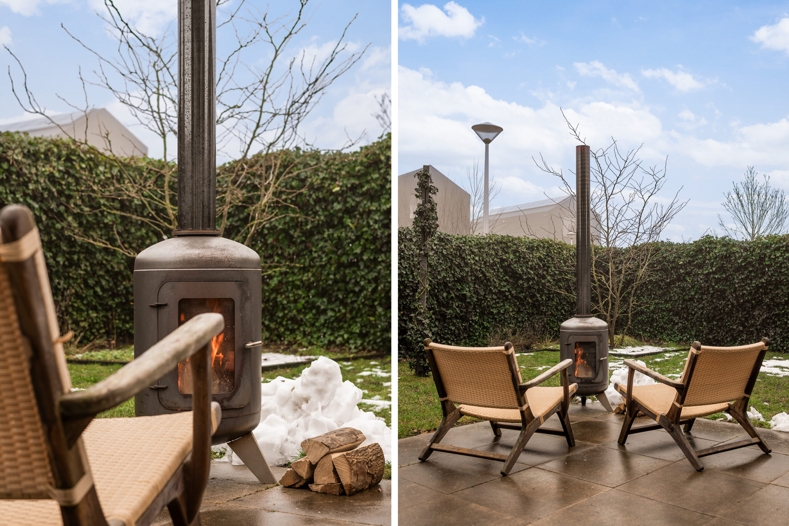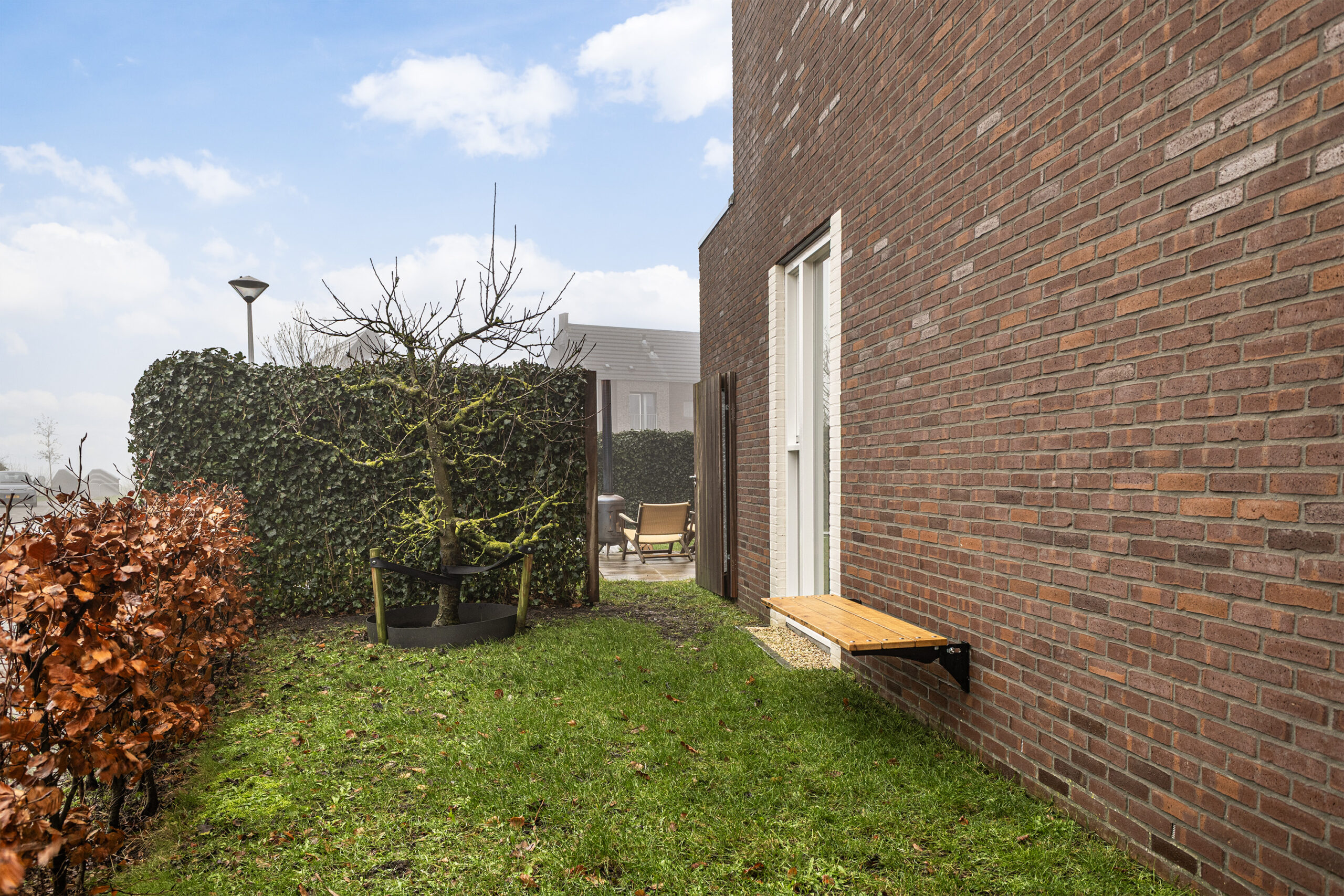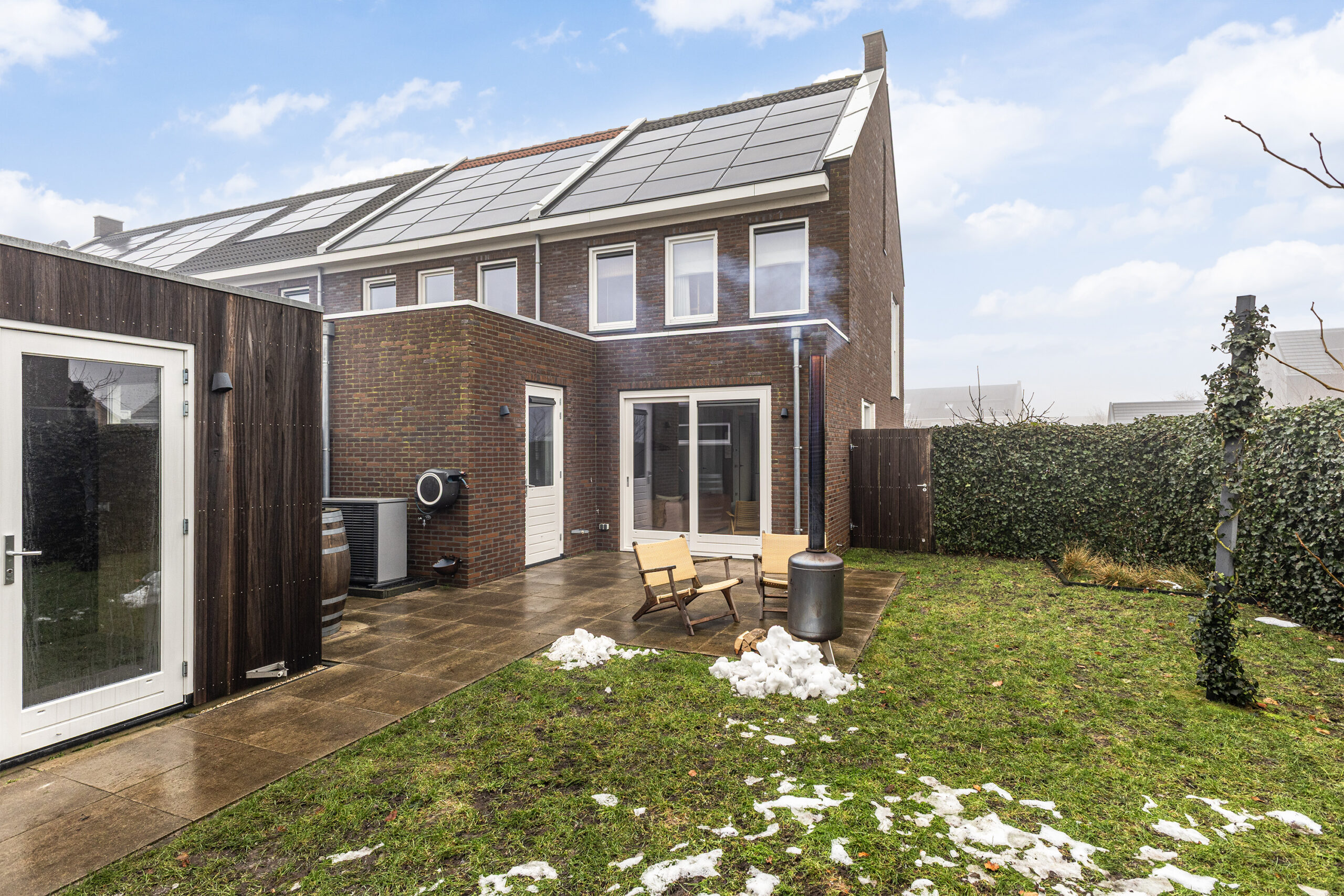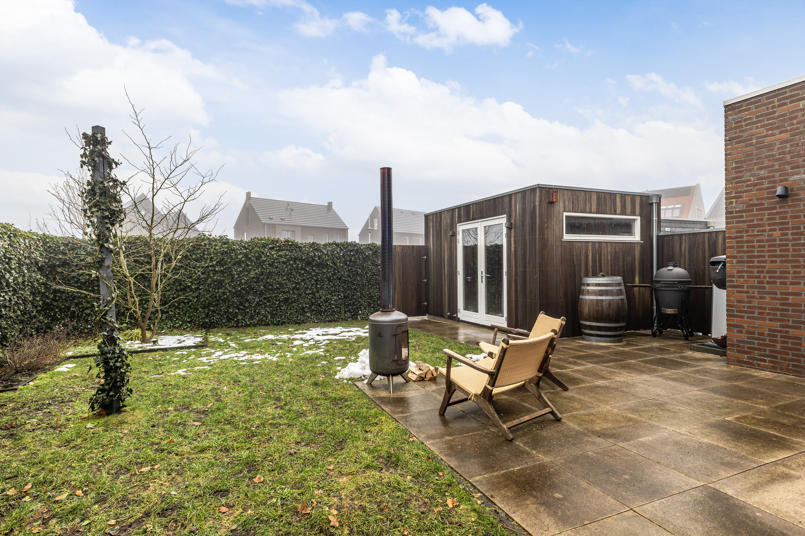 – brede achtertuin en door de groene omheining heerlijk privé en geen inkijk
