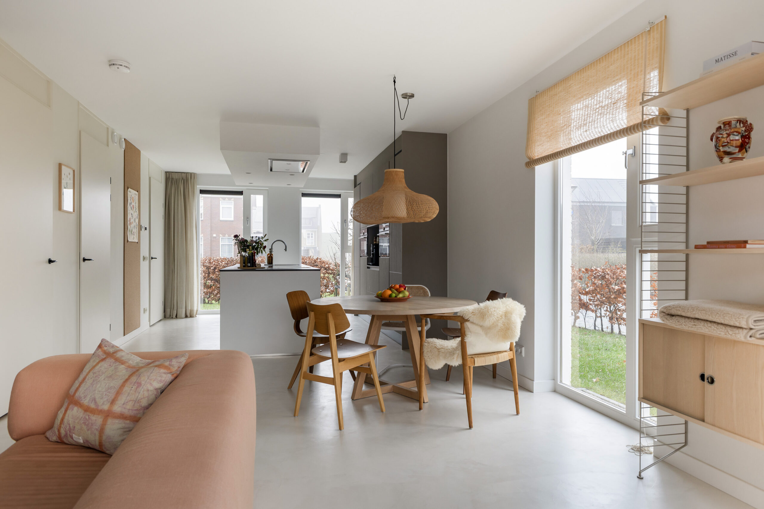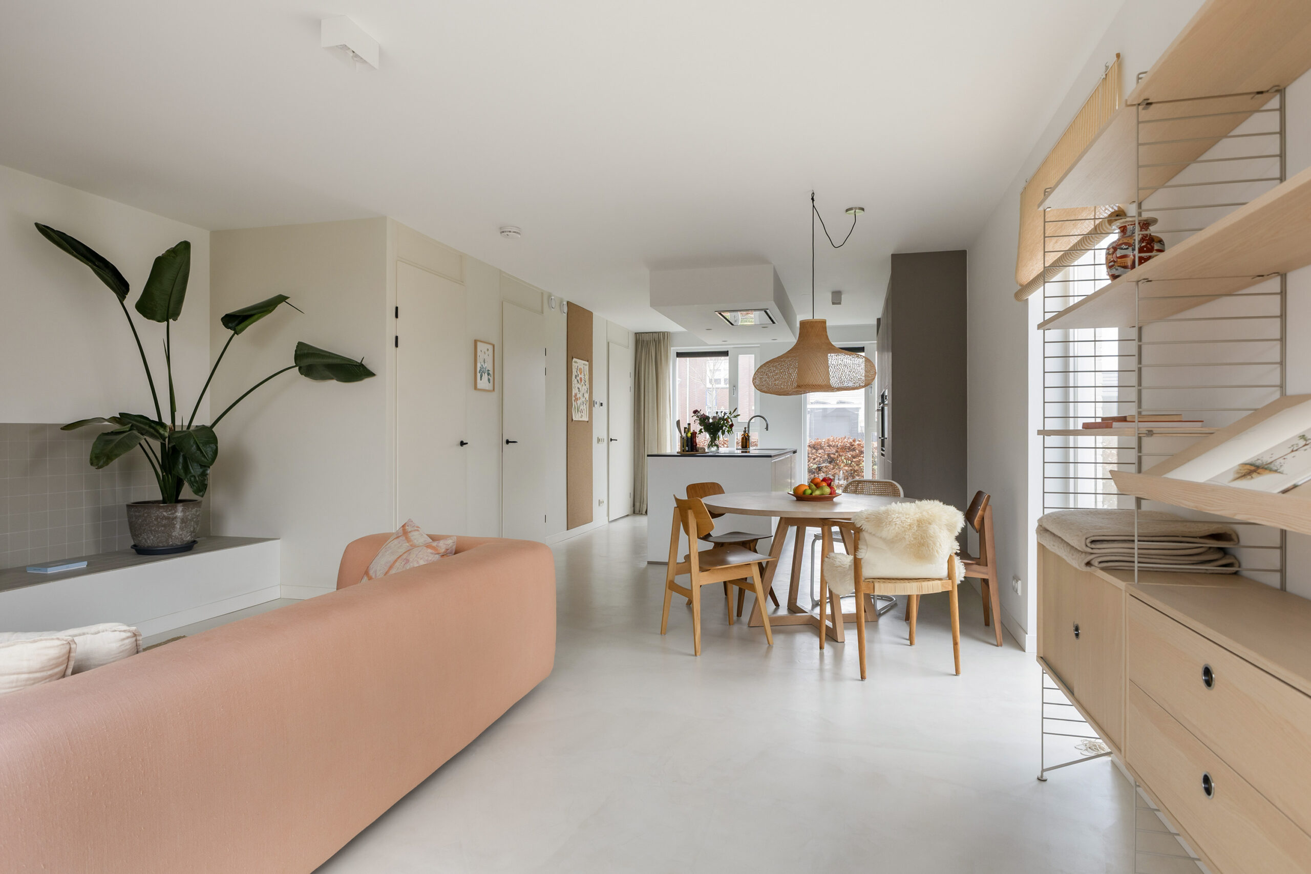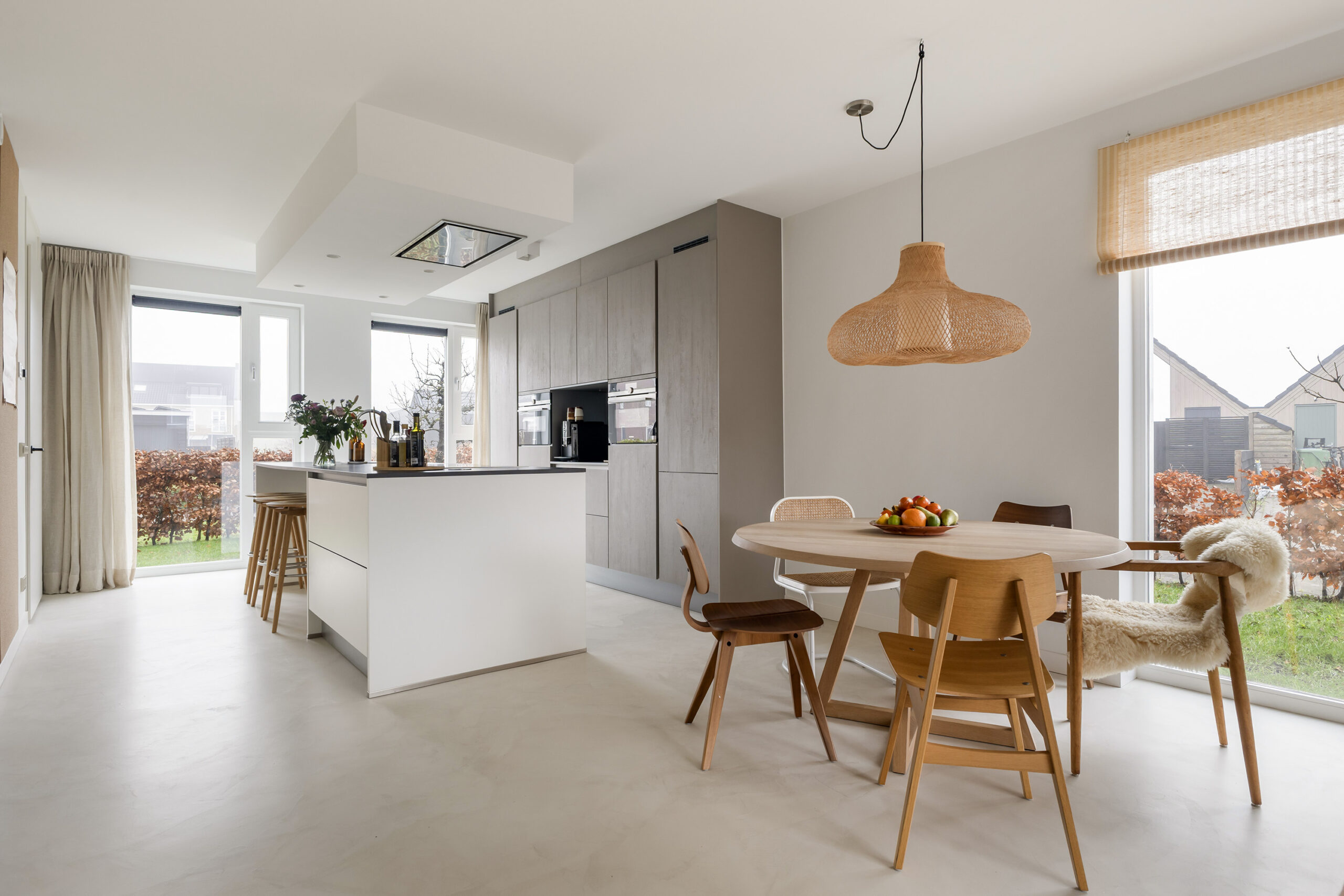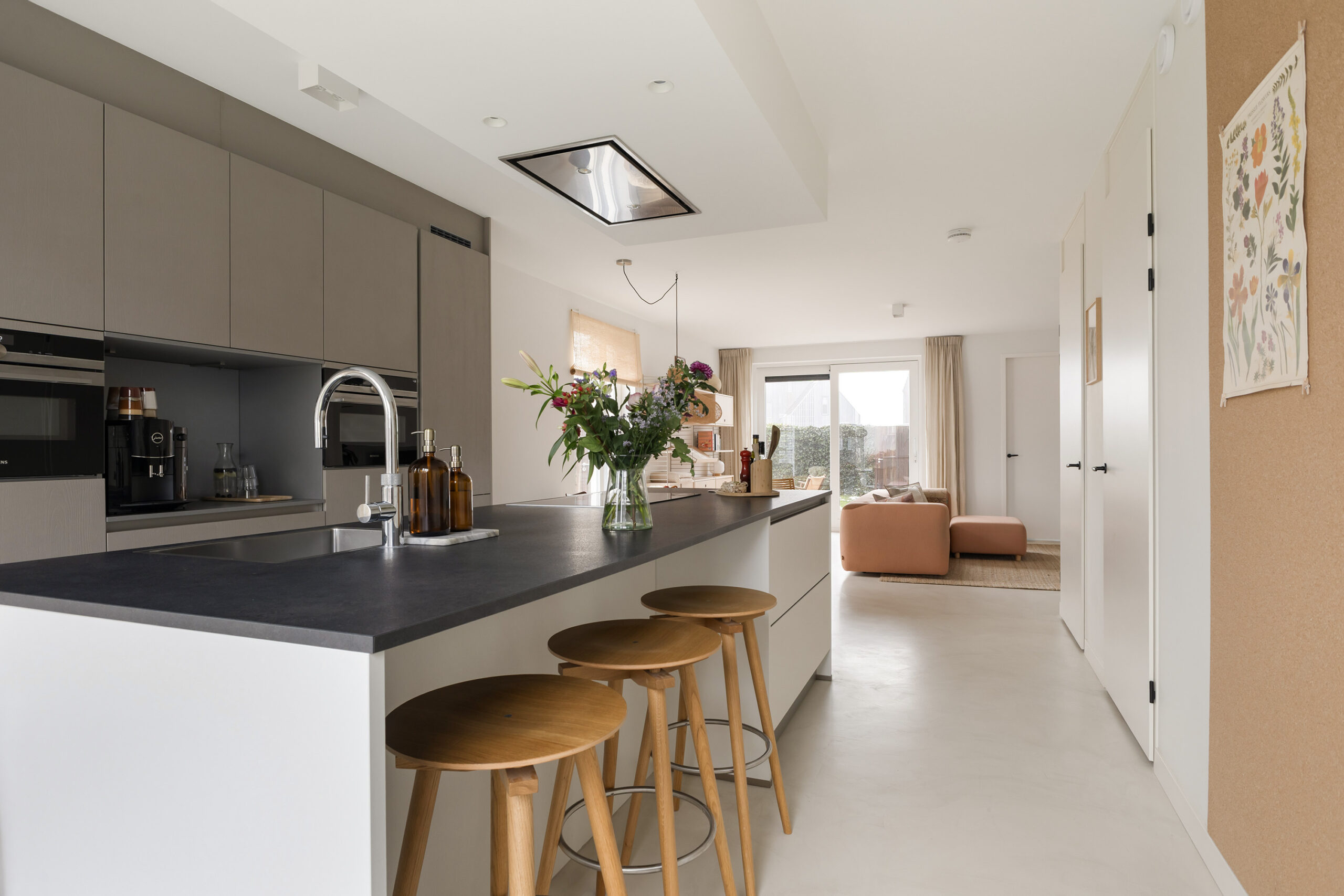 – ruime en lichte woonkamer voorzien van een gietvloer met vloerverwarming en een schuifpui naar de achtertuin