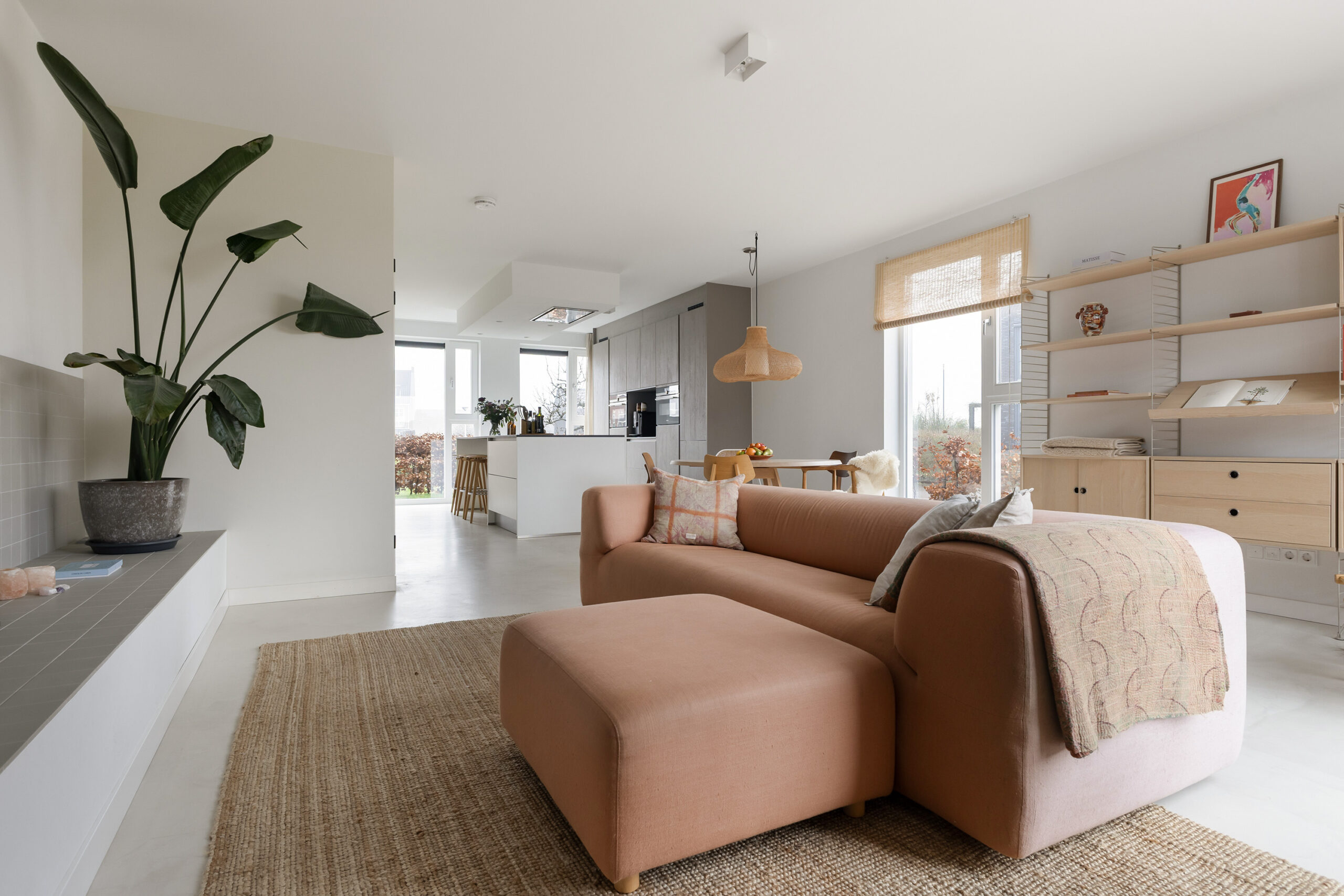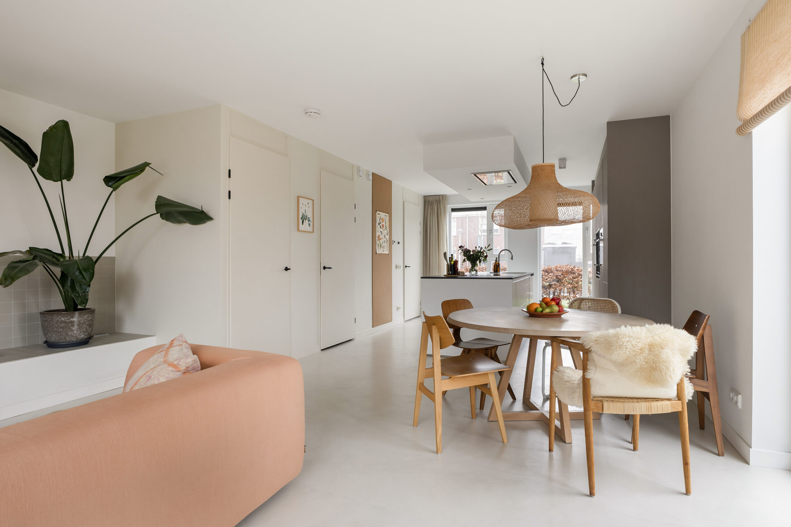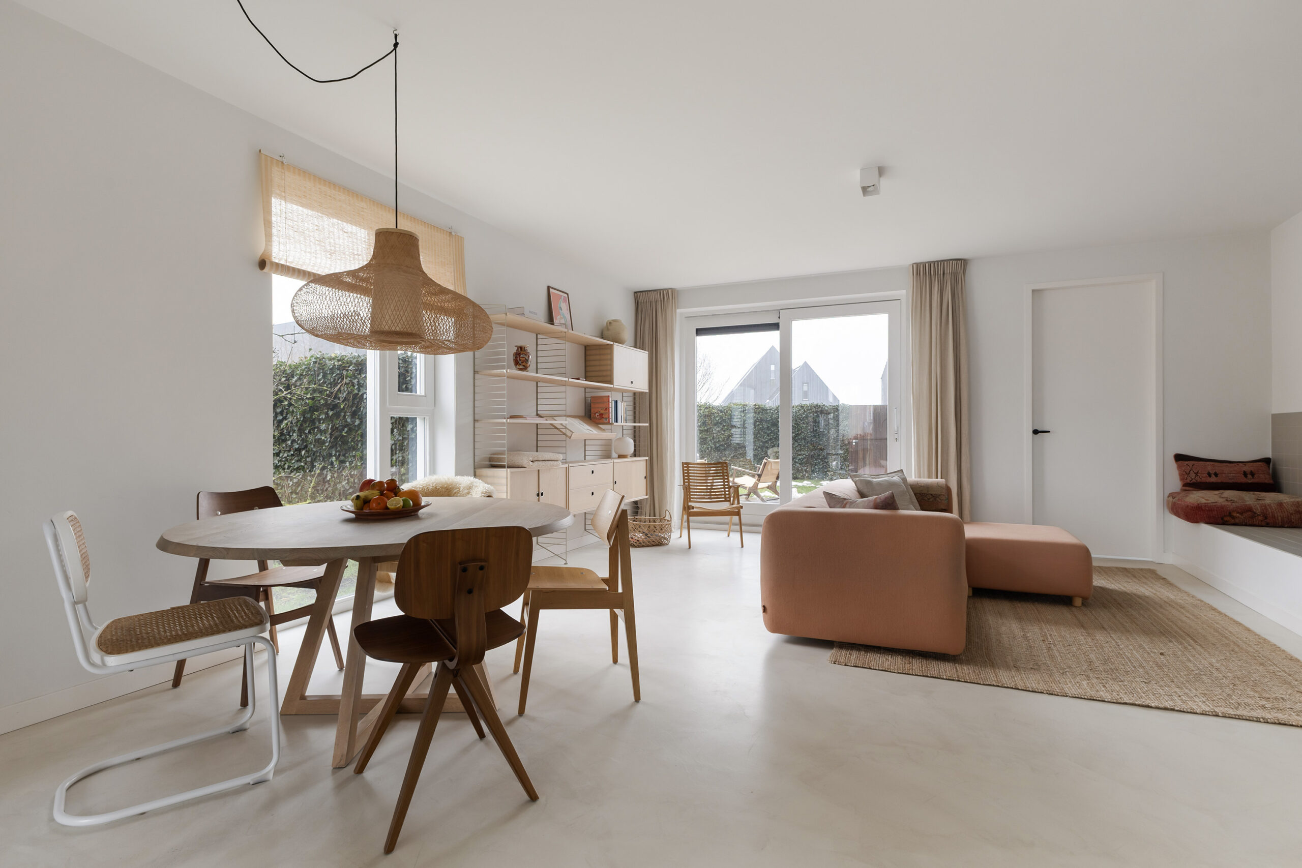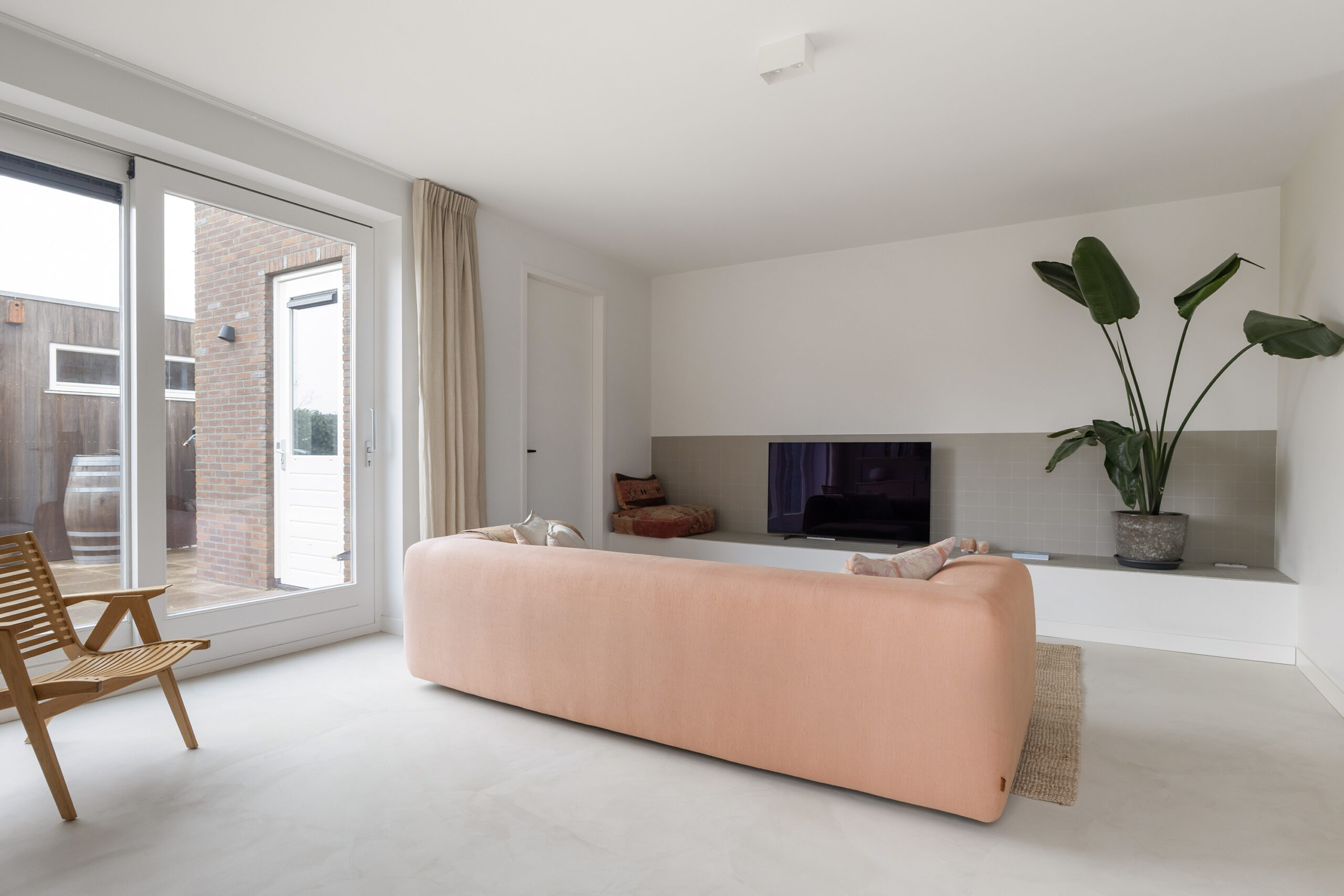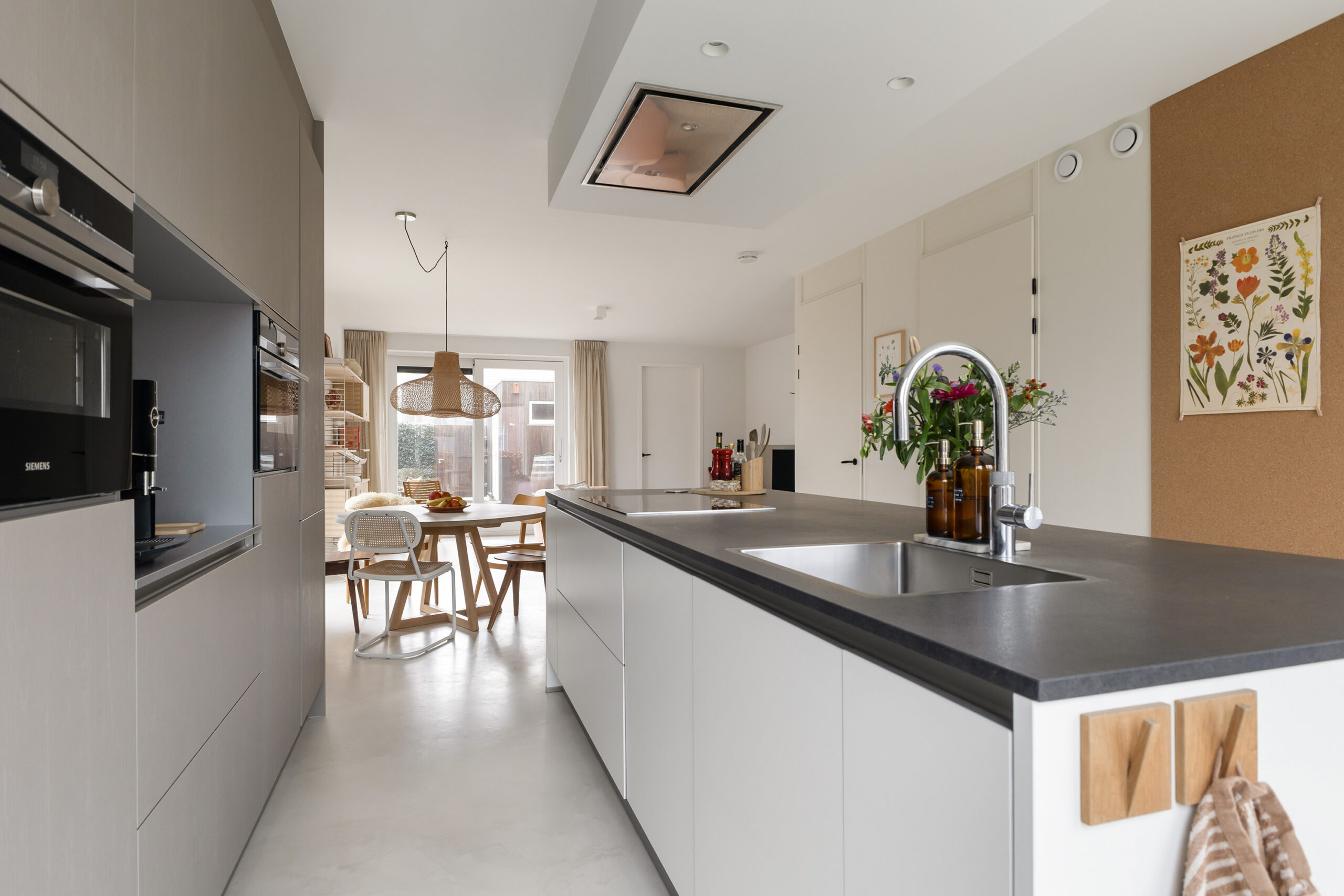 – ruime en lichte woonkamer voorzien van een gietvloer met vloerverwarming en een schuifpui naar de achtertuin