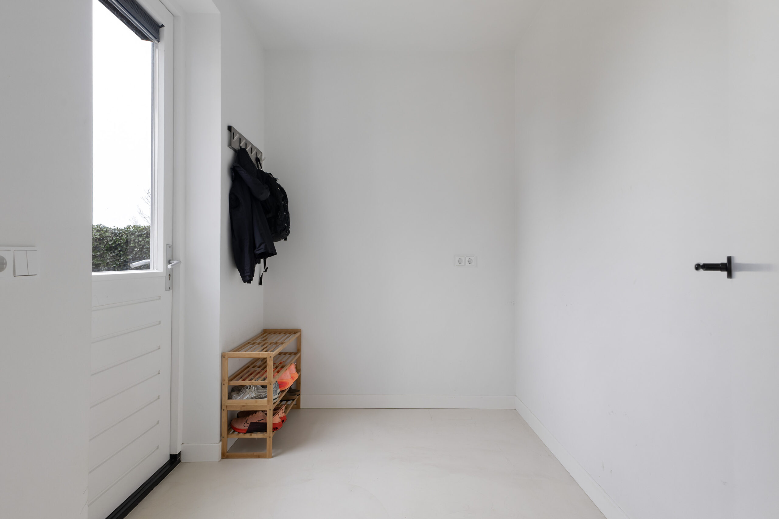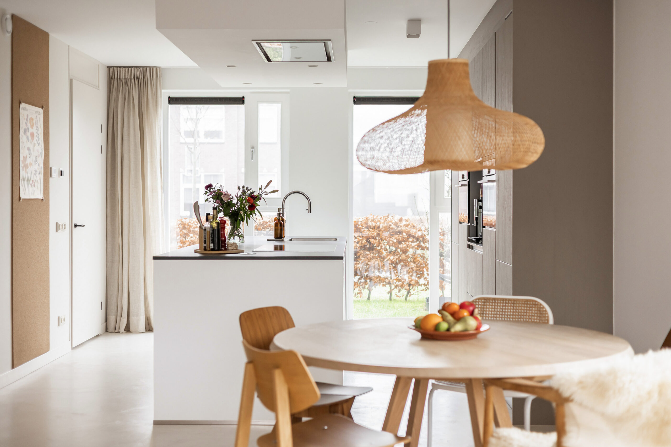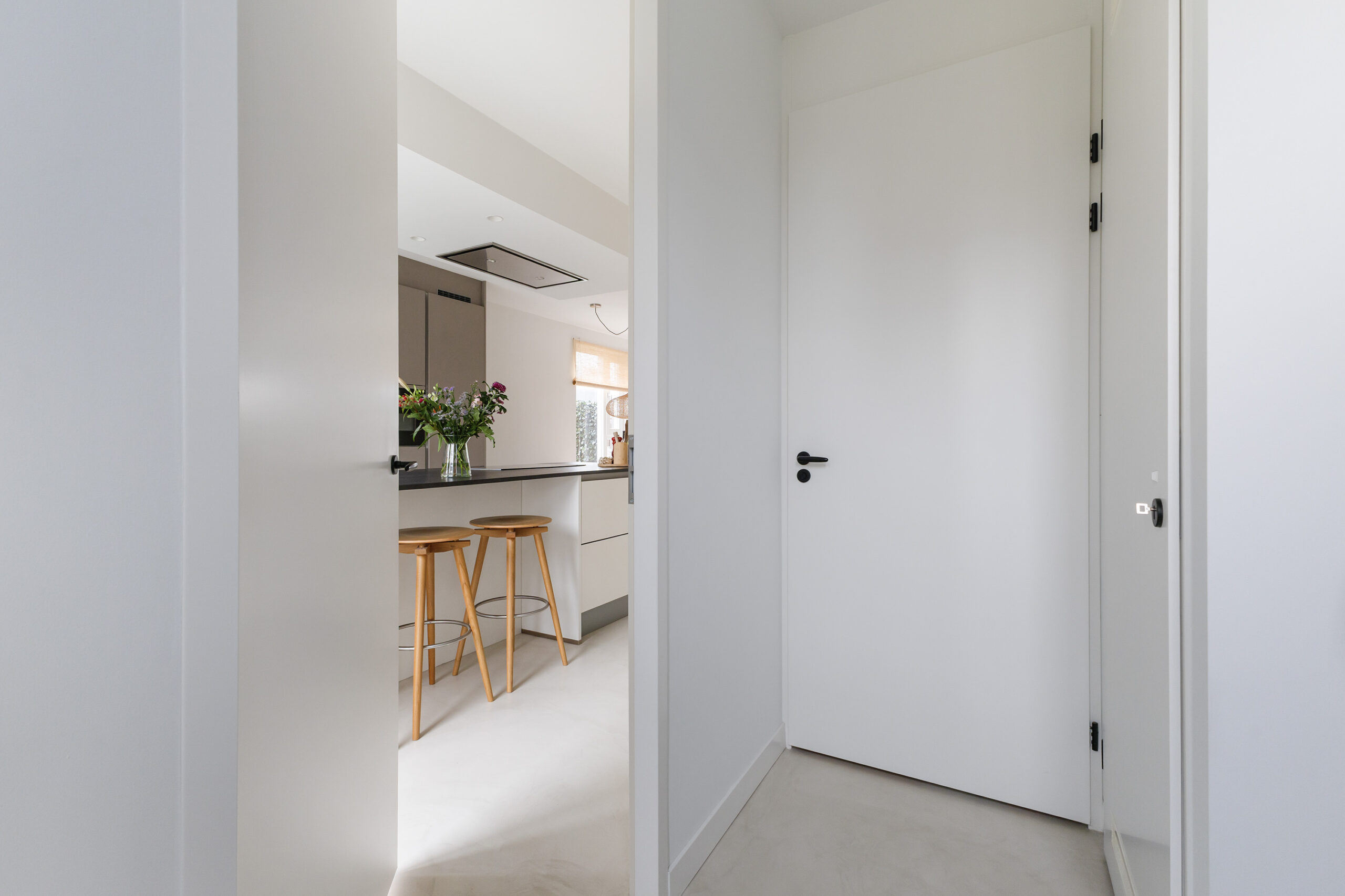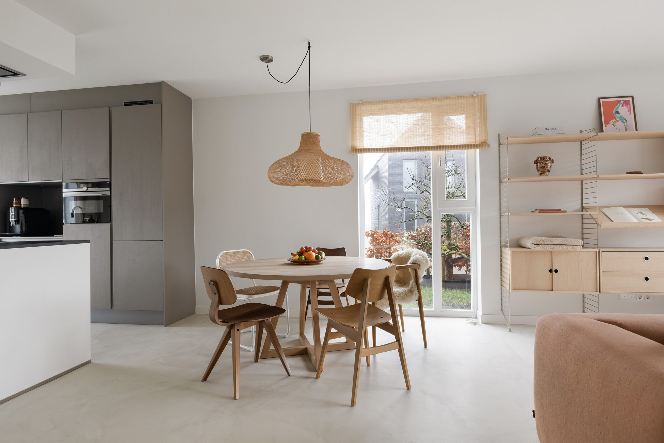 – ruime en lichte woonkamer voorzien van een gietvloer met vloerverwarming en een schuifpui naar de achtertuin