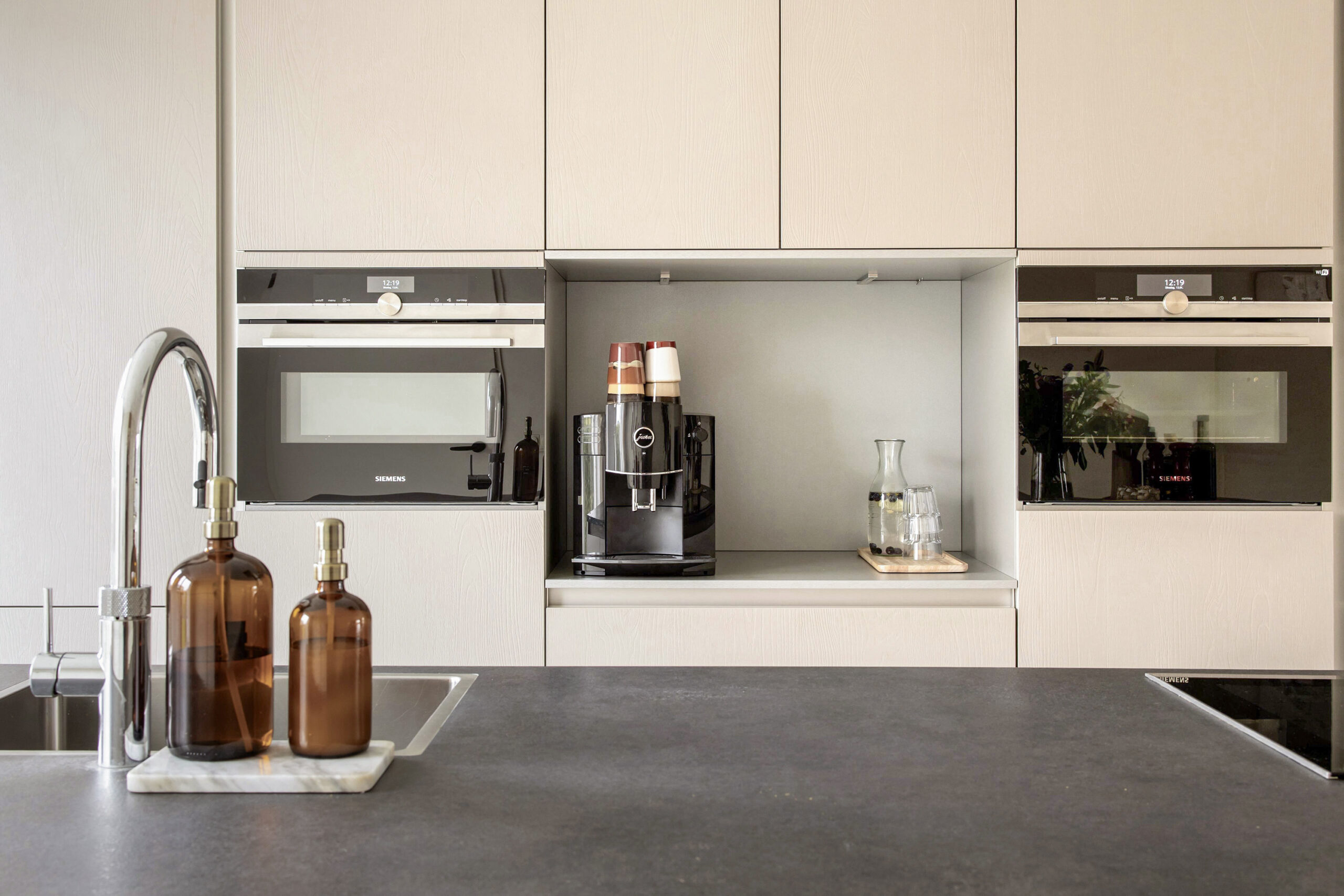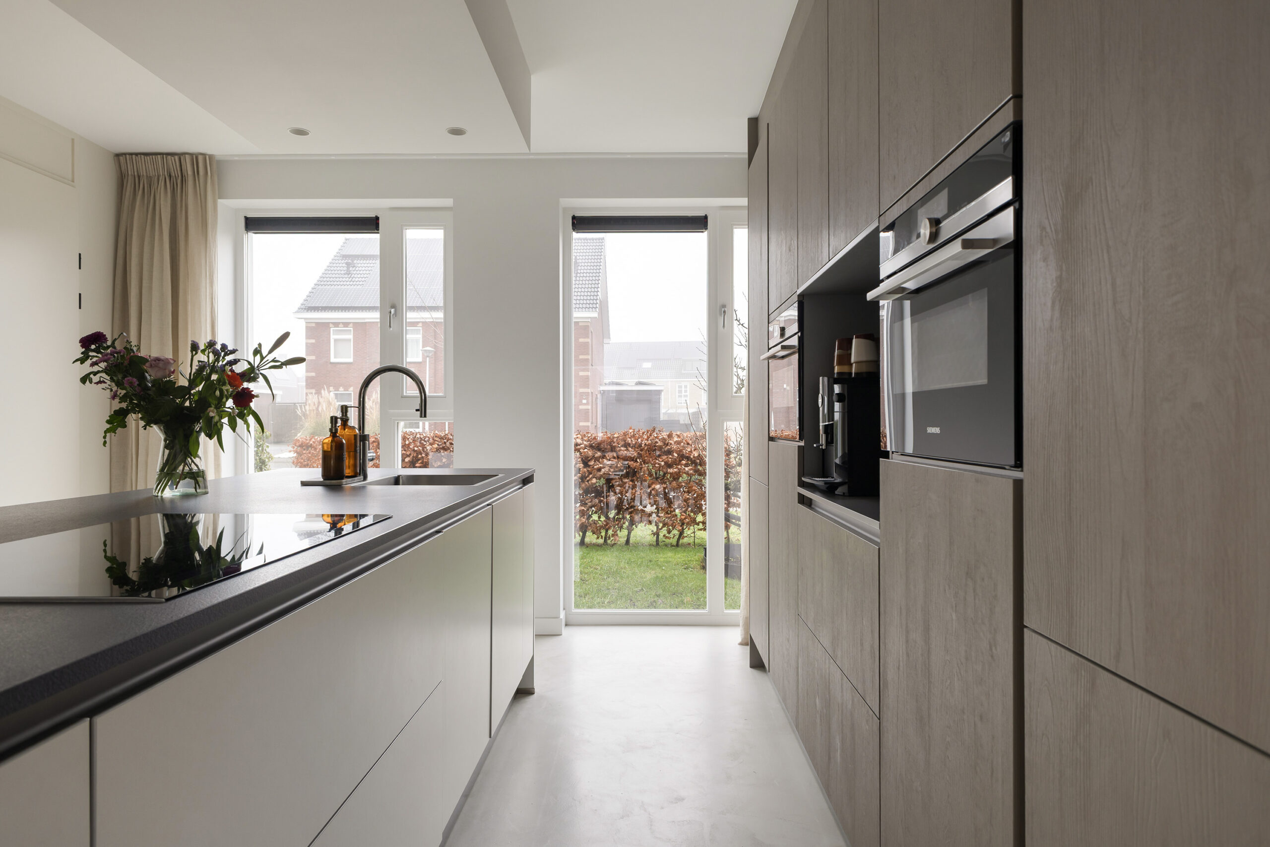 – moderne open keuken met een kook- en spoeleiland en een apparatuur- en kastenwand