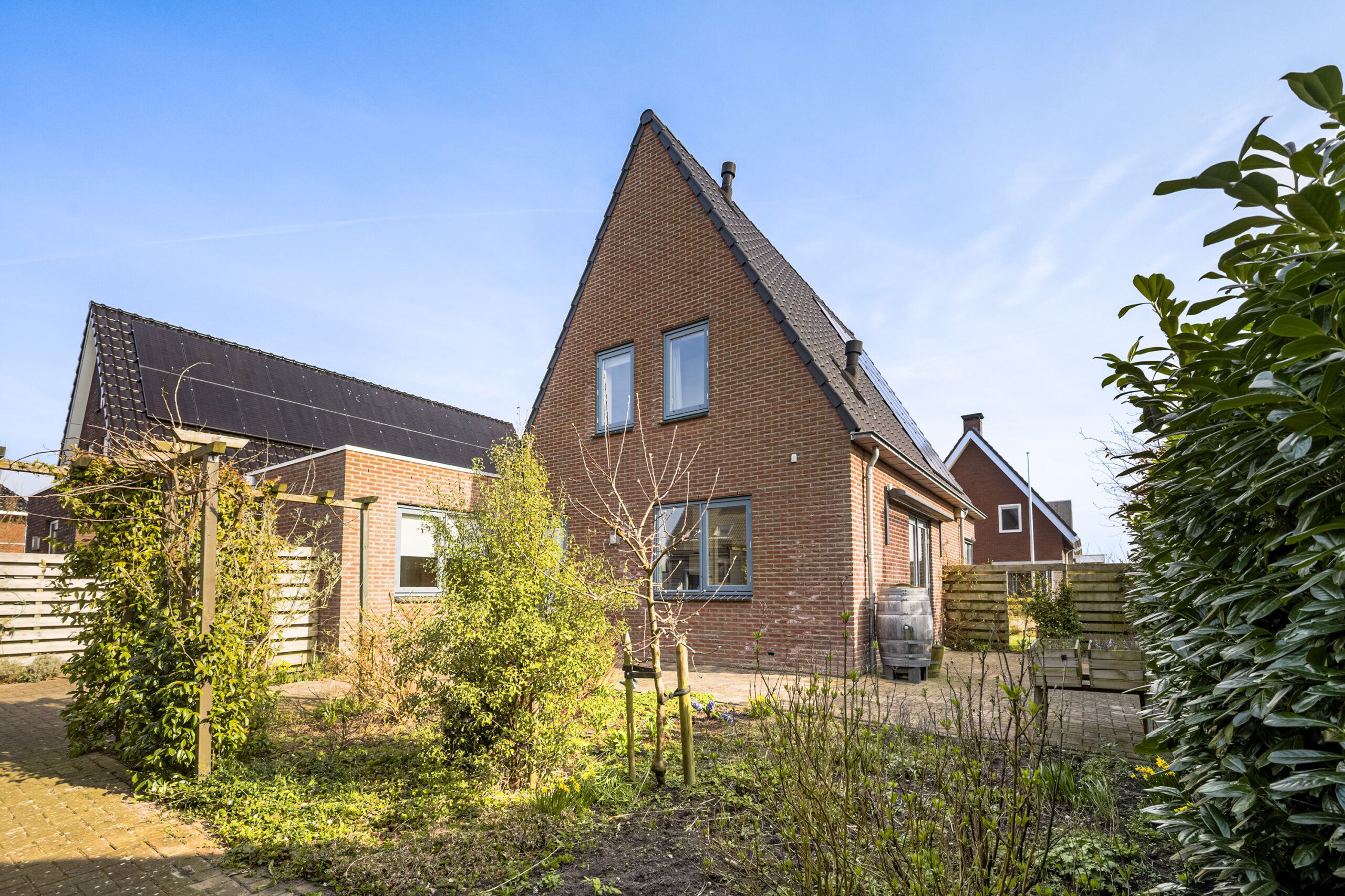 De tuin biedt volop ruimte om van de zon te genieten en beschikt over een ruime vrijstaande houten berging met aangrenzende overkapping. Op eigen terrein is parkeergelegenheid voor twee auto’s.