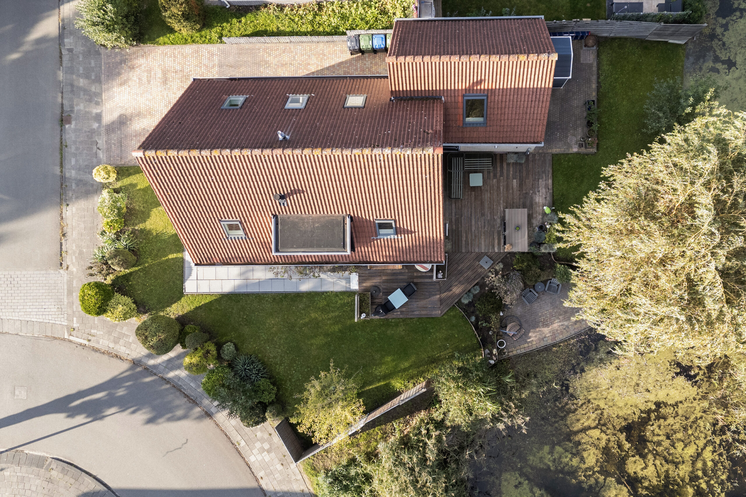 De zonnige achtertuin is met zorg aangelegd, gelegen op het zuidoosten en grenst aan een vijverpartij. Er zijn meerdere terrassen, waaronder een fraai vlonderterras aan de achter- en zijgevel en een verlaagd terras bij het water, waardoor er de hele dag keuze is tussen zon- of schaduwplekken. Door de schutting en begroeiing is er bovendien volop privacy.