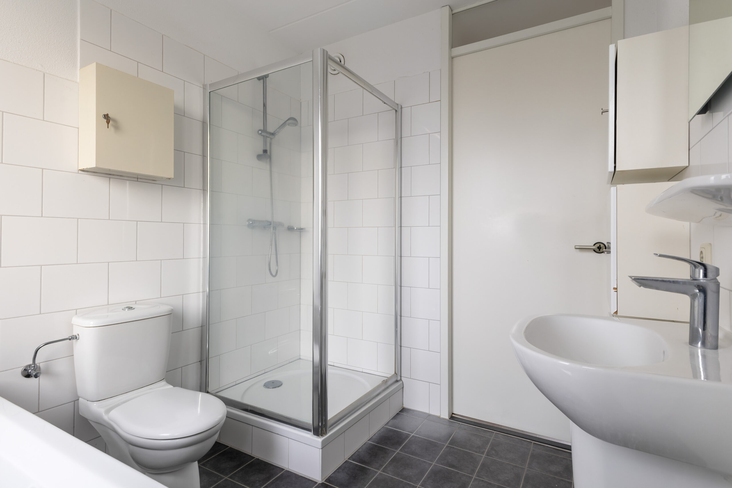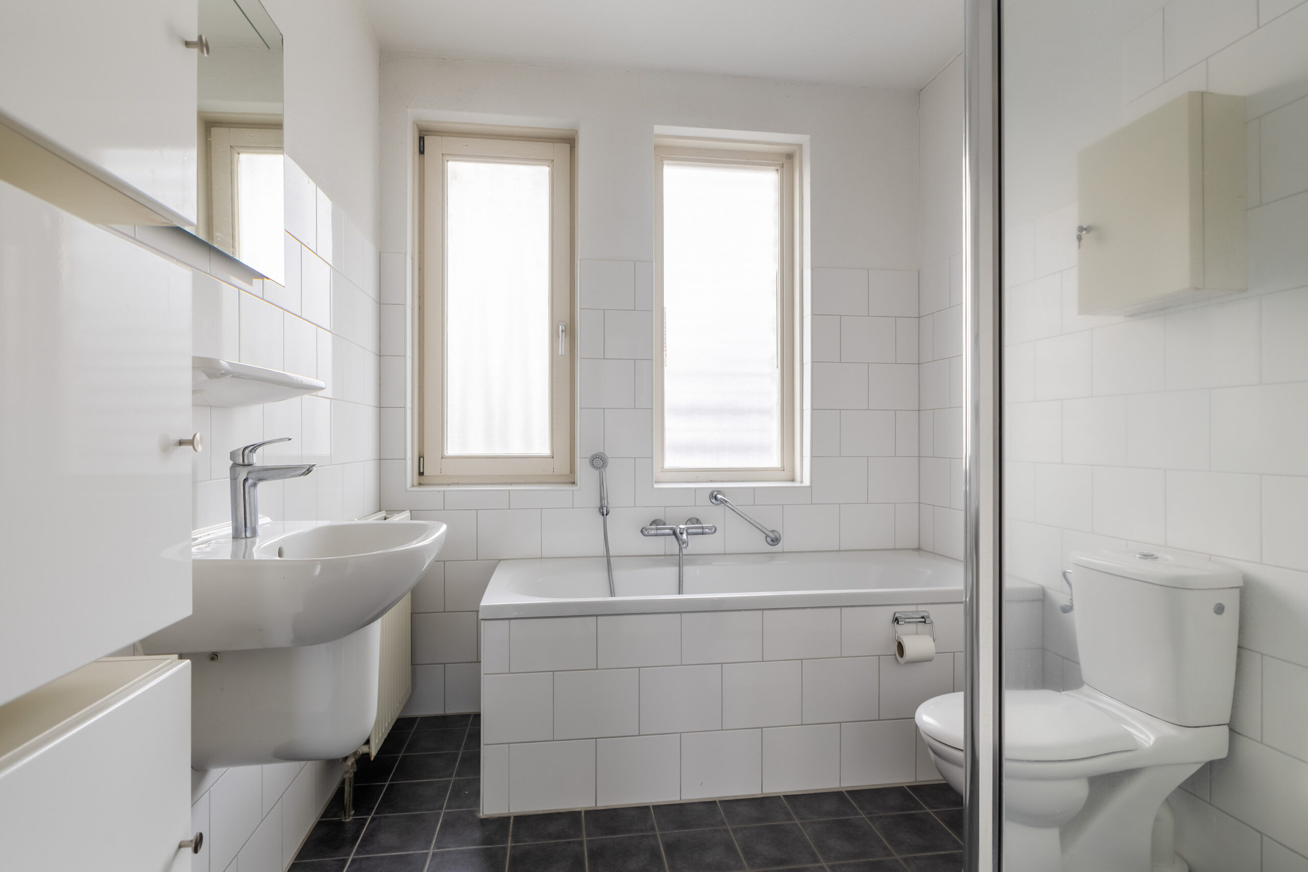 – volledig betegelde badkamer met ligbad, douche, 2e toilet en wastafel