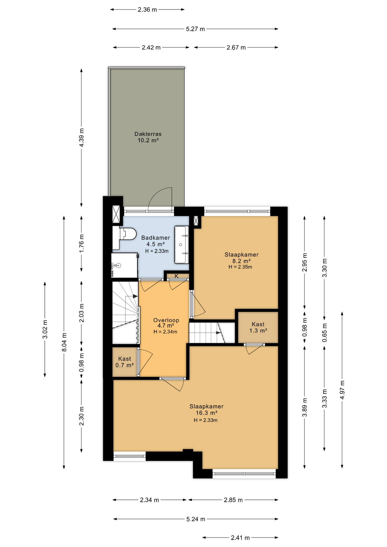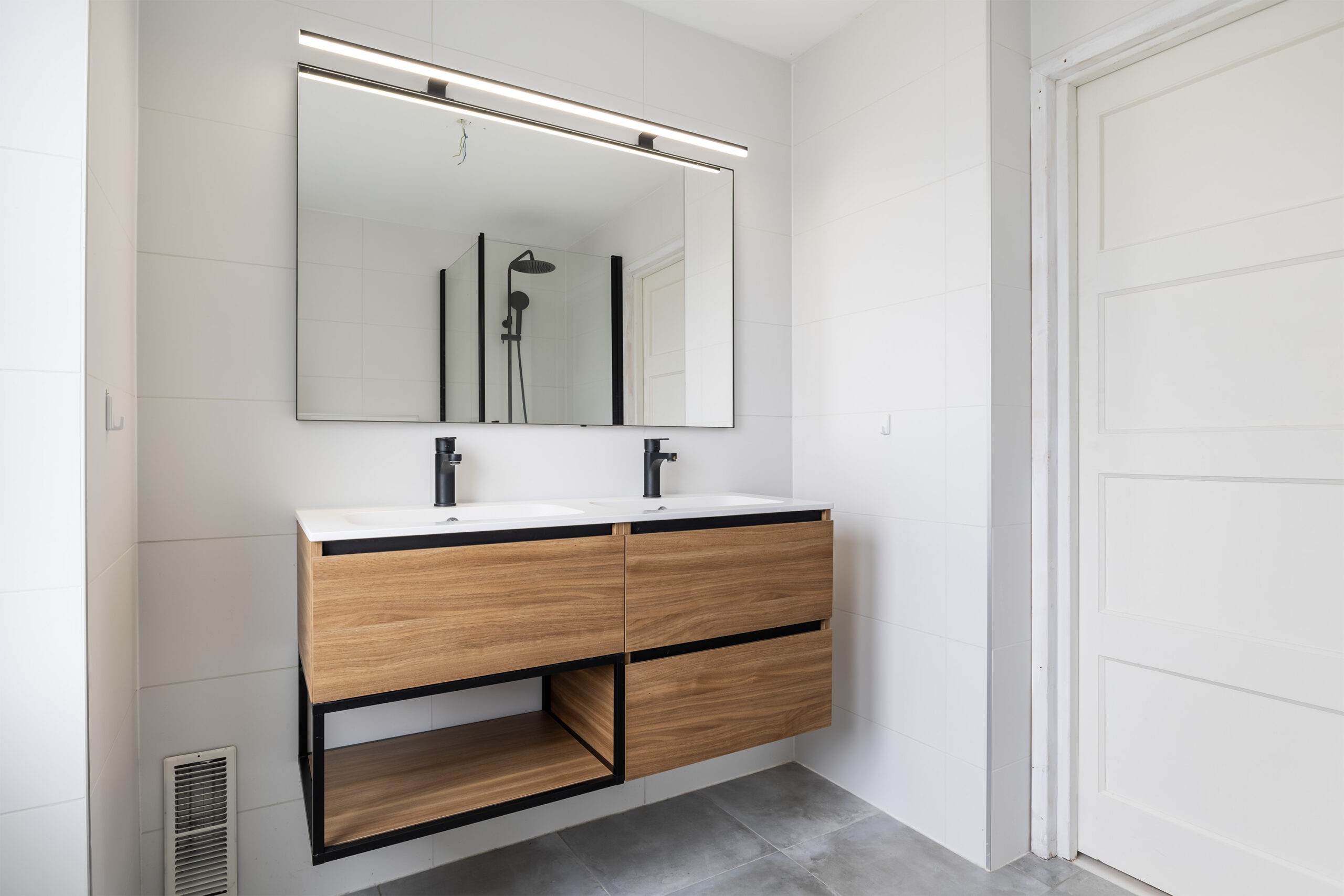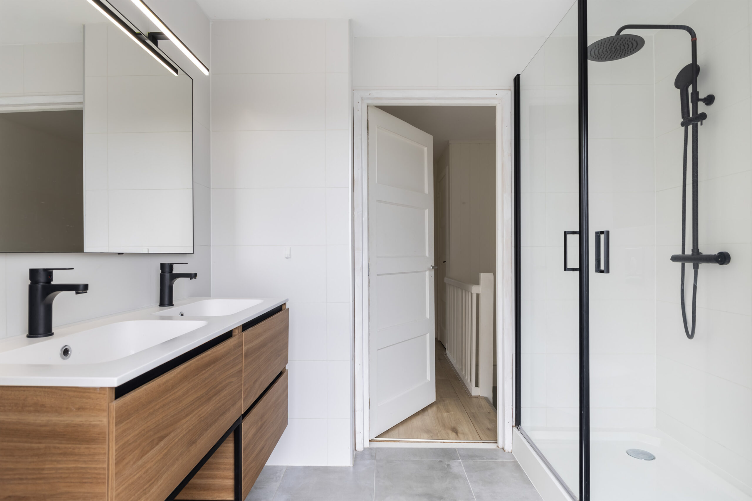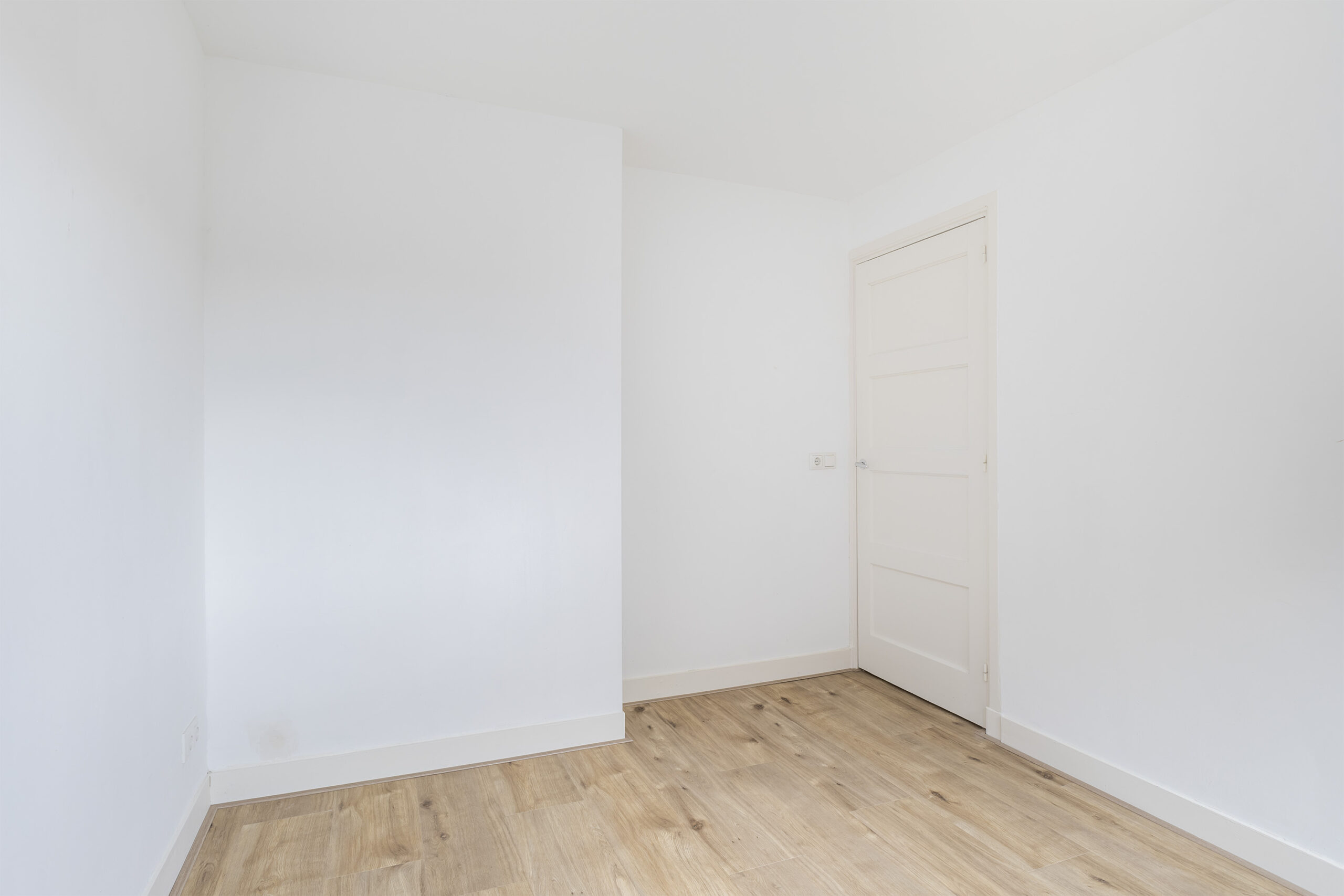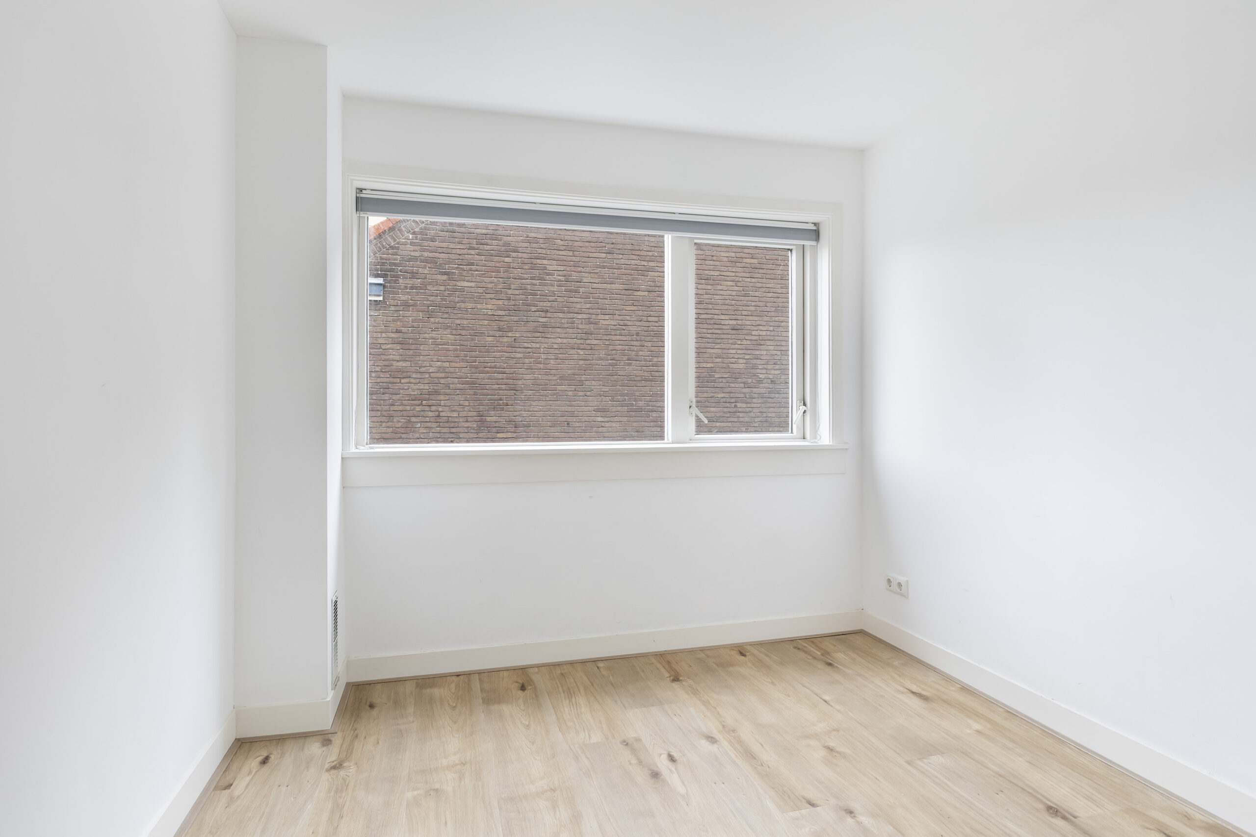 Vanaf de overloop met inbouwkast zijn twee slaapkamers en de badkamer toegankelijk. Aan de voorzijde bevindt zich een ruime slaapkamer van circa 16 m² (voorheen twee slaapkamers) met inbouwkast. Aan de achterzijde ligt een compactere slaapkamer van circa 8 m². De badkamer, eveneens aan de achterzijde, is ingericht met een douche, dubbele wastafel met wastafelmeubel en een toilet. Vanuit de badkamer is het dakterras van circa 10 m² op het noorden bereikbaar.