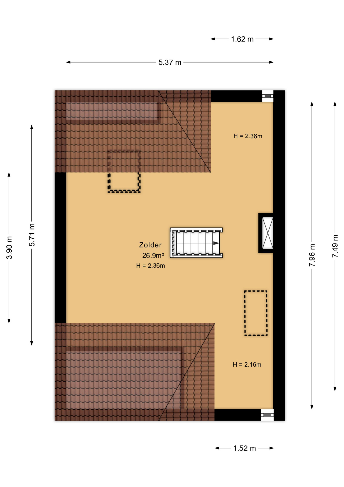 Een vaste trap leidt naar de zolderverdieping. Deze ruimte is vrij in te delen en biedt mogelijkheden voor het realiseren van een extra derde slaapkamer.