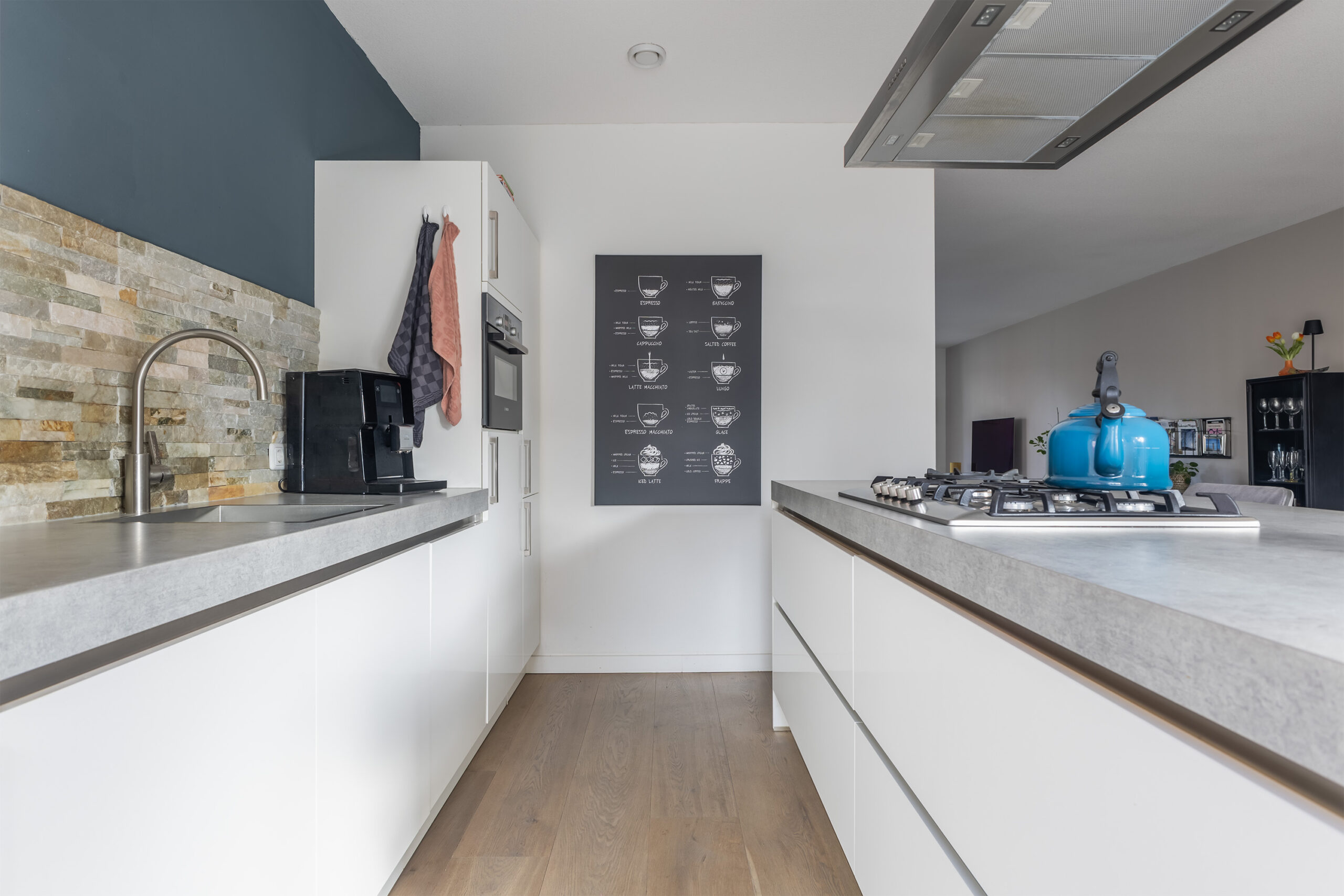 – moderne open keuken voorzien van een kookeiland en diverse inbouwapparatuur