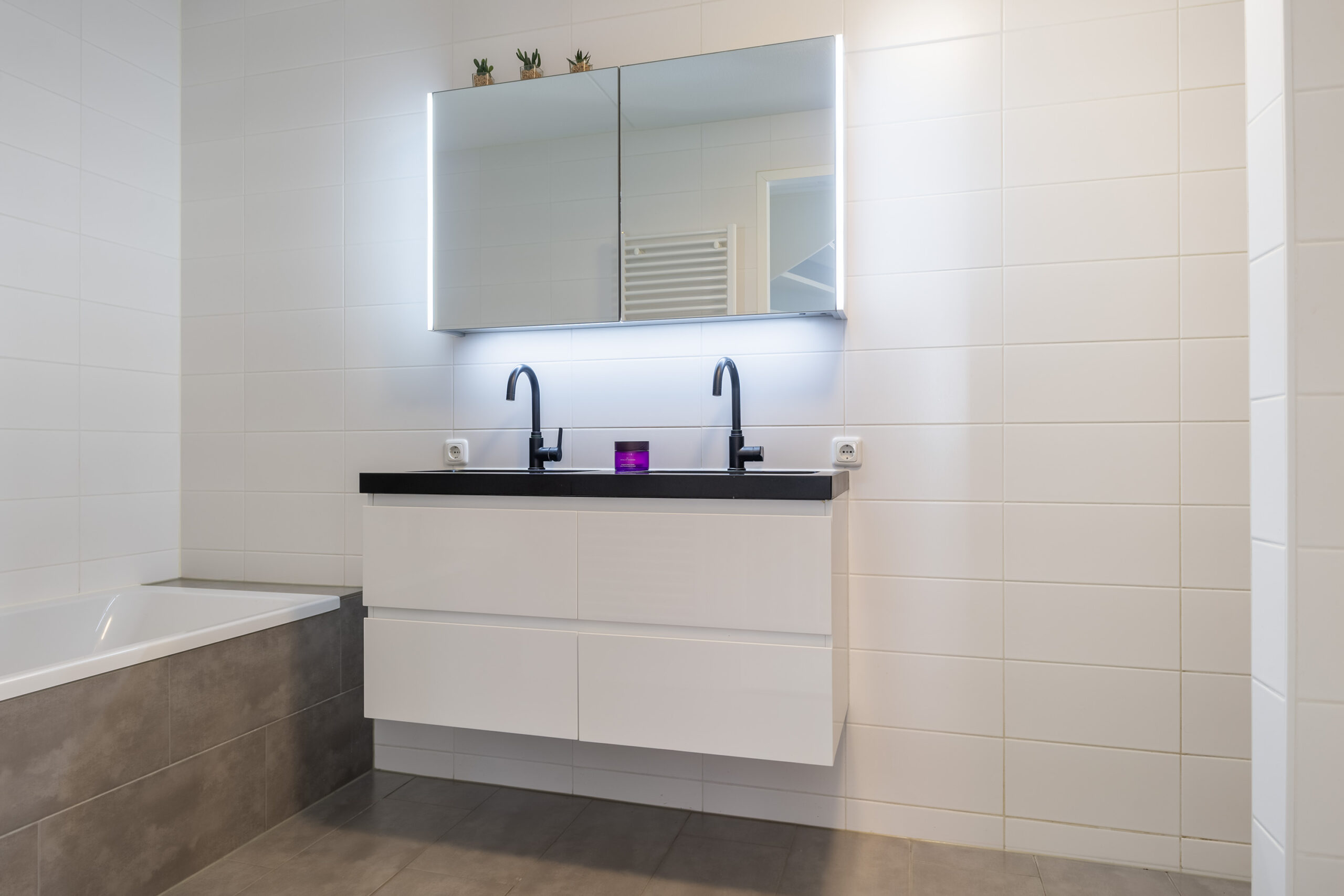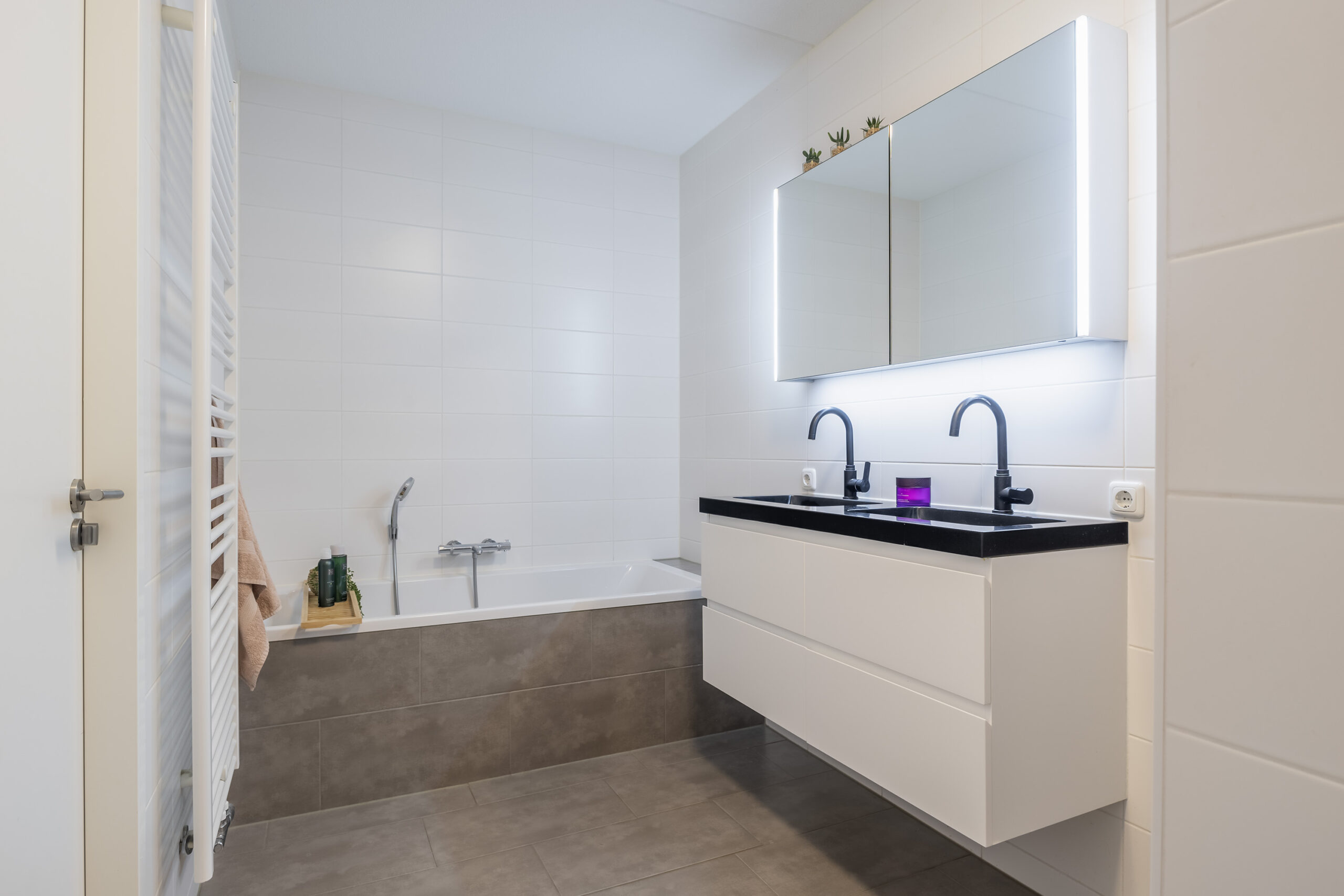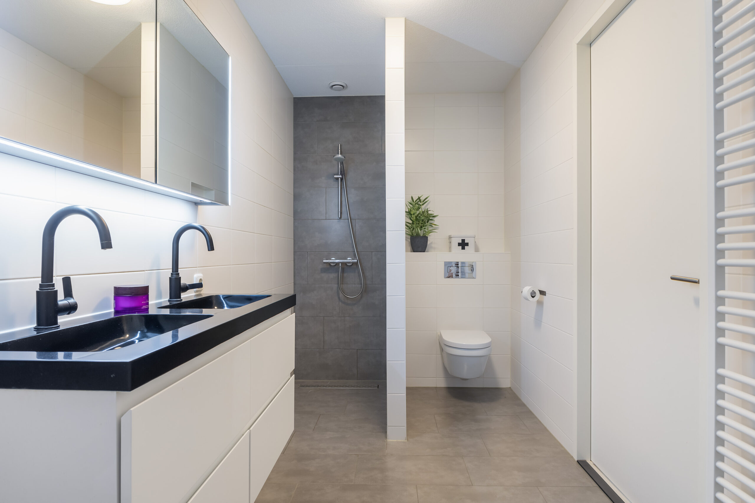 – moderne volledig betegelde badkamer voorzien van een ligbad, 2e toilet en dubbelwastafelmeubel
