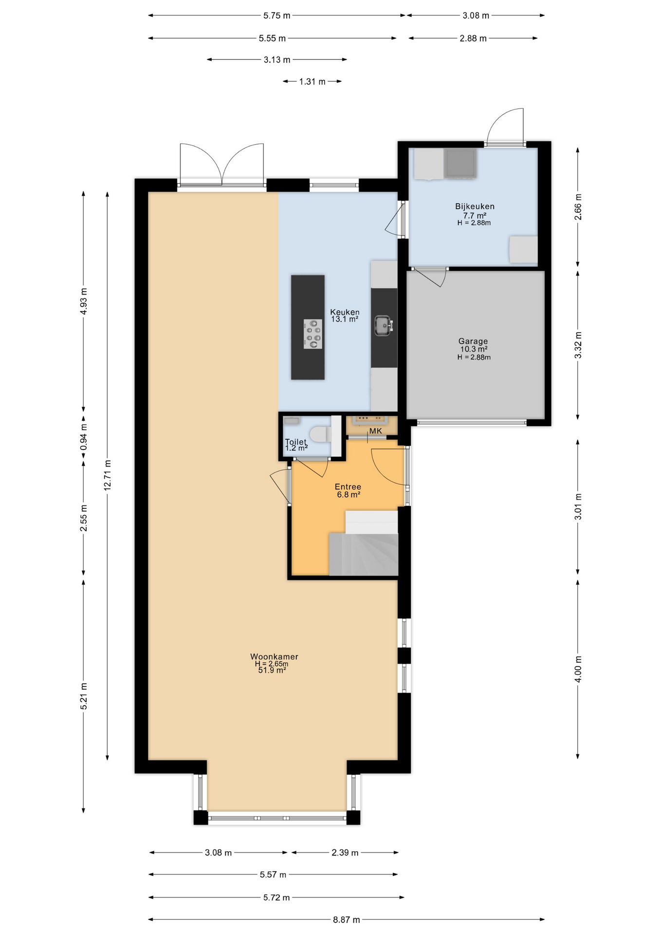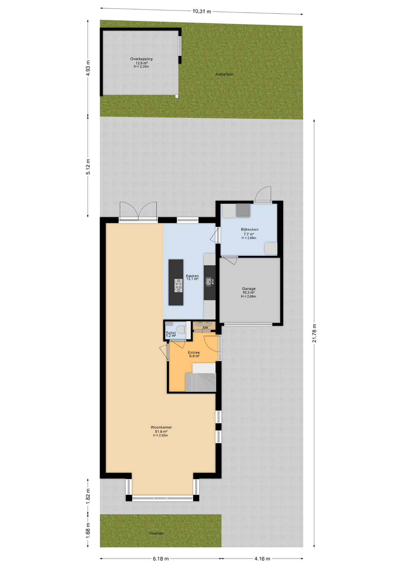 – aangebouwde stenen garage welke is opgesplitst in een bijkeuken aan de tuinzijde en een garage aan de voorzijde