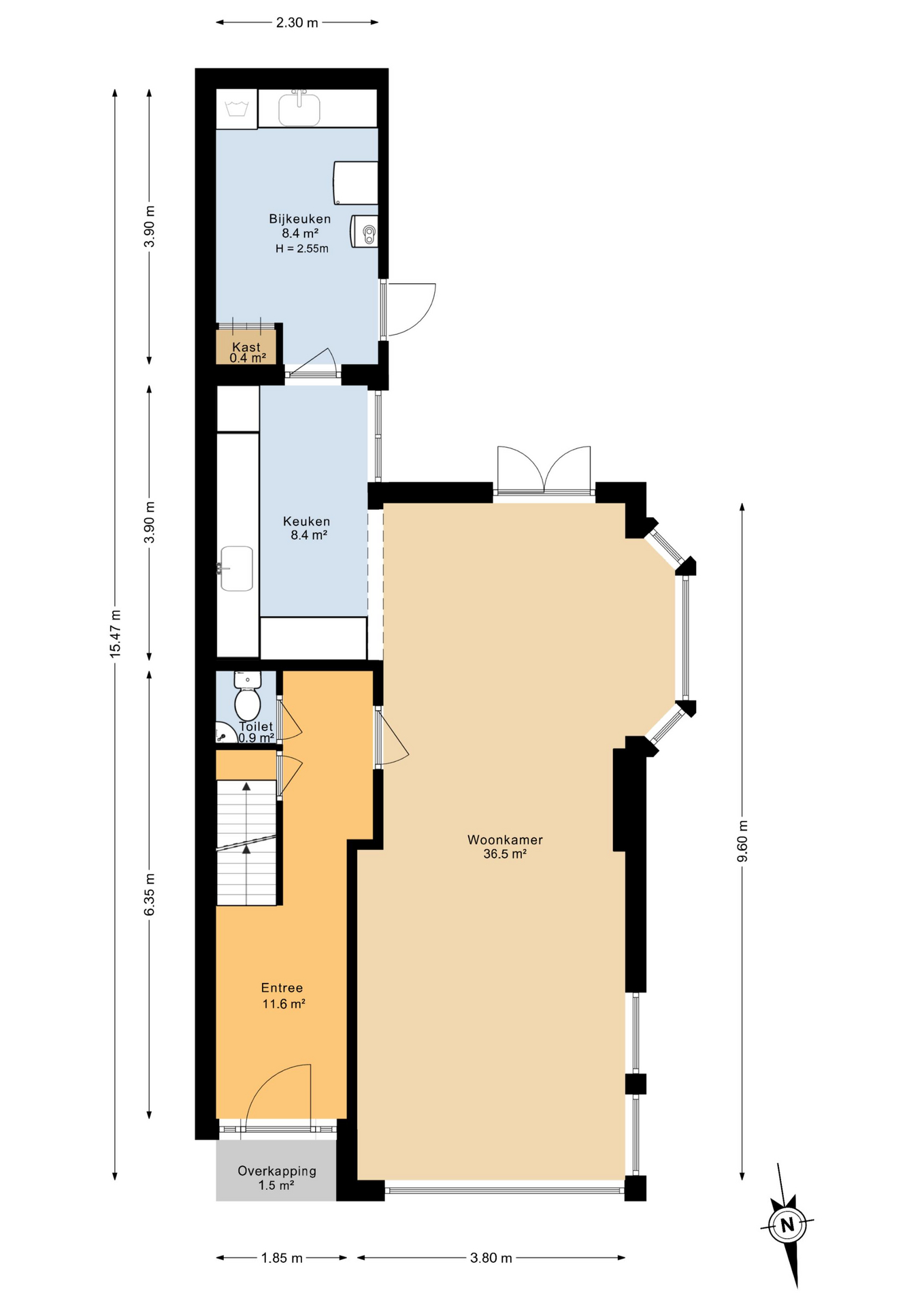 – doorzonwoonkamer (9.60m) met openslaande deuren naar de achtertuin