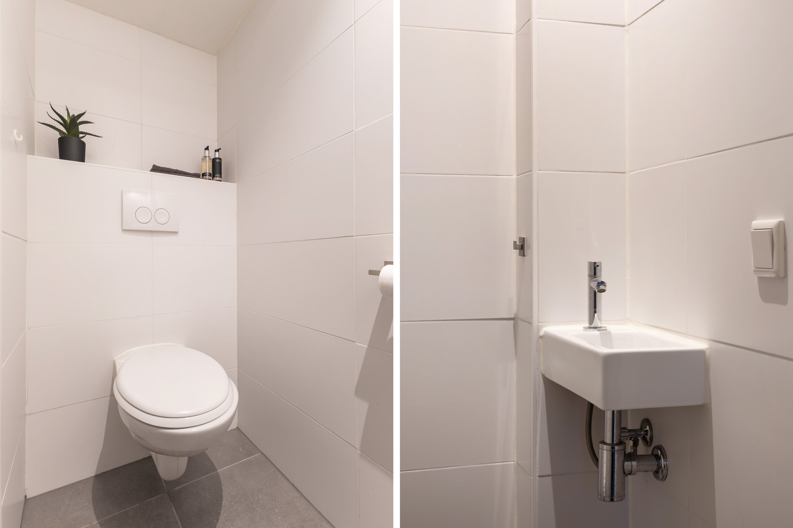 – badkamer met vloerverwarming, douche, wastafel, en toilet.