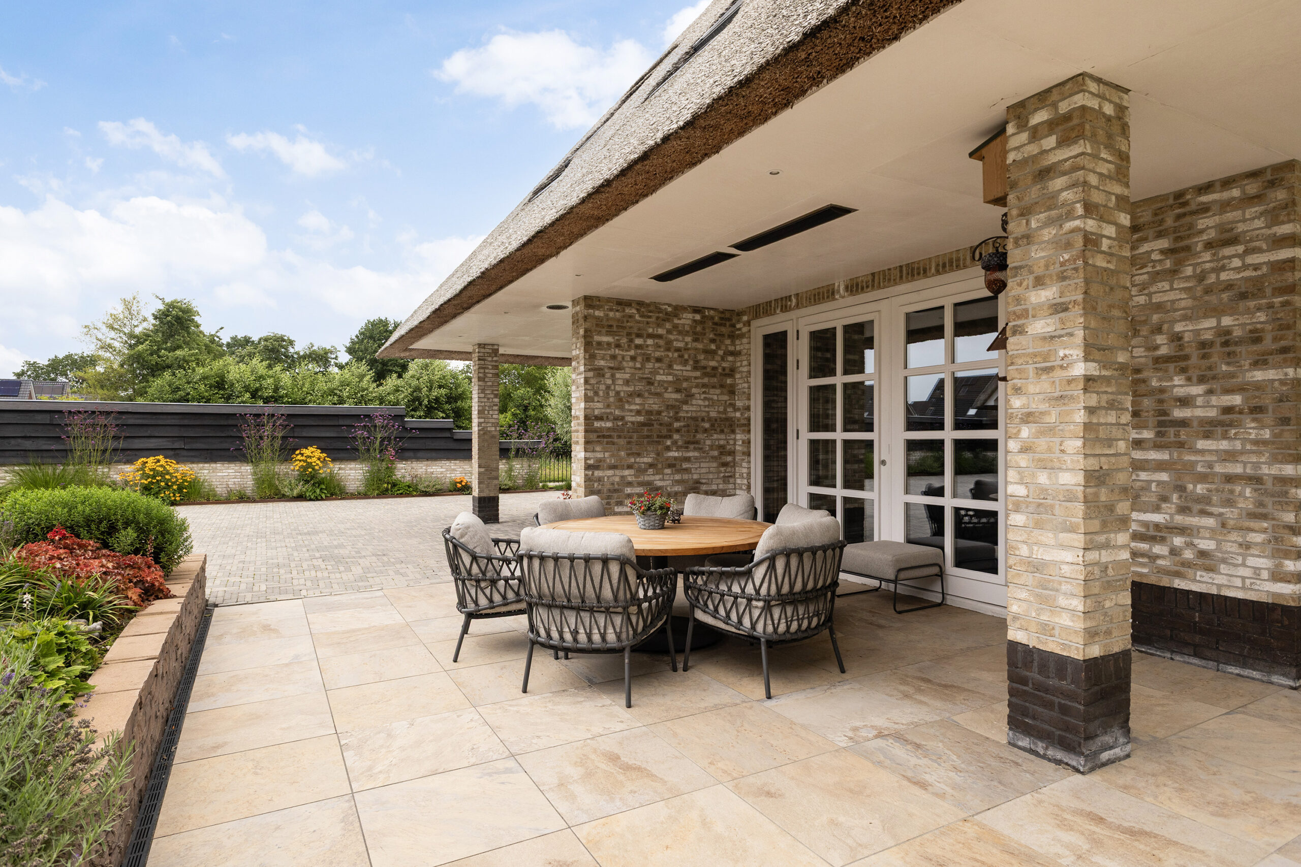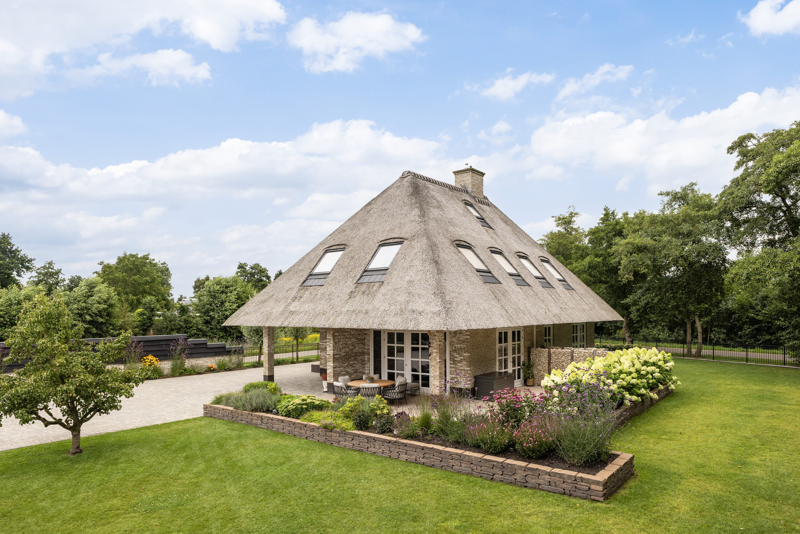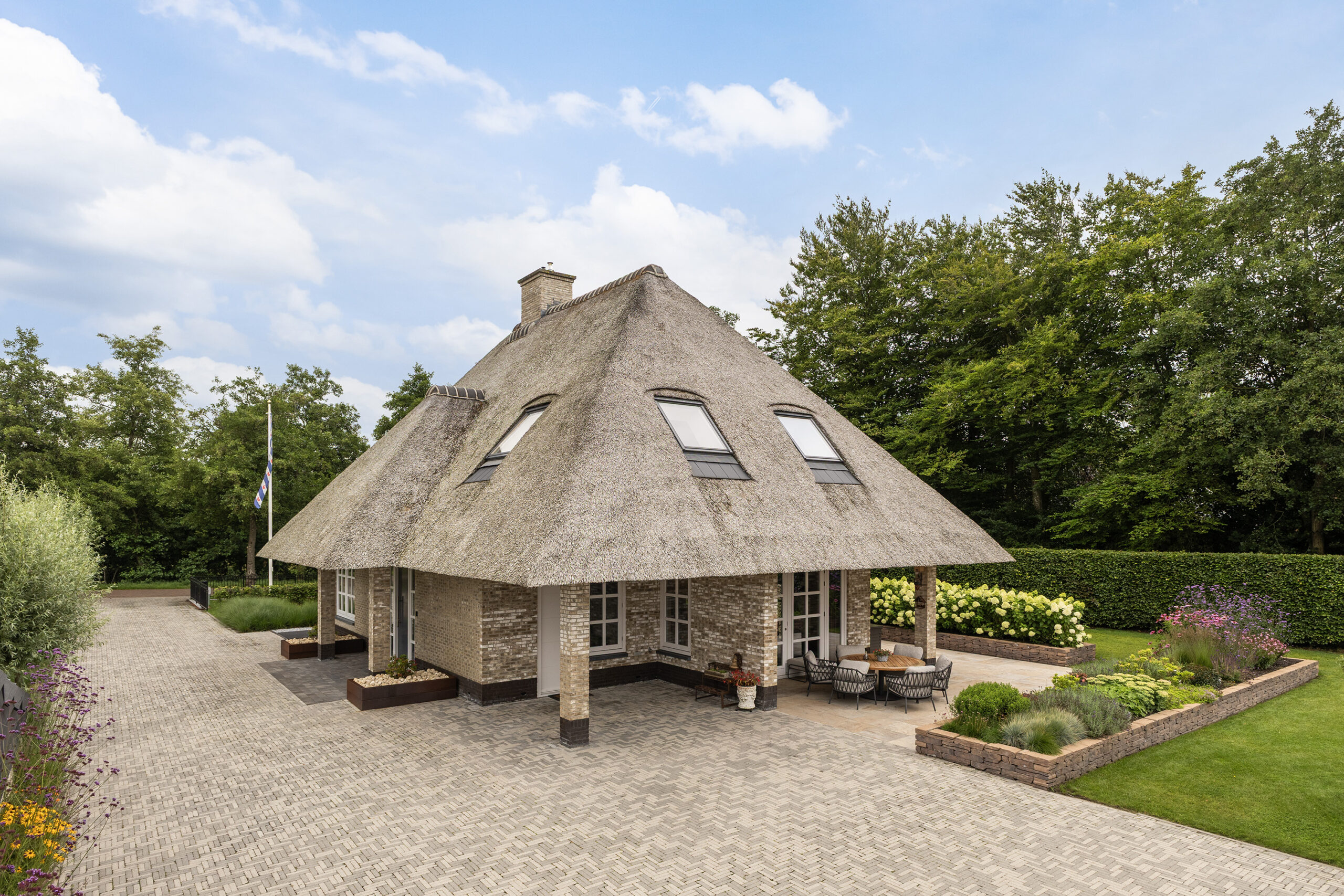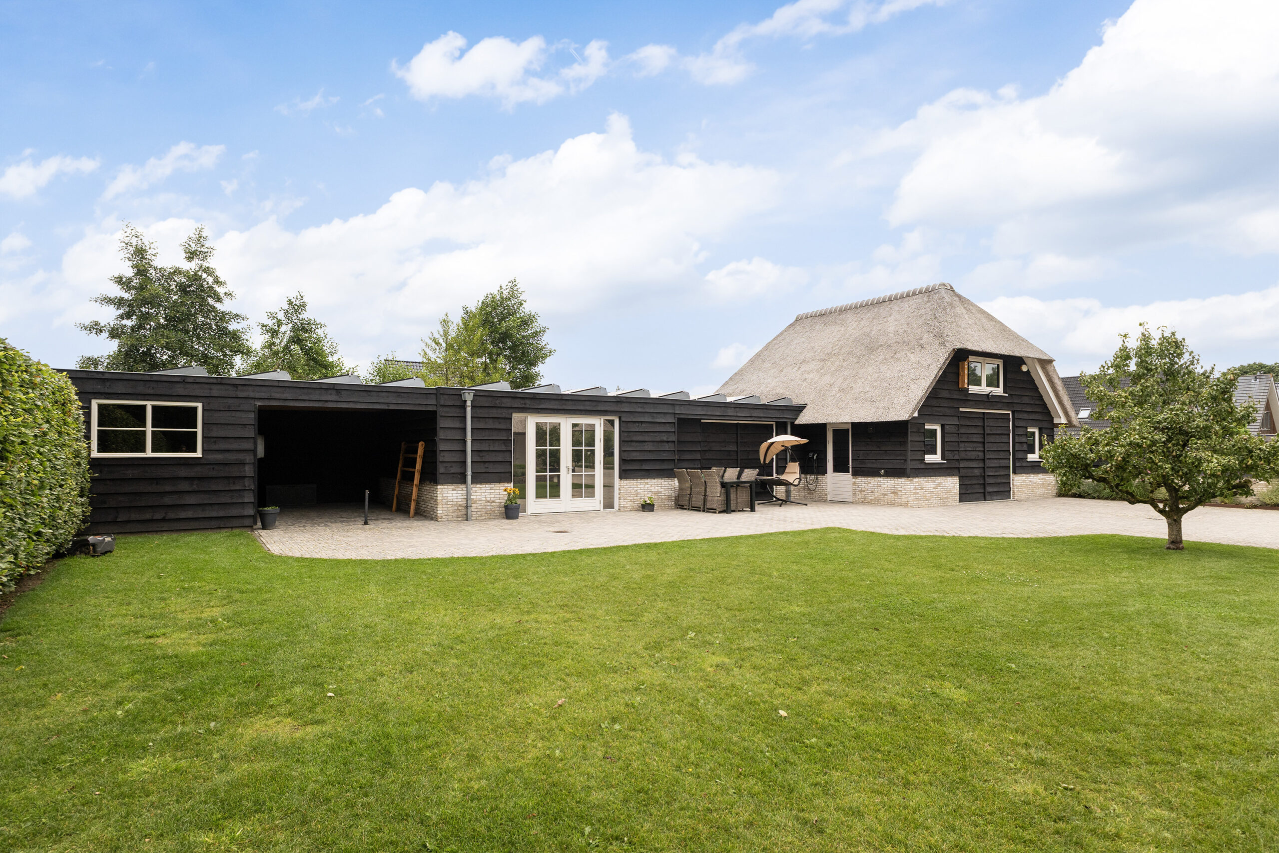 Aangrenzend aan de keuken bevindt zich de bijkeuken met loopdeur naar de tuin. De tuin rondom is ruim opgezet, met een brede oprit, een groot terras – met twee elektrische terrasverwarmers – onder het uitstekende rieten dak en een omheining van gazon en kleurrijke plantenborders.