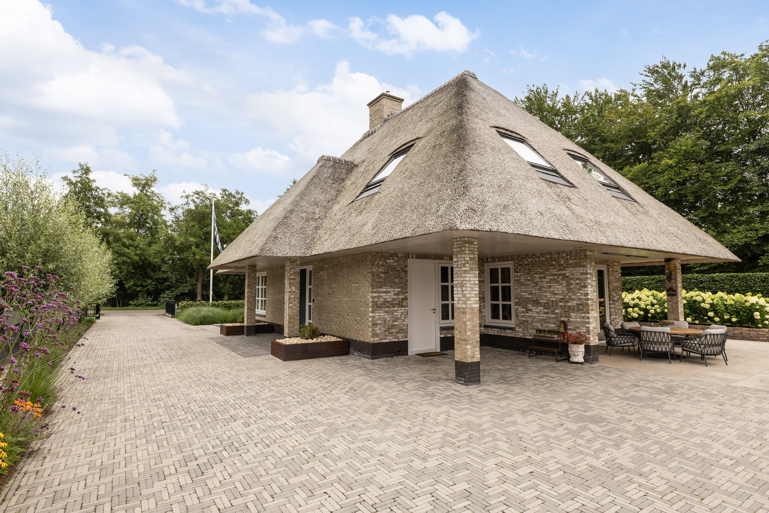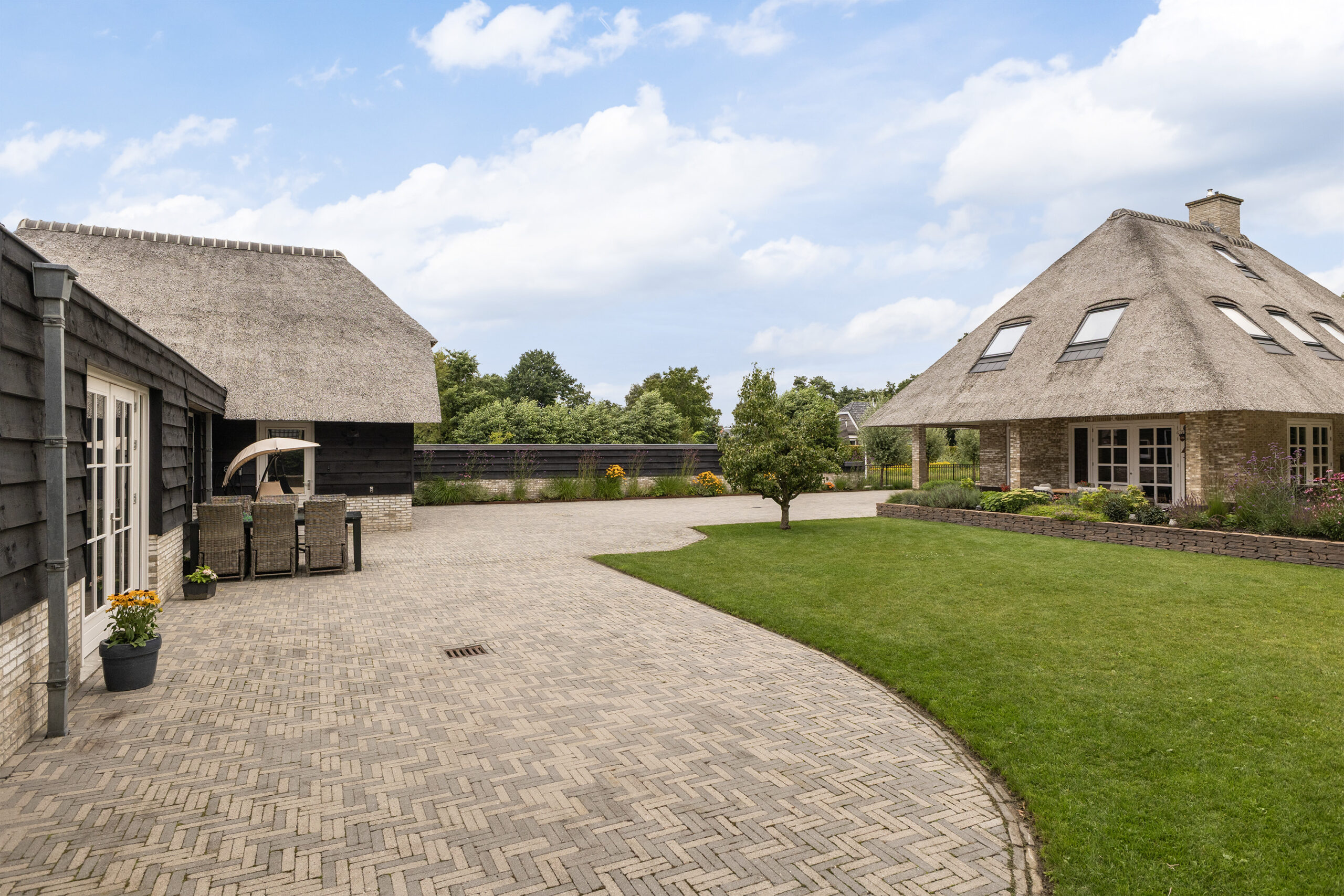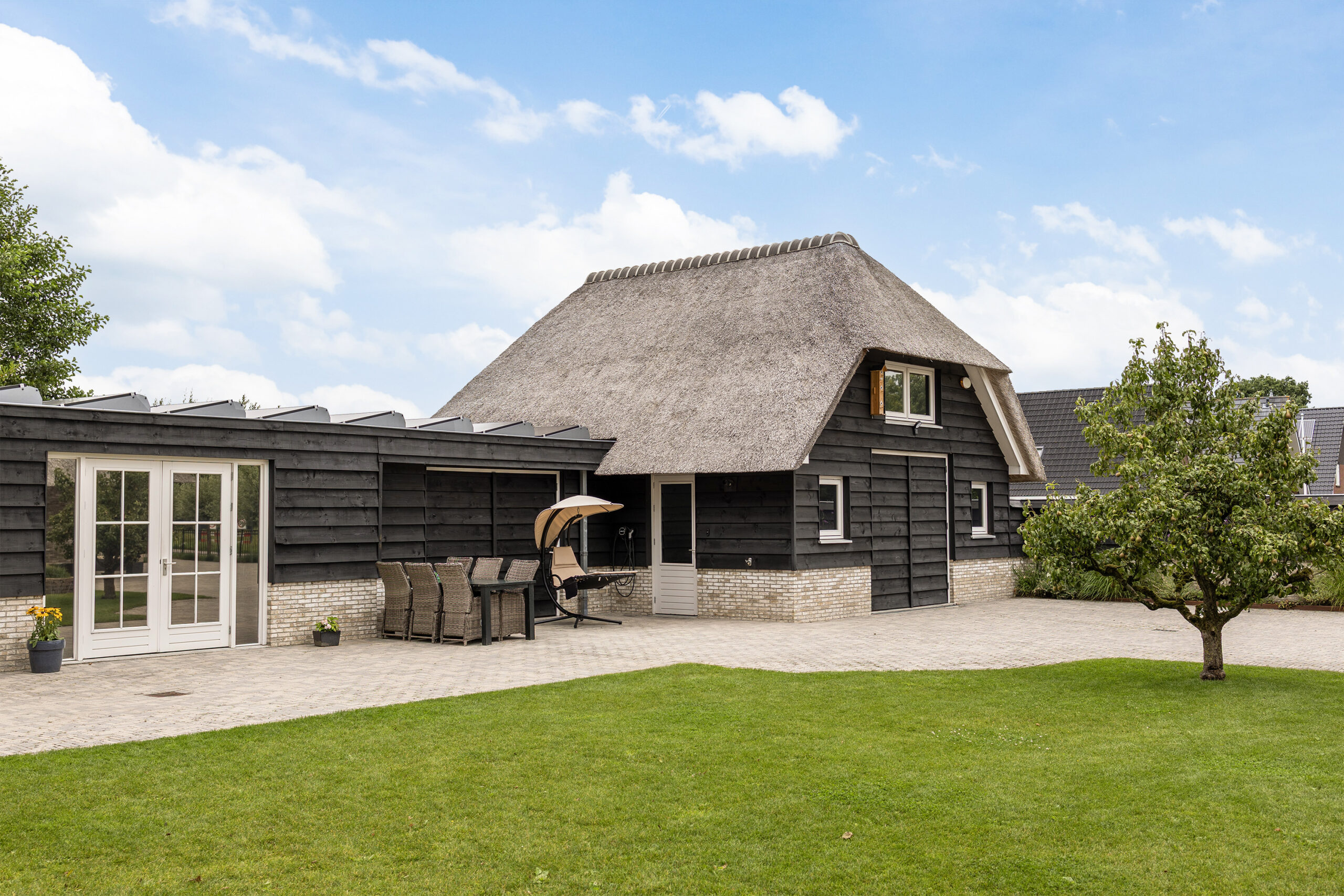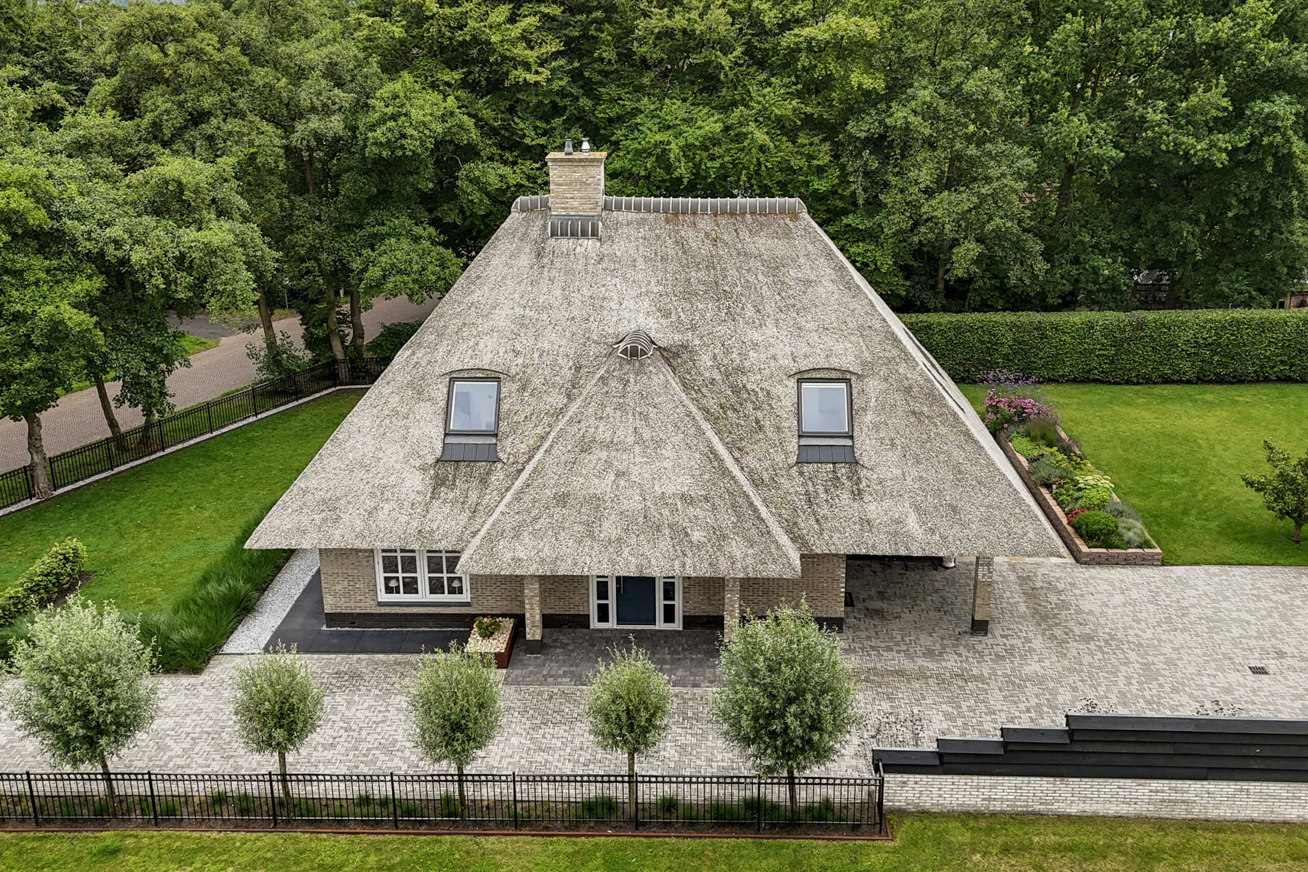 Aangrenzend aan de keuken bevindt zich de bijkeuken met loopdeur naar de tuin. De tuin rondom is ruim opgezet, met een brede oprit, een groot terras – met twee elektrische terrasverwarmers – onder het uitstekende rieten dak en een omheining van gazon en kleurrijke plantenborders.