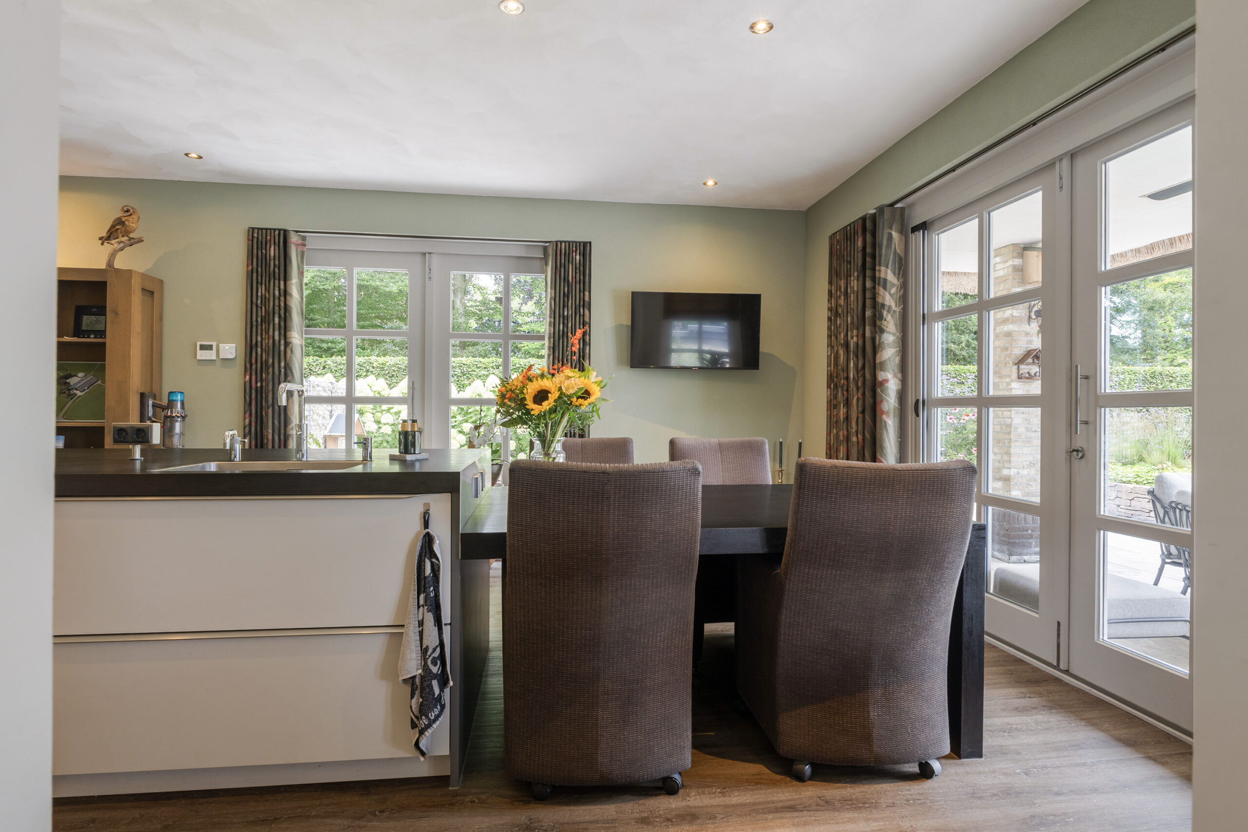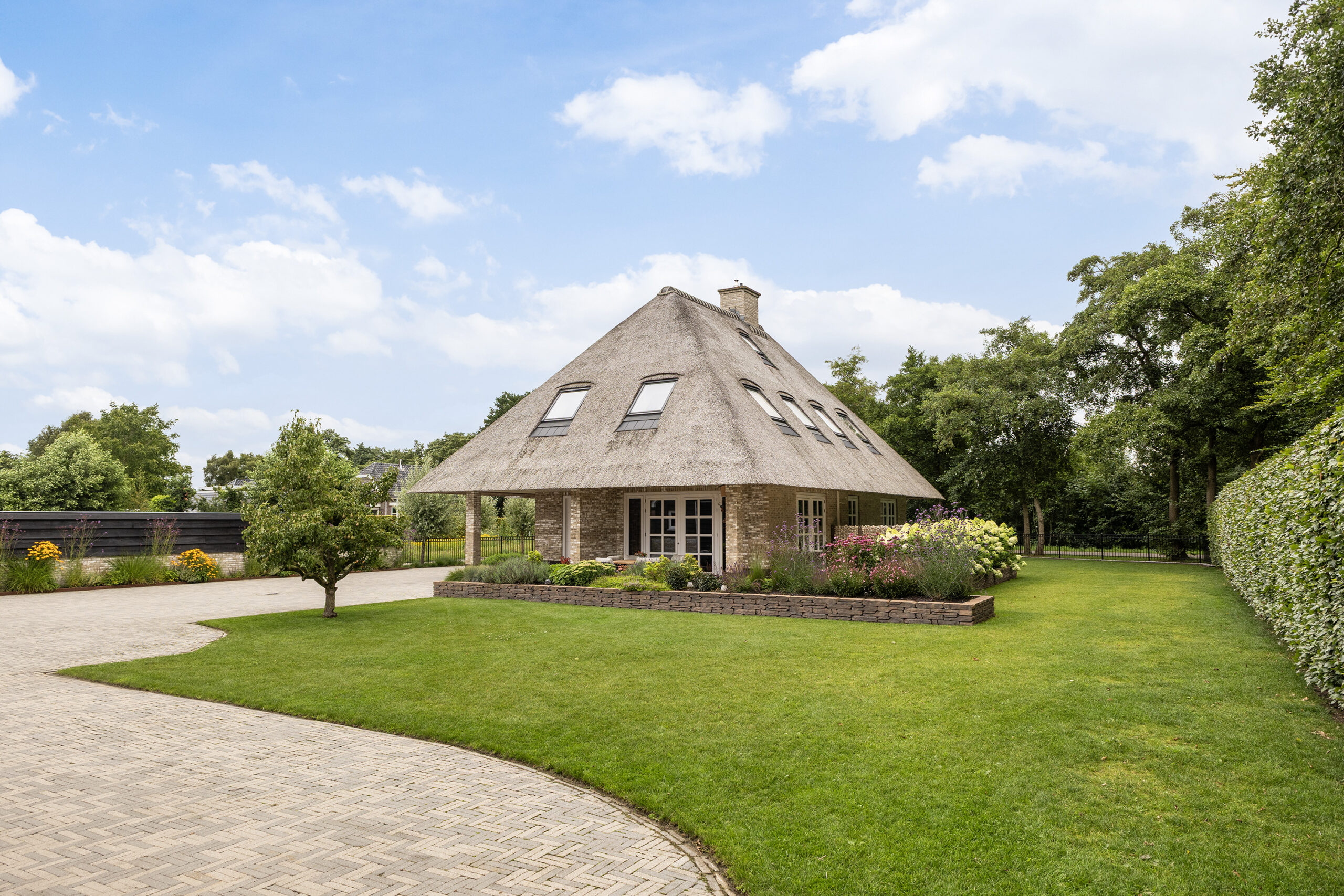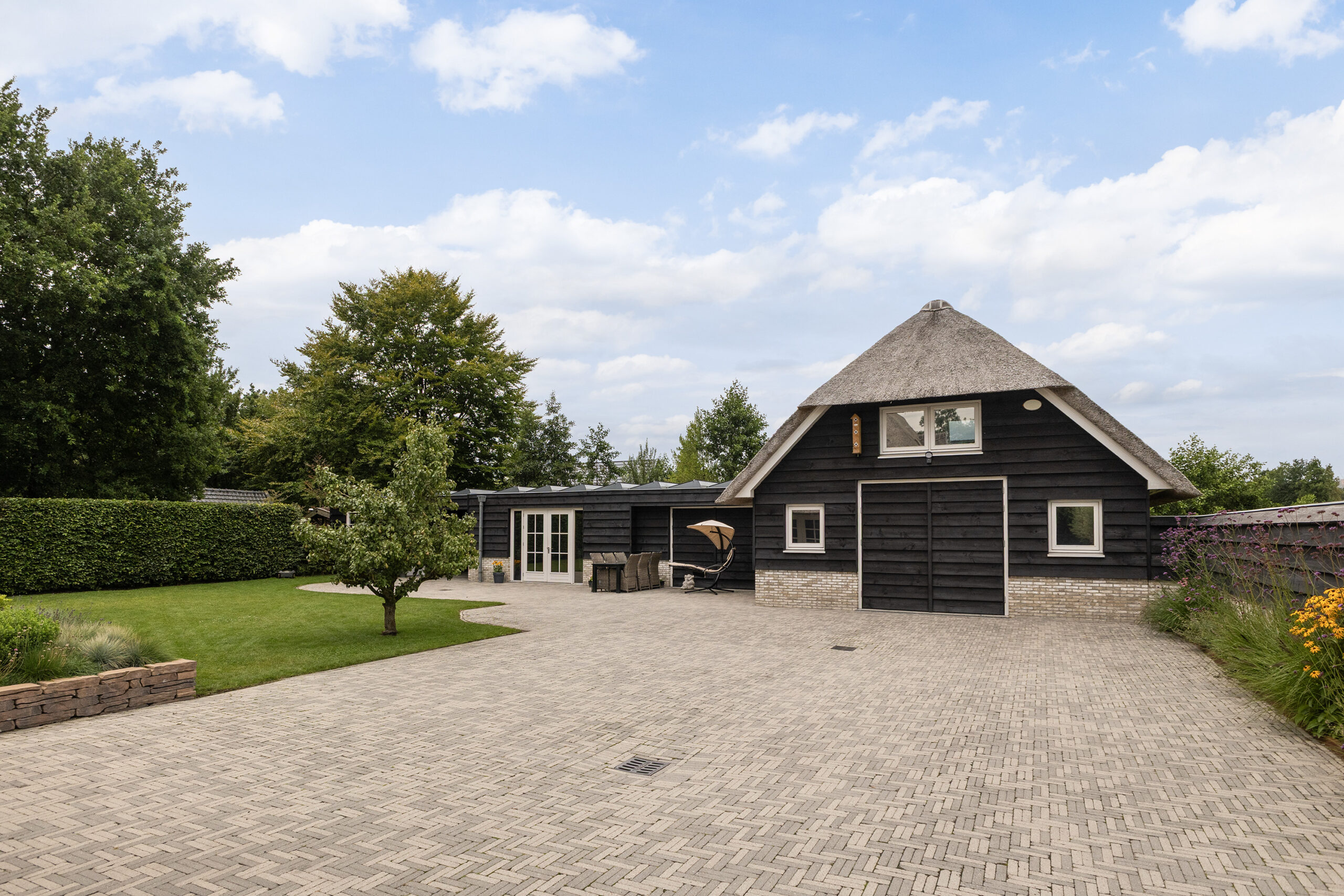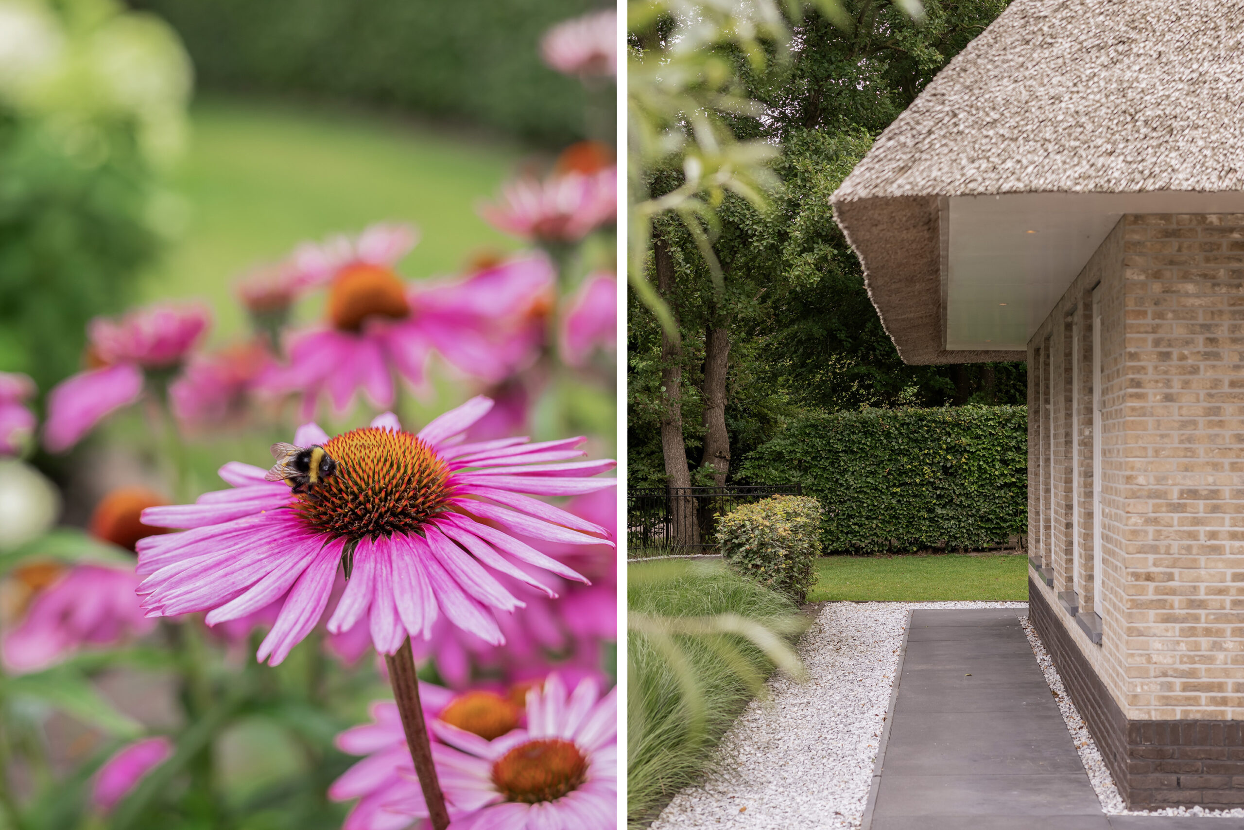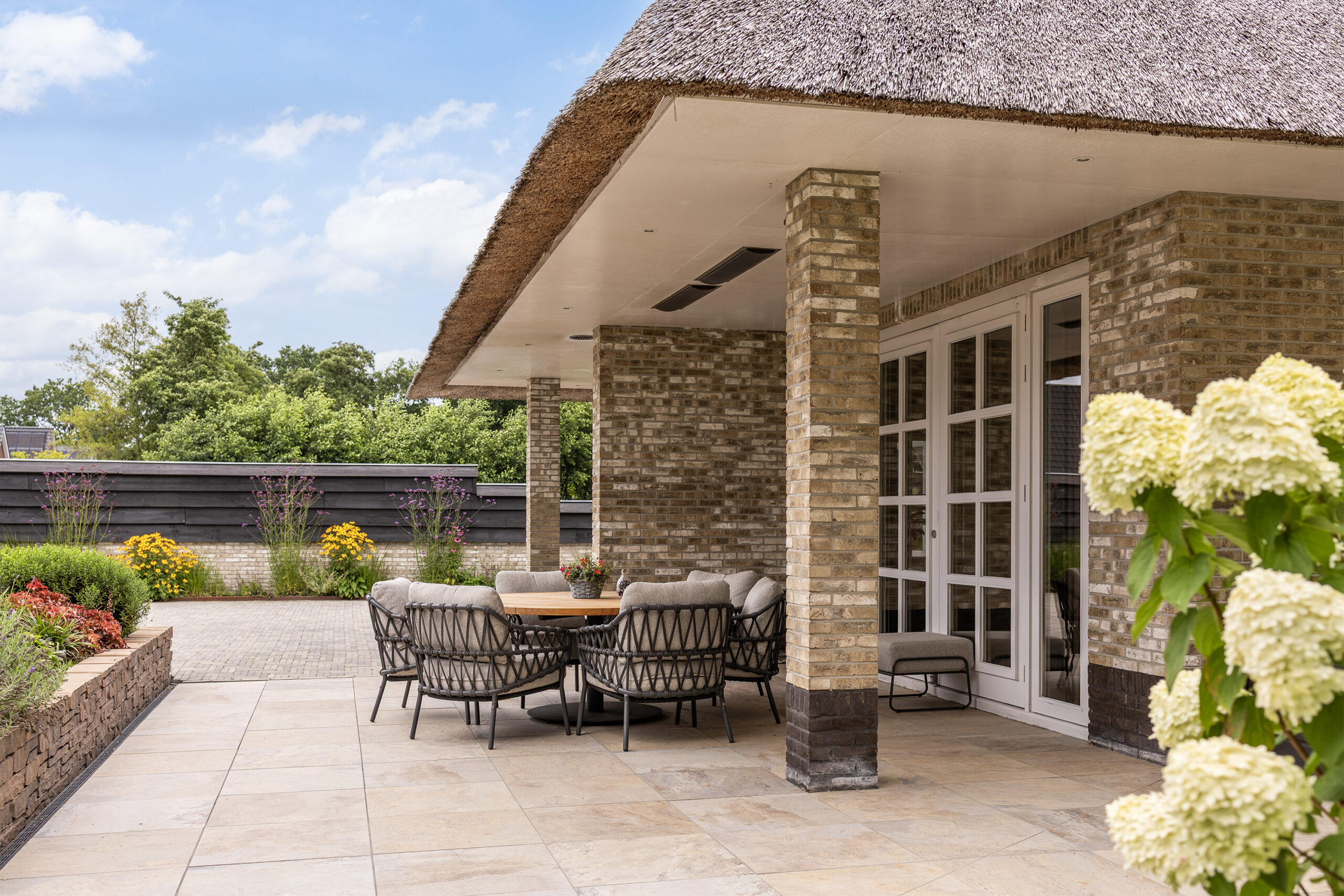 Aangrenzend aan de keuken bevindt zich de bijkeuken met loopdeur naar de tuin. De tuin rondom is ruim opgezet, met een brede oprit, een groot terras – met twee elektrische terrasverwarmers – onder het uitstekende rieten dak en een omheining van gazon en kleurrijke plantenborders.