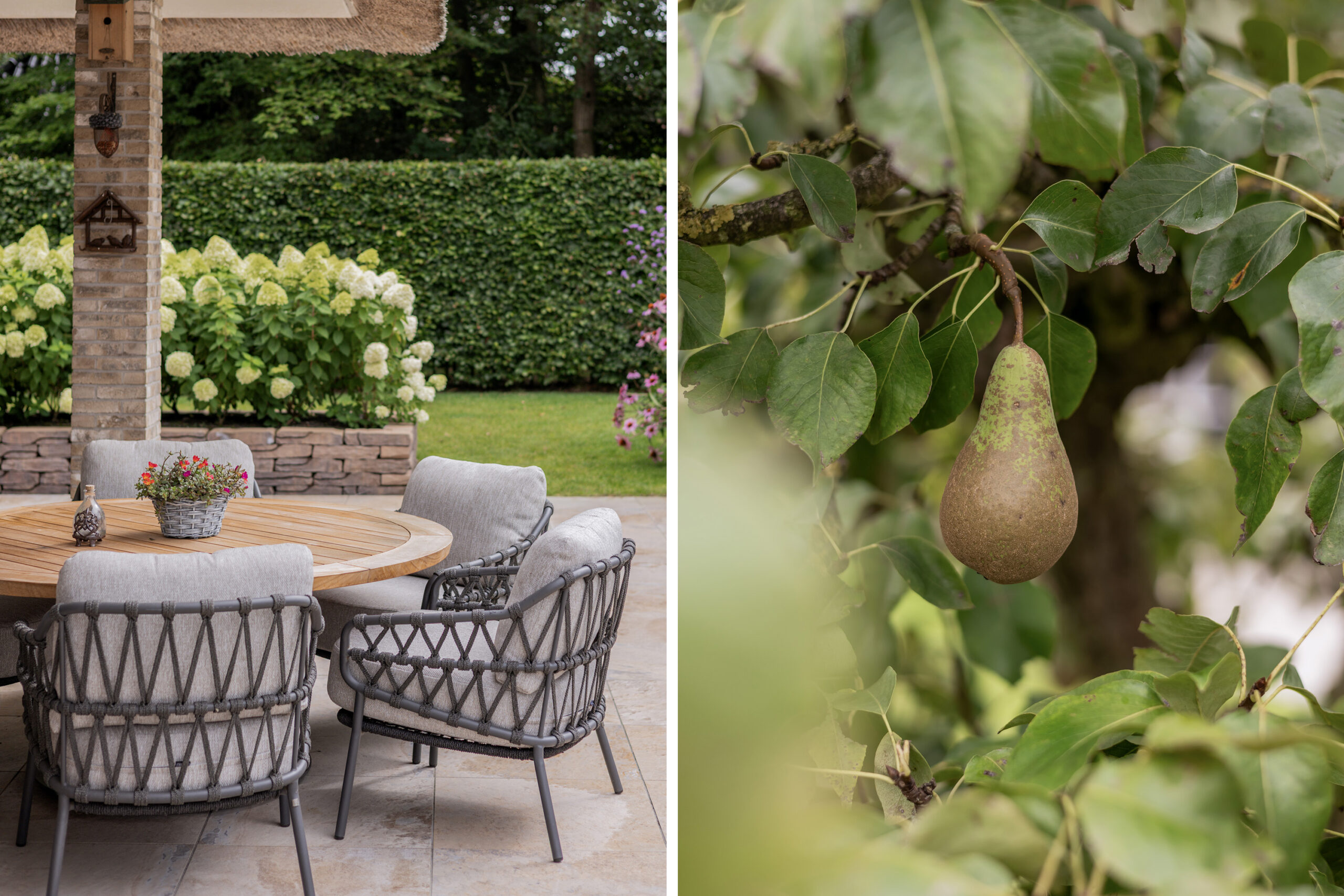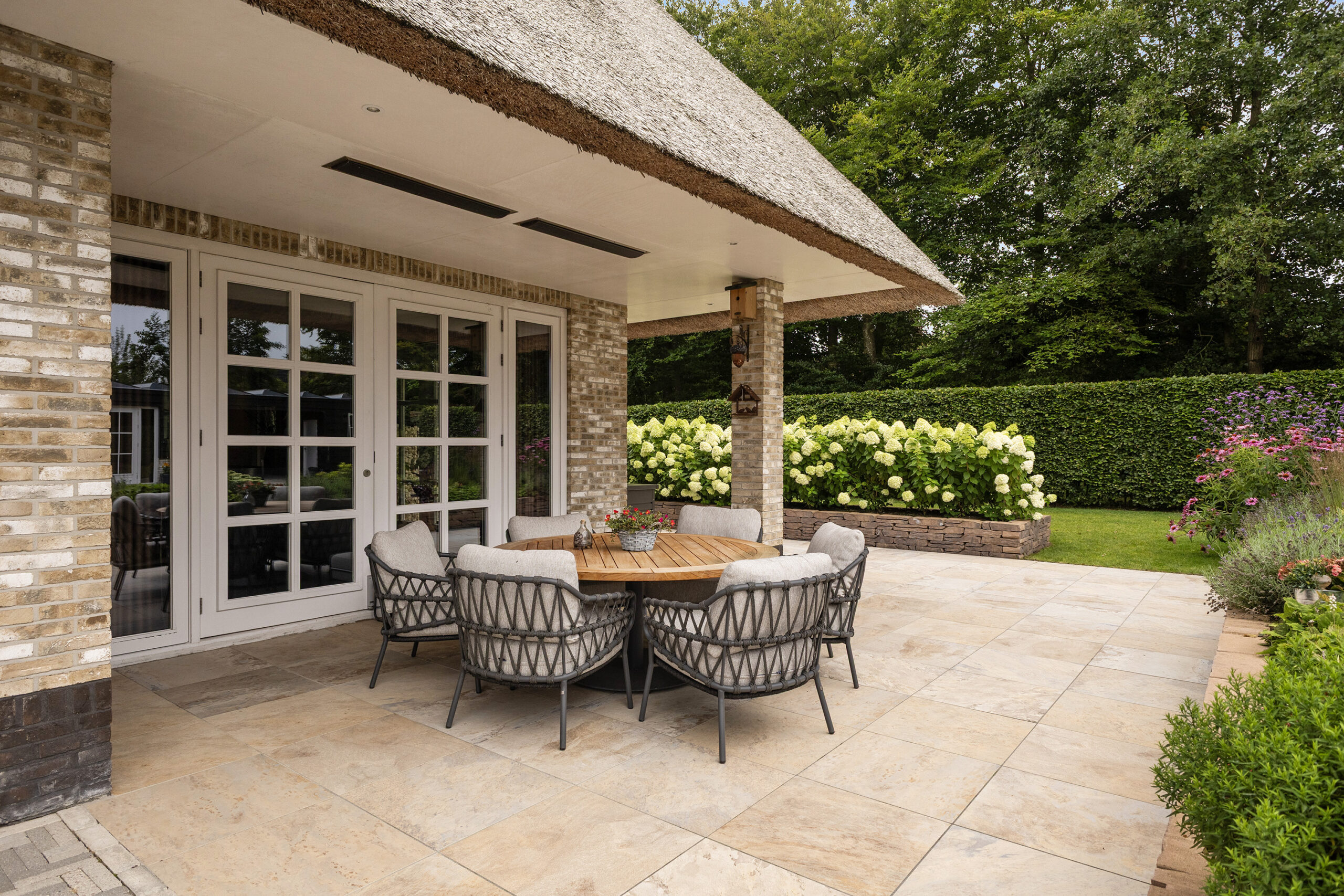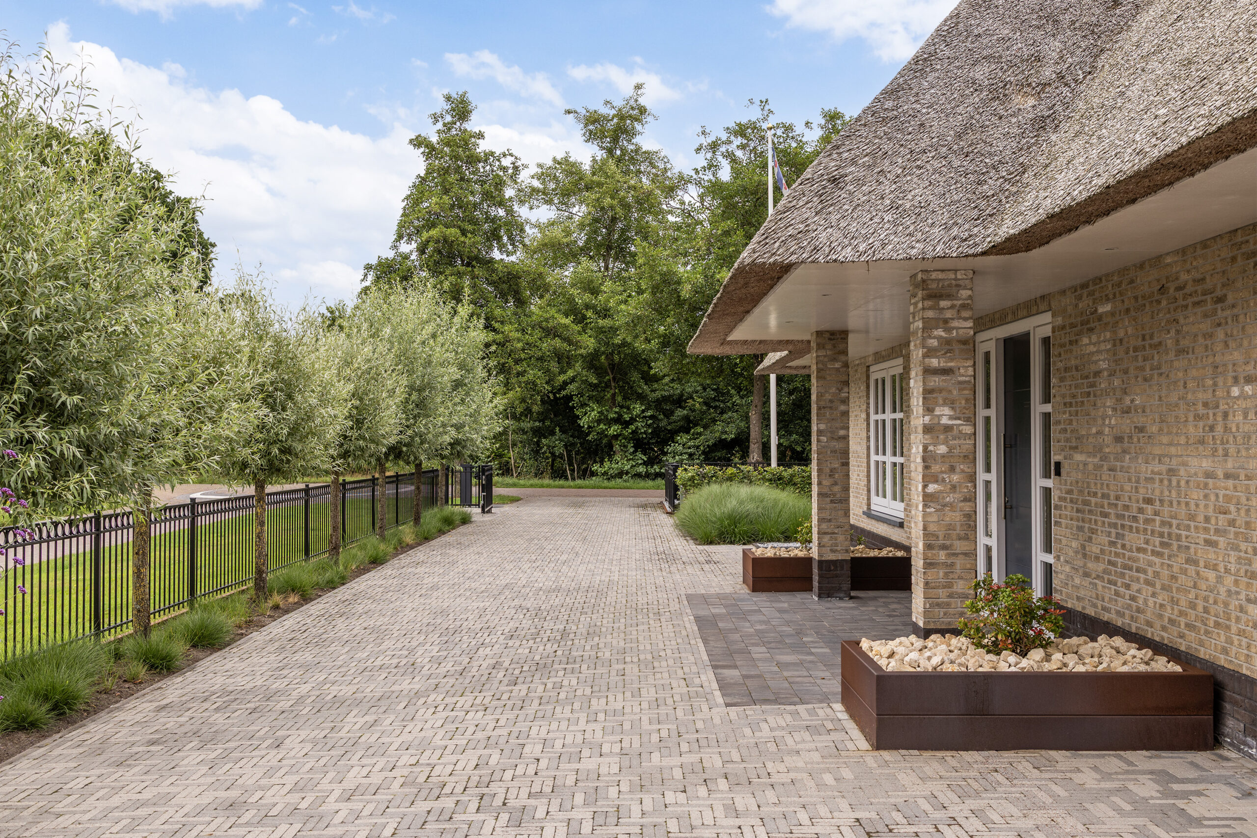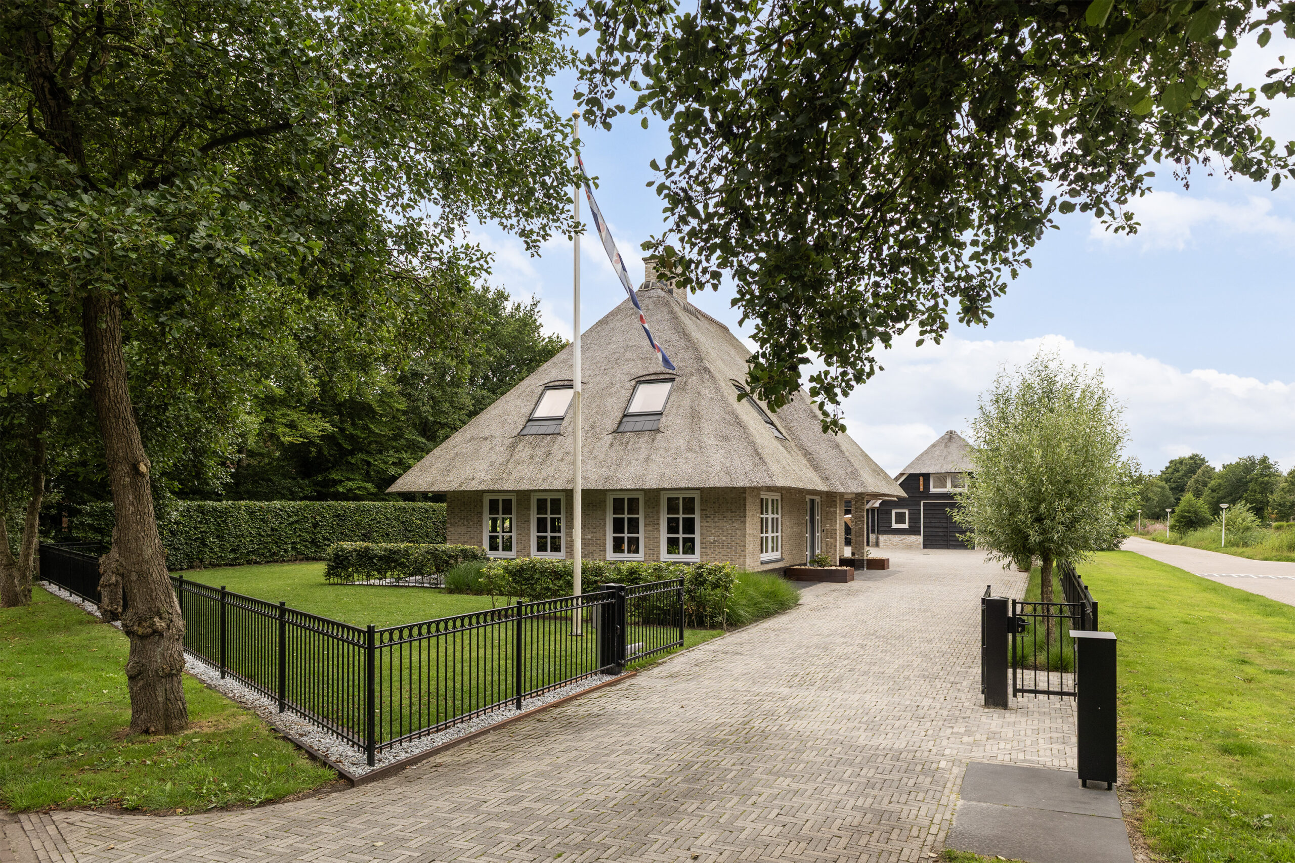 Aangrenzend aan de keuken bevindt zich de bijkeuken met loopdeur naar de tuin. De tuin rondom is ruim opgezet, met een brede oprit, een groot terras – met twee elektrische terrasverwarmers – onder het uitstekende rieten dak en een omheining van gazon en kleurrijke plantenborders.