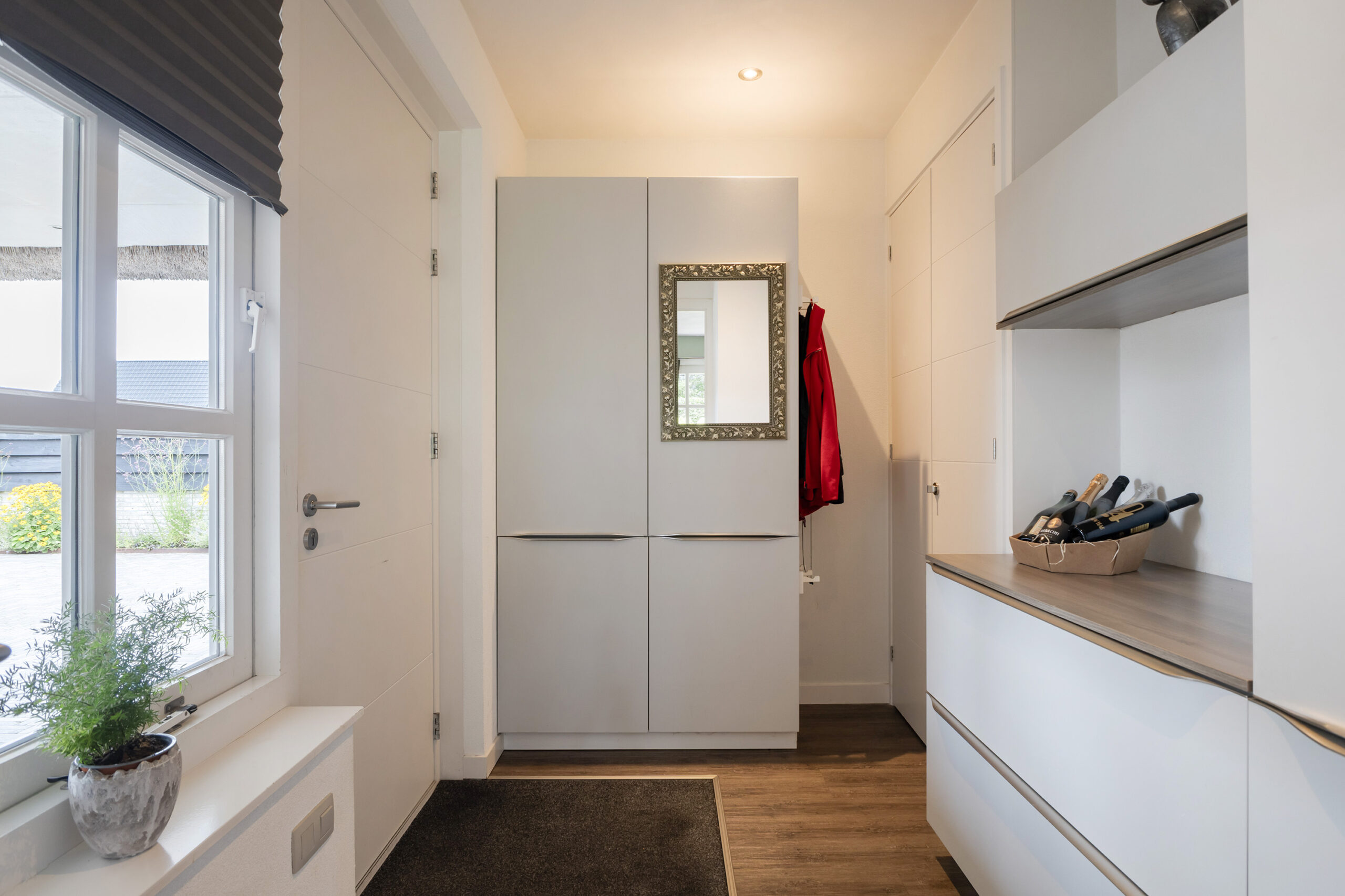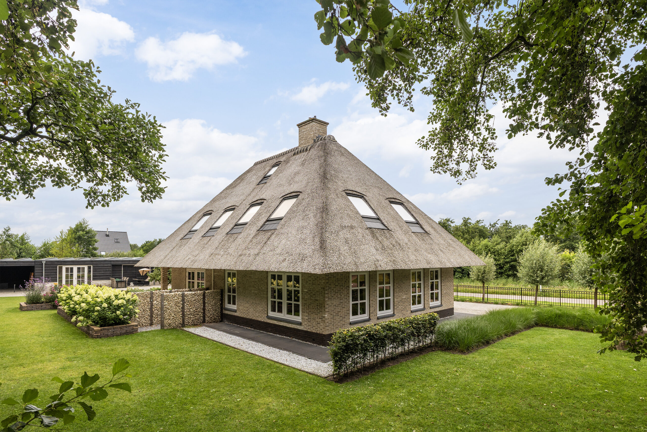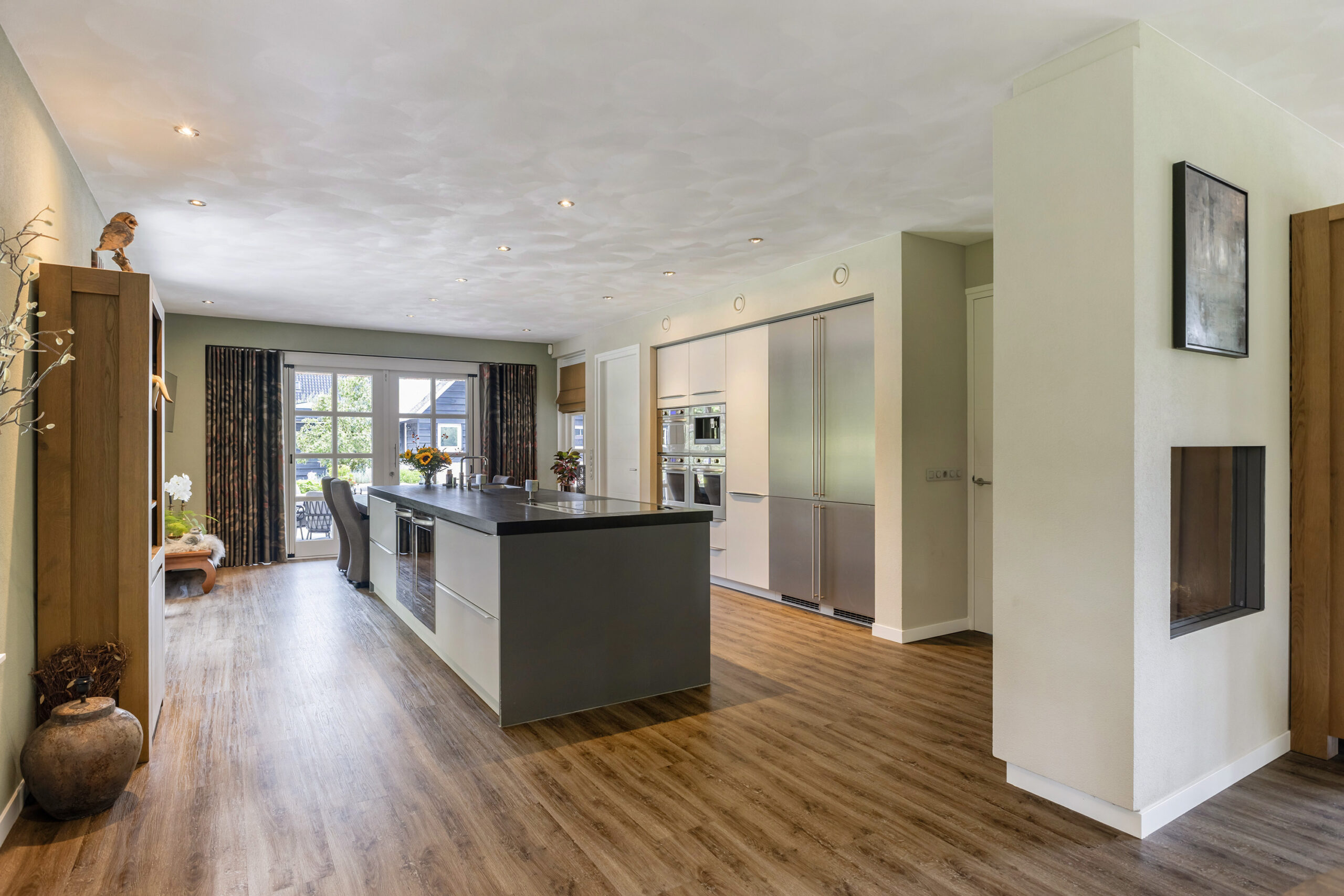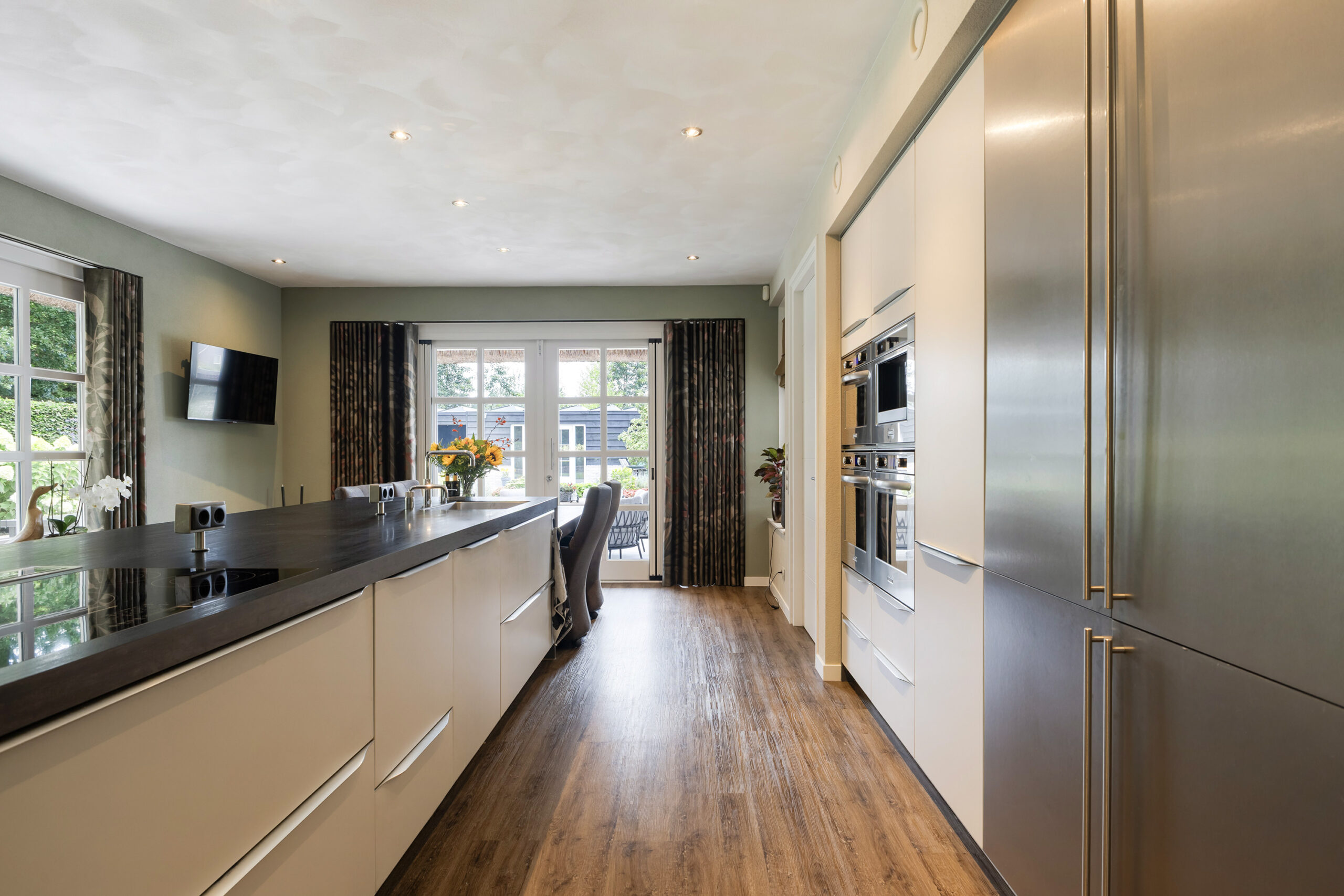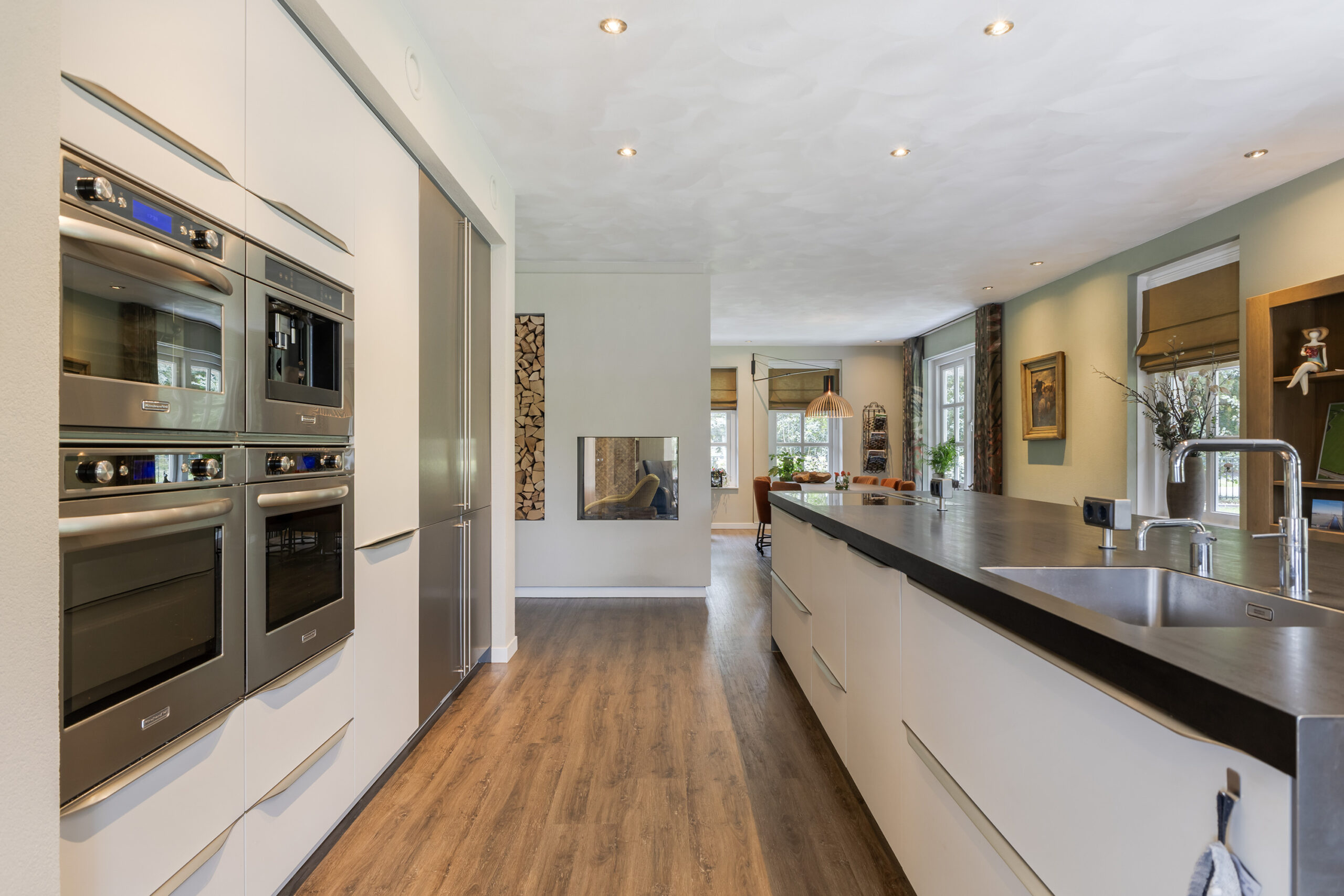Via de zij-entree betreedt u de hal met toilet, trapkast en meterkast. Vanuit hier loopt u de royale woonkeuken in (35,7 m²), voorzien van een luxe keuken in wandopstelling en een centraal kook- en spoeleiland. De keuken is uitgerust met onder meer een koken waterkraan, twee wijnklimaatkasten, een inductiekookplaat met geïntegreerde afzuiging, een vacuümapparaat, twee vriezers, twee koelkasten, twee ovens, een stoomoven en een koffiemachine. Aan het eiland is ruimte voor een gezellige eethoek, terwijl twee dubbele openslaande deuren toegang geven tot het terras, dat wordt overkapt door het daadwerkelijk uitstekende rieten dak aan de achterzijde van de woning.