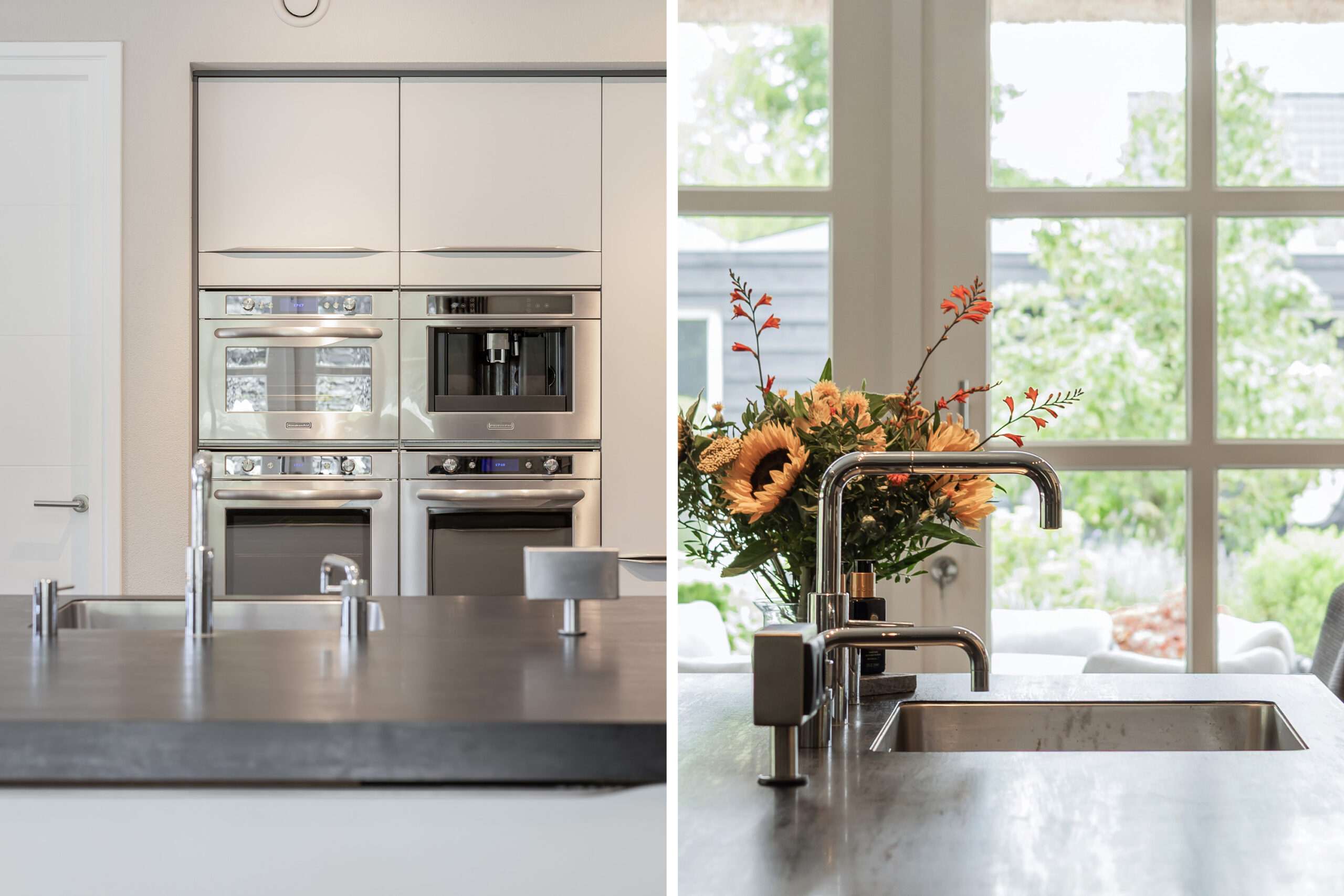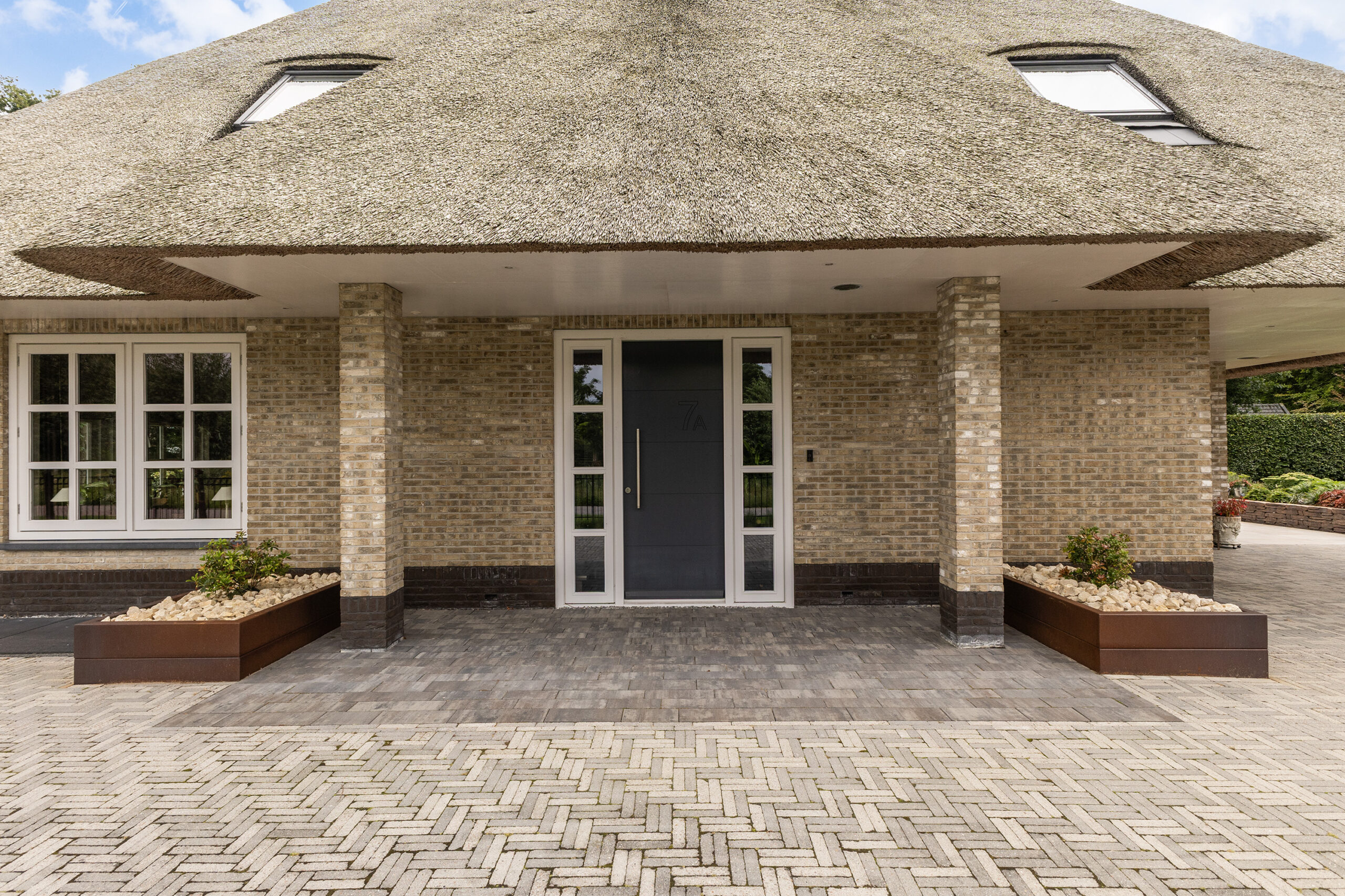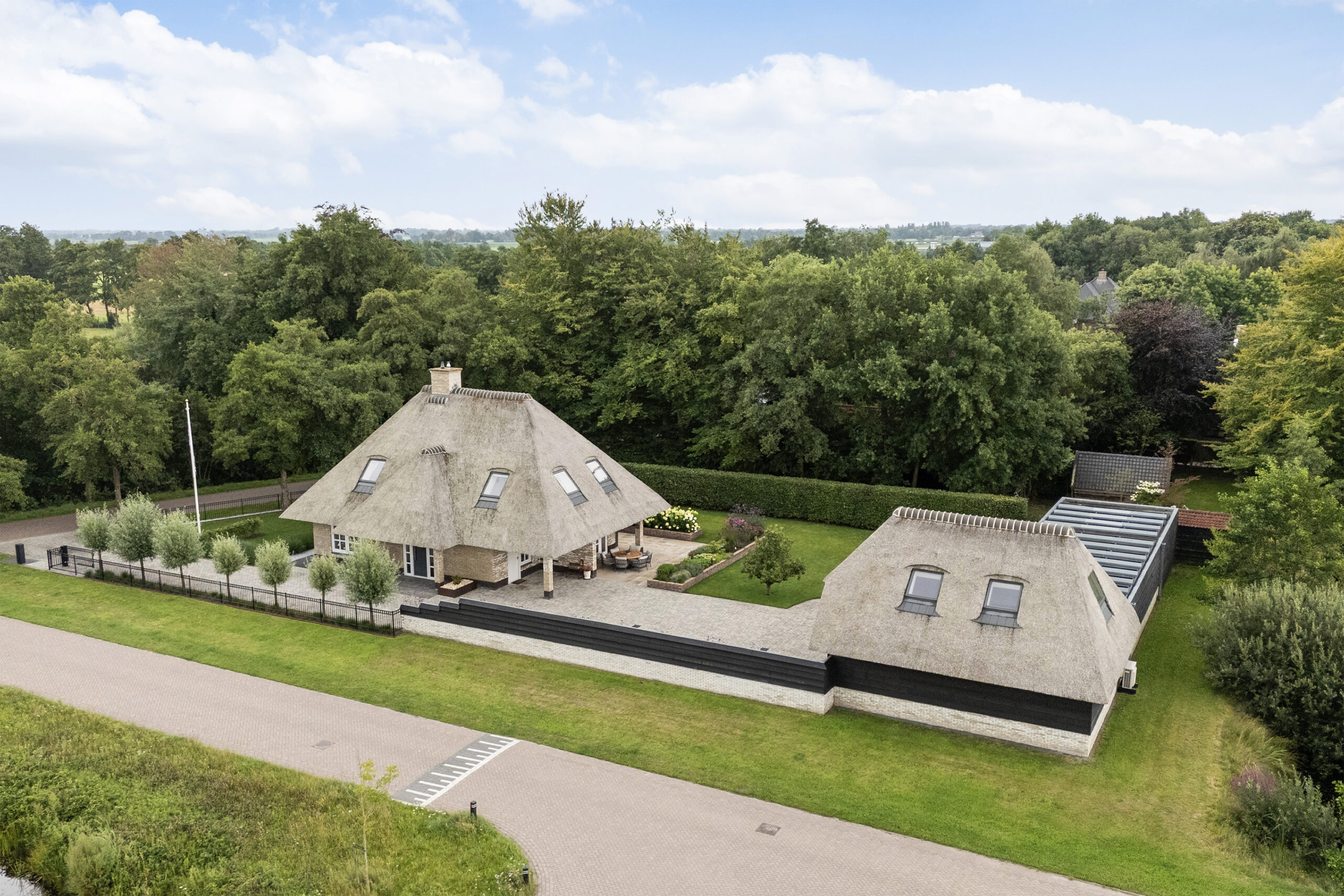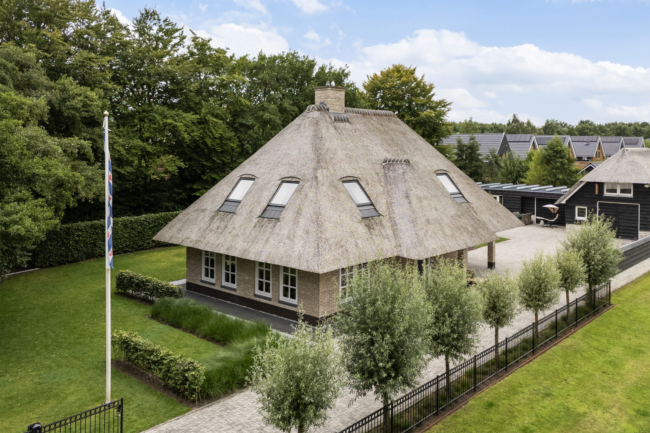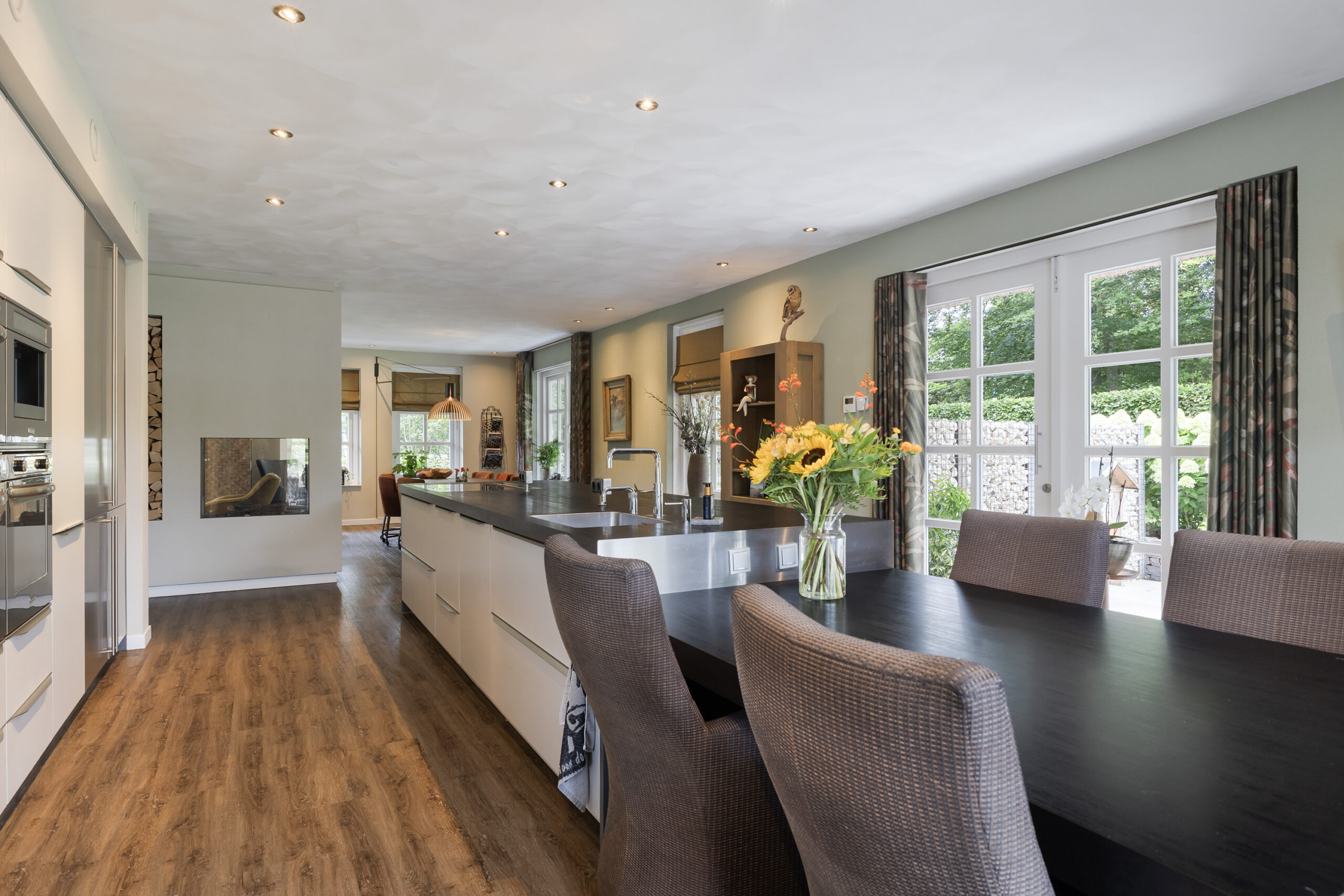 Via de zij-entree betreedt u de hal met toilet, trapkast en meterkast. Vanuit hier loopt u de royale woonkeuken in (35,7 m²), voorzien van een luxe keuken in wandopstelling en een centraal kook- en spoeleiland. De keuken is uitgerust met onder meer een koken waterkraan, twee wijnklimaatkasten, een inductiekookplaat met geïntegreerde afzuiging, een vacuümapparaat, twee vriezers, twee koelkasten, twee ovens, een stoomoven en een koffiemachine. Aan het eiland is ruimte voor een gezellige eethoek, terwijl twee dubbele openslaande deuren toegang geven tot het terras, dat wordt overkapt door het daadwerkelijk uitstekende rieten dak aan de achterzijde van de woning.