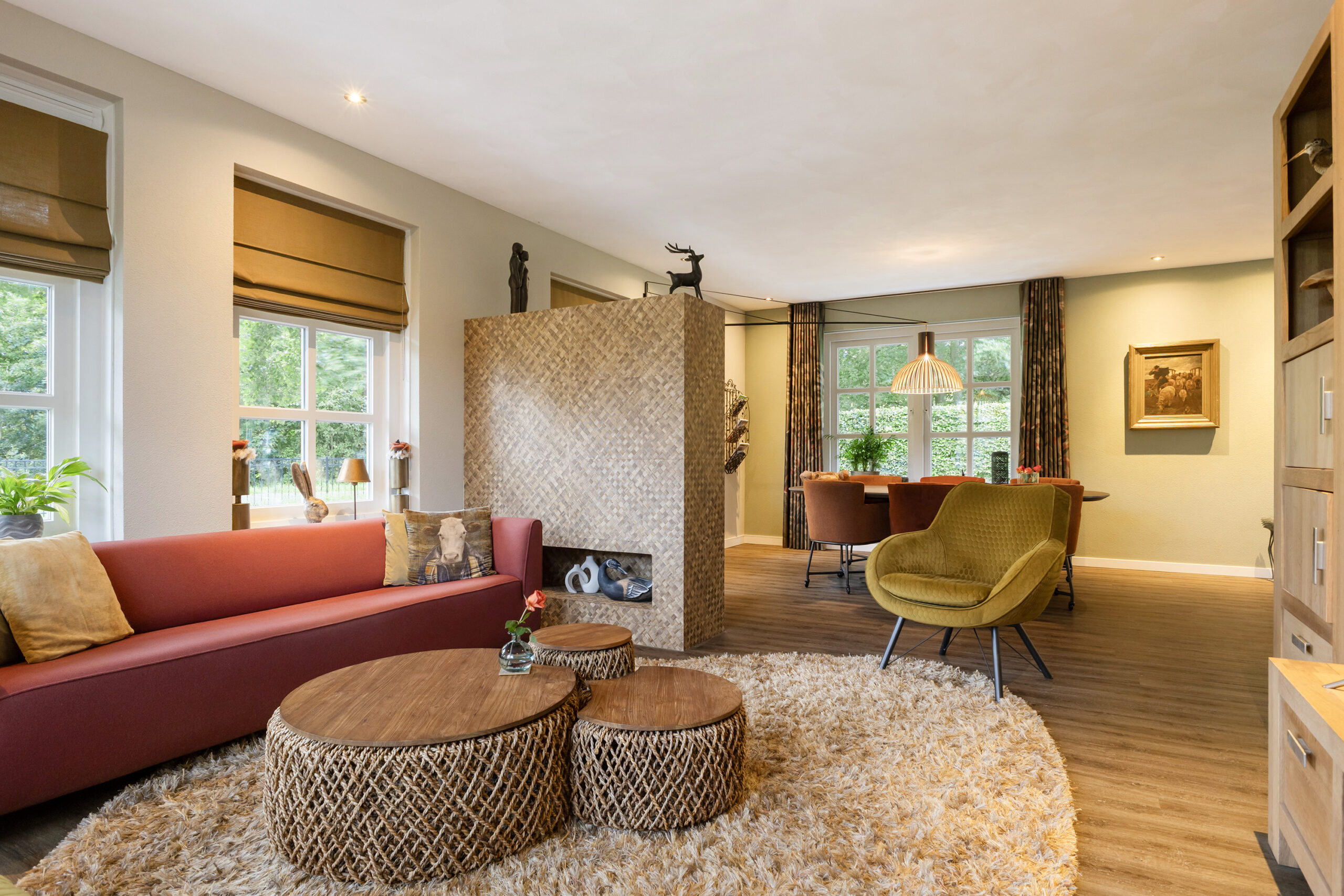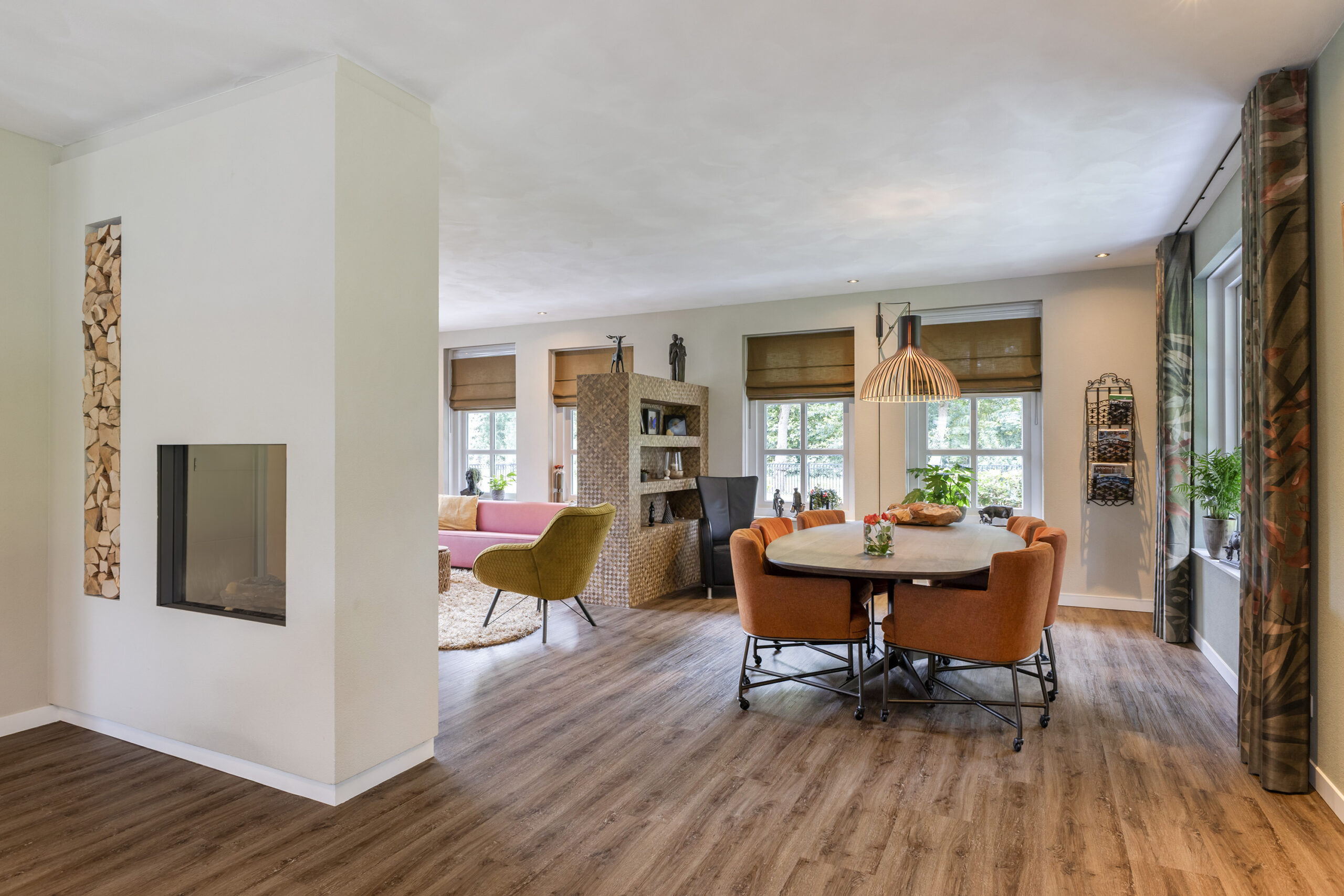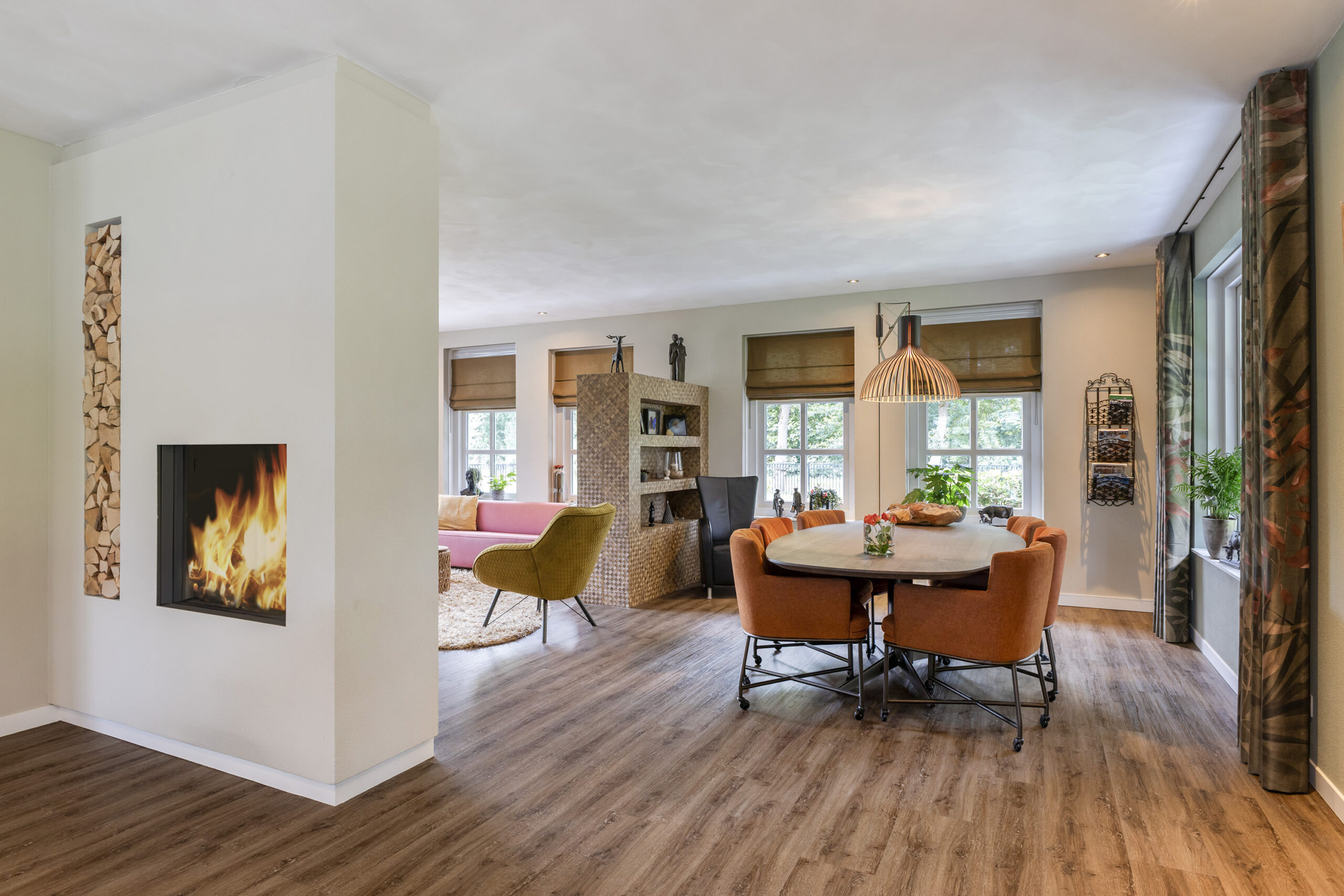 De woonkamer (38 m²) ligt aan de voorzijde en wordt van de keuken gescheiden door een kleine wand met sfeervolle gashaard. Er is volop ruimte voor zowel een grote eethoek als een royale zithoek. De gehele verdieping is uitgerust met vloerverwarming.