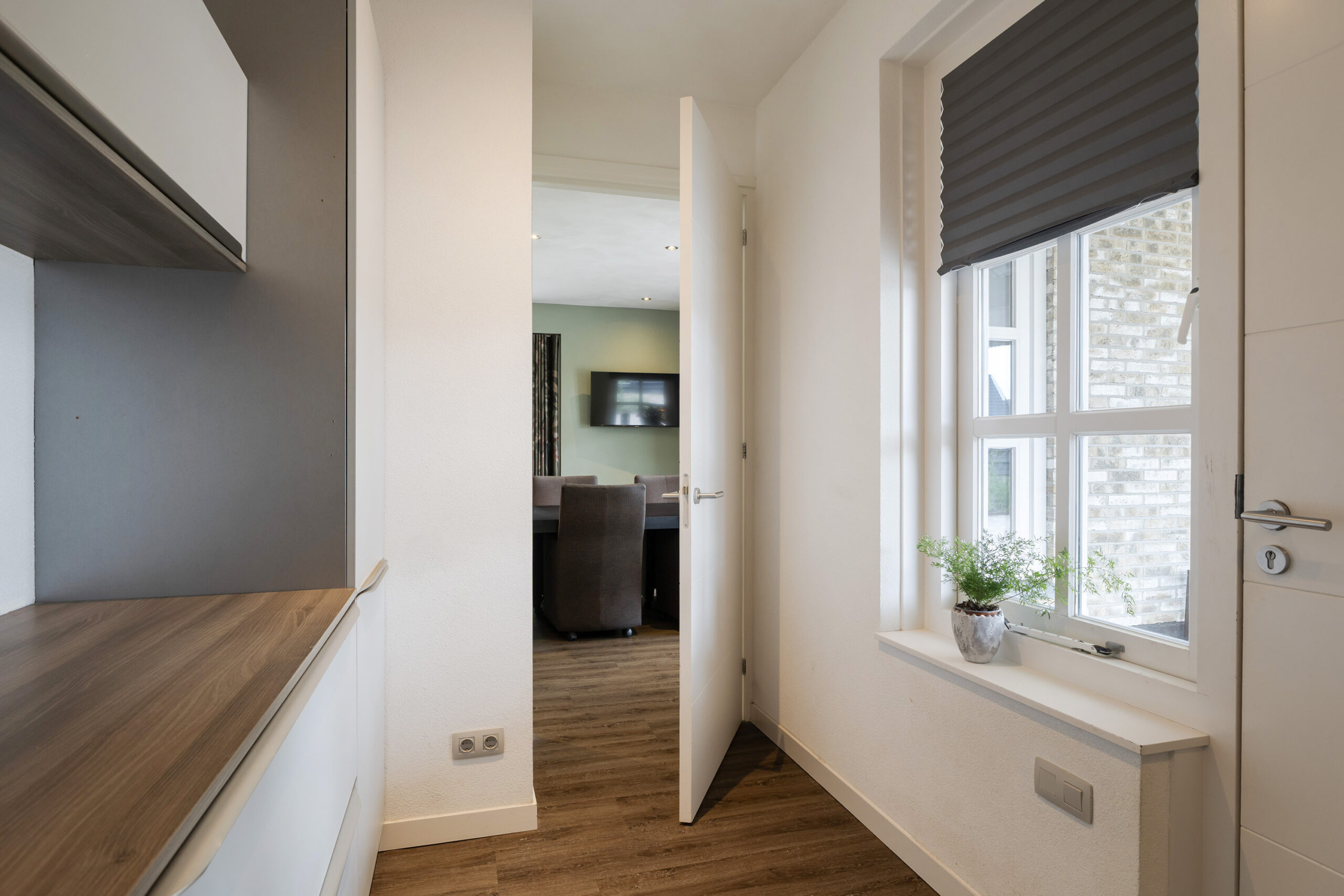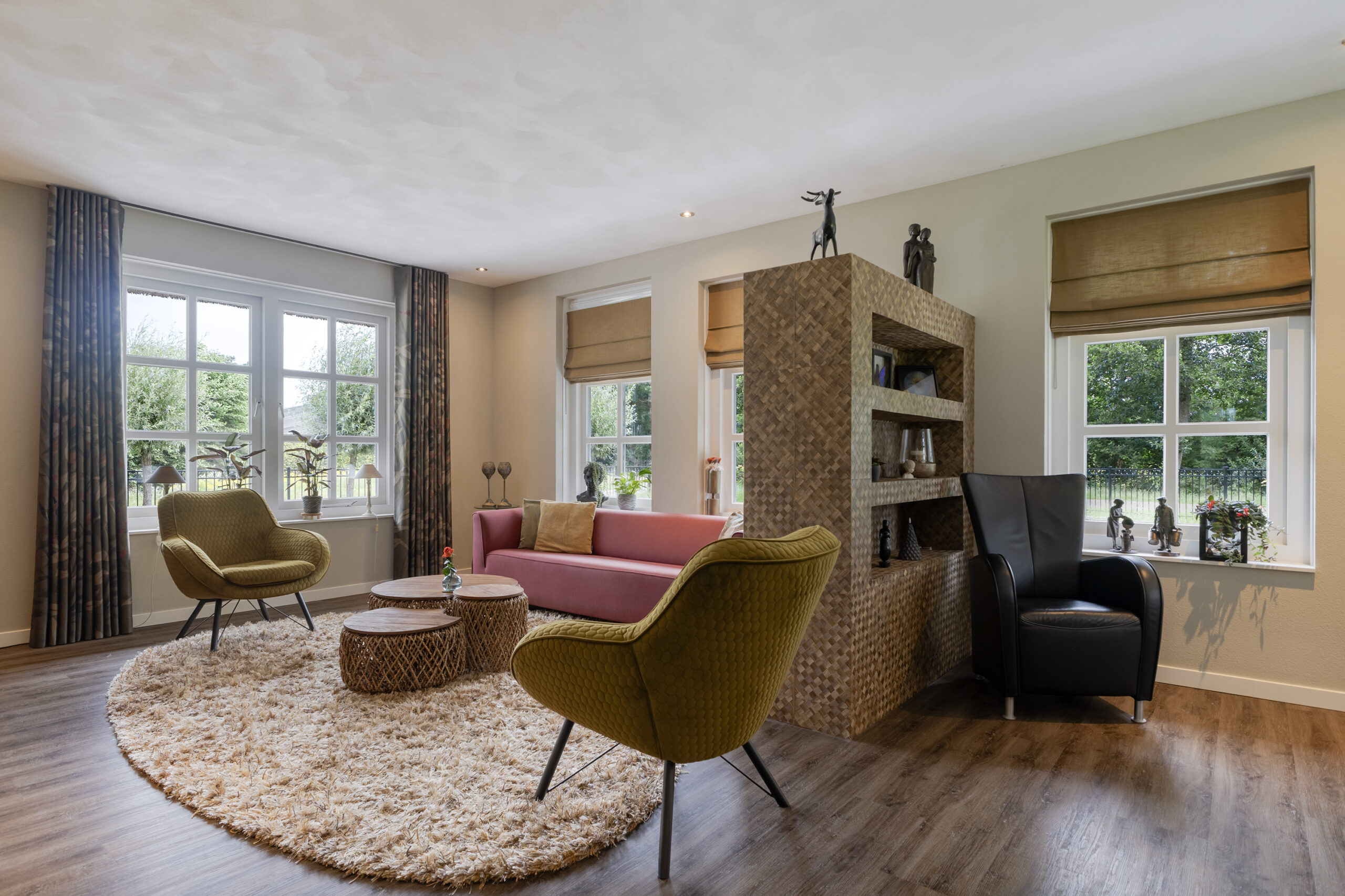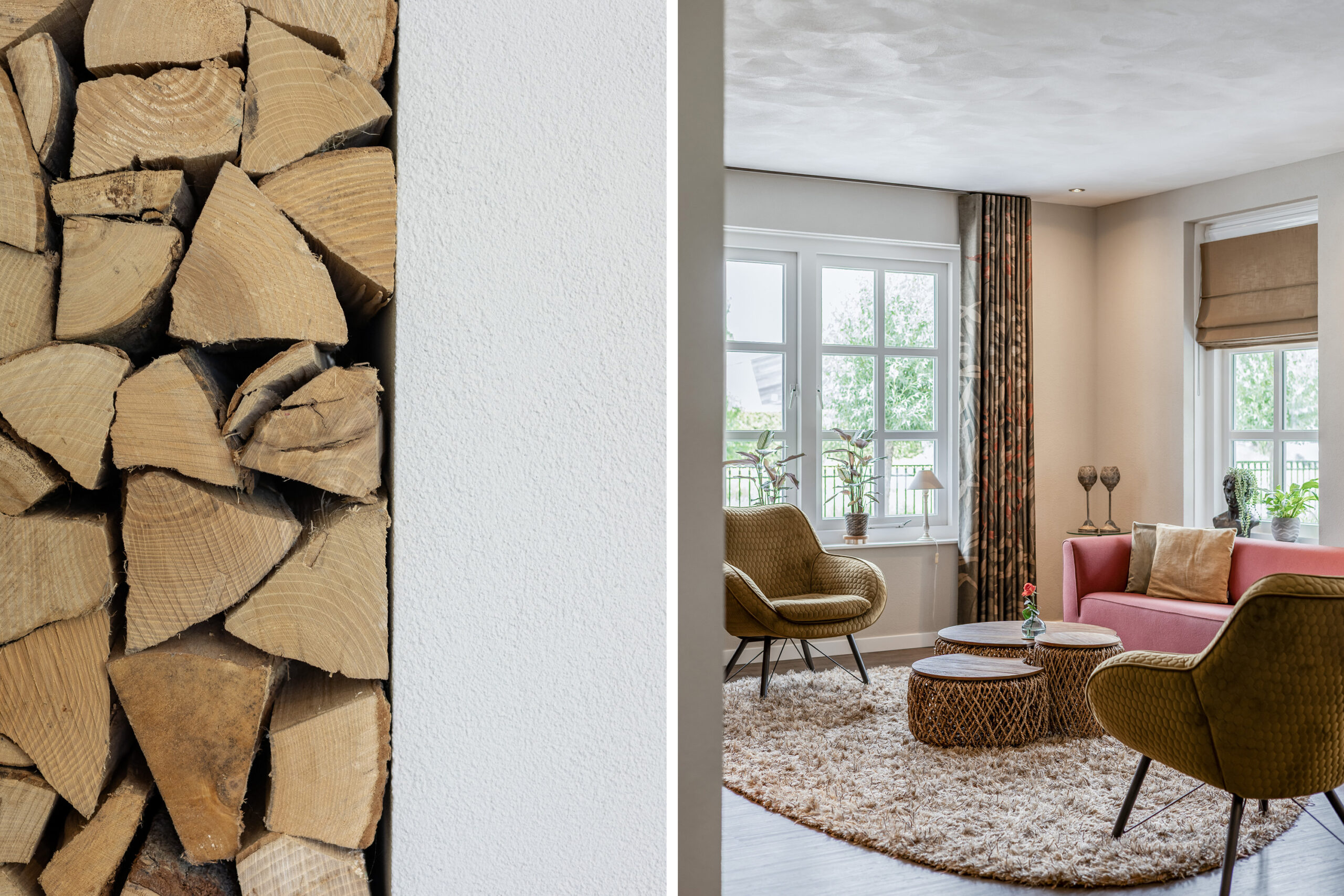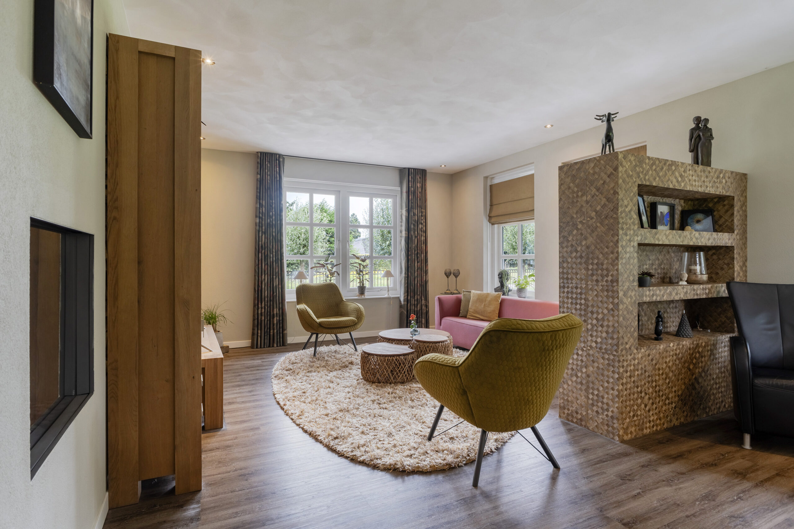 De woonkamer (38 m²) ligt aan de voorzijde en wordt van de keuken gescheiden door een kleine wand met sfeervolle gashaard. Er is volop ruimte voor zowel een grote eethoek als een royale zithoek. De gehele verdieping is uitgerust met vloerverwarming.