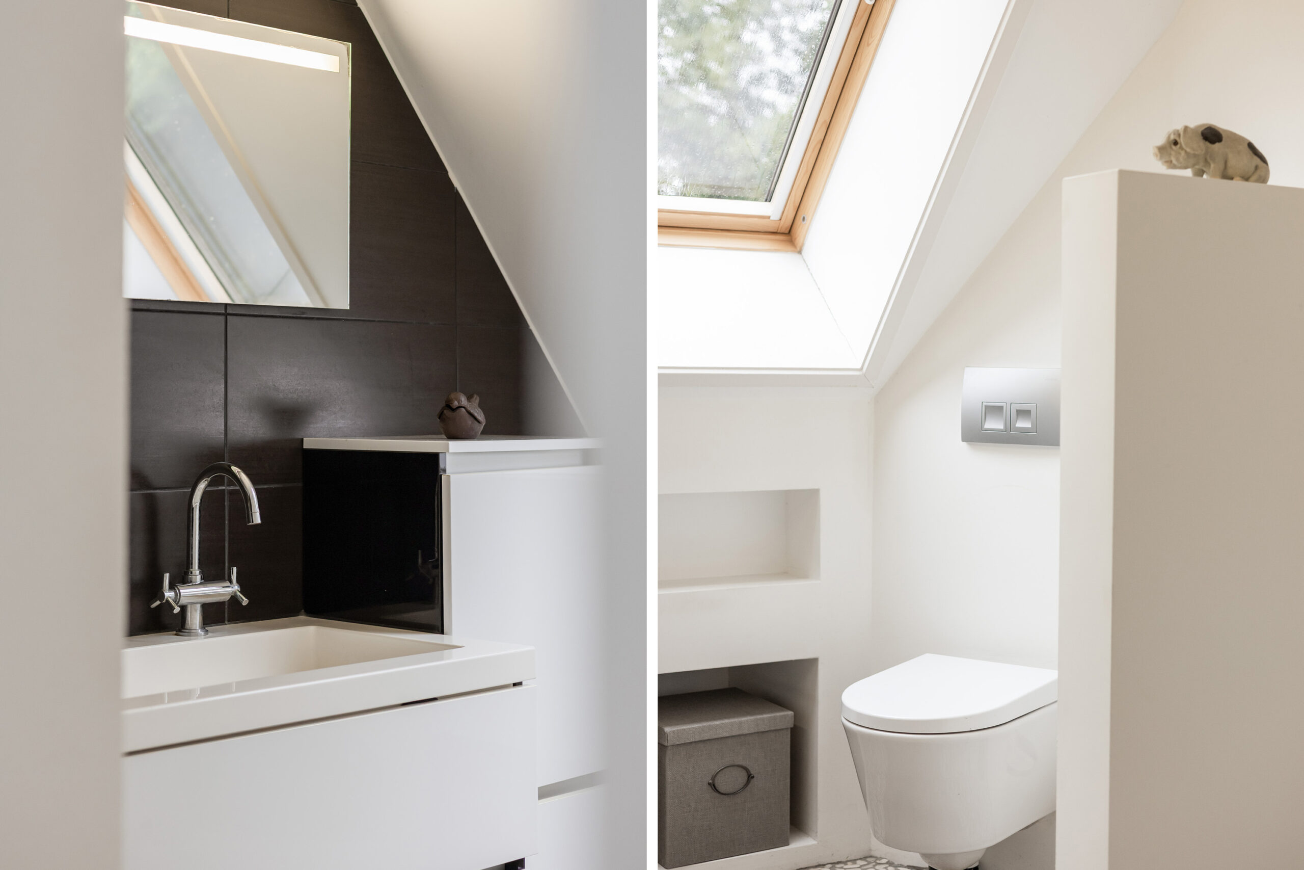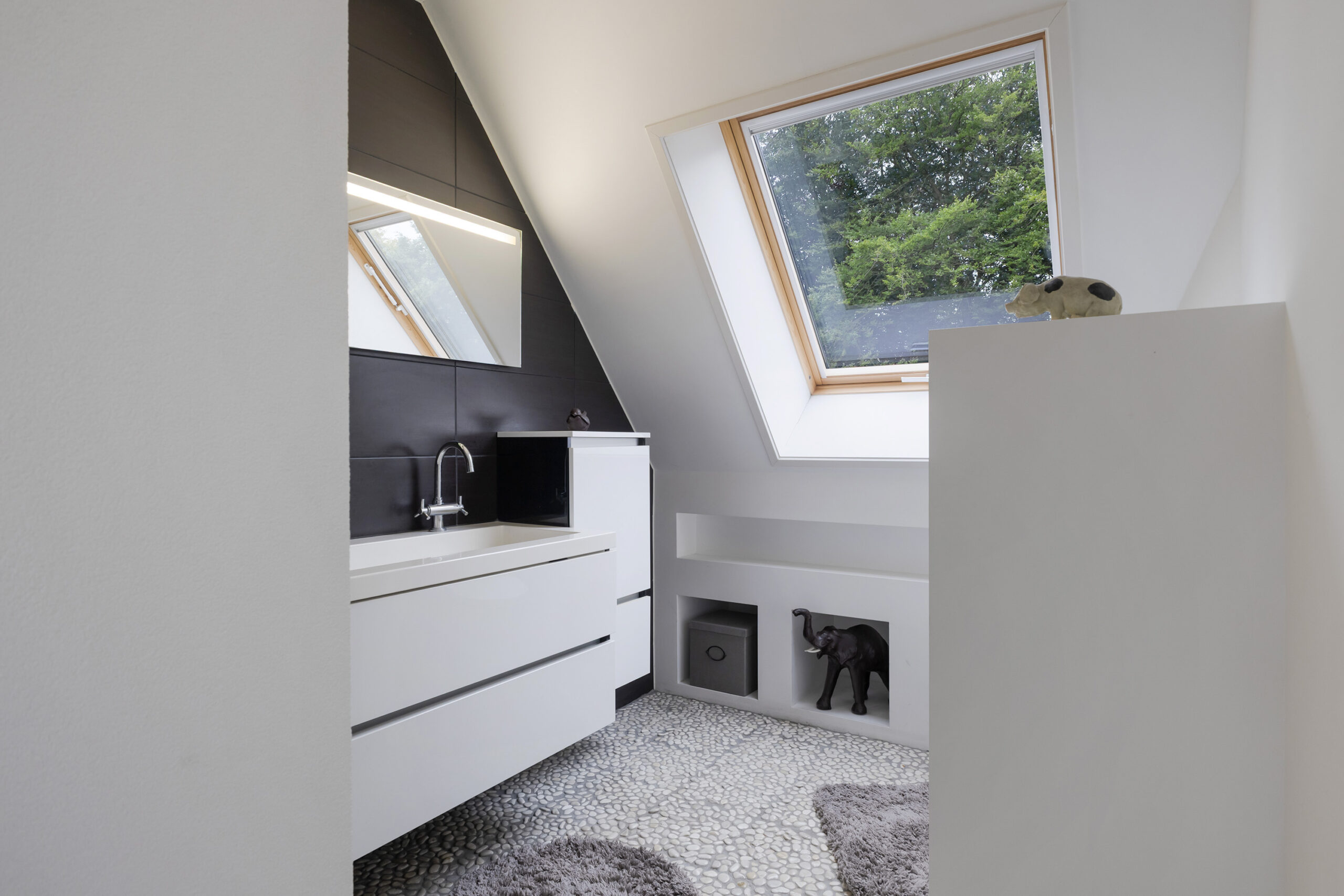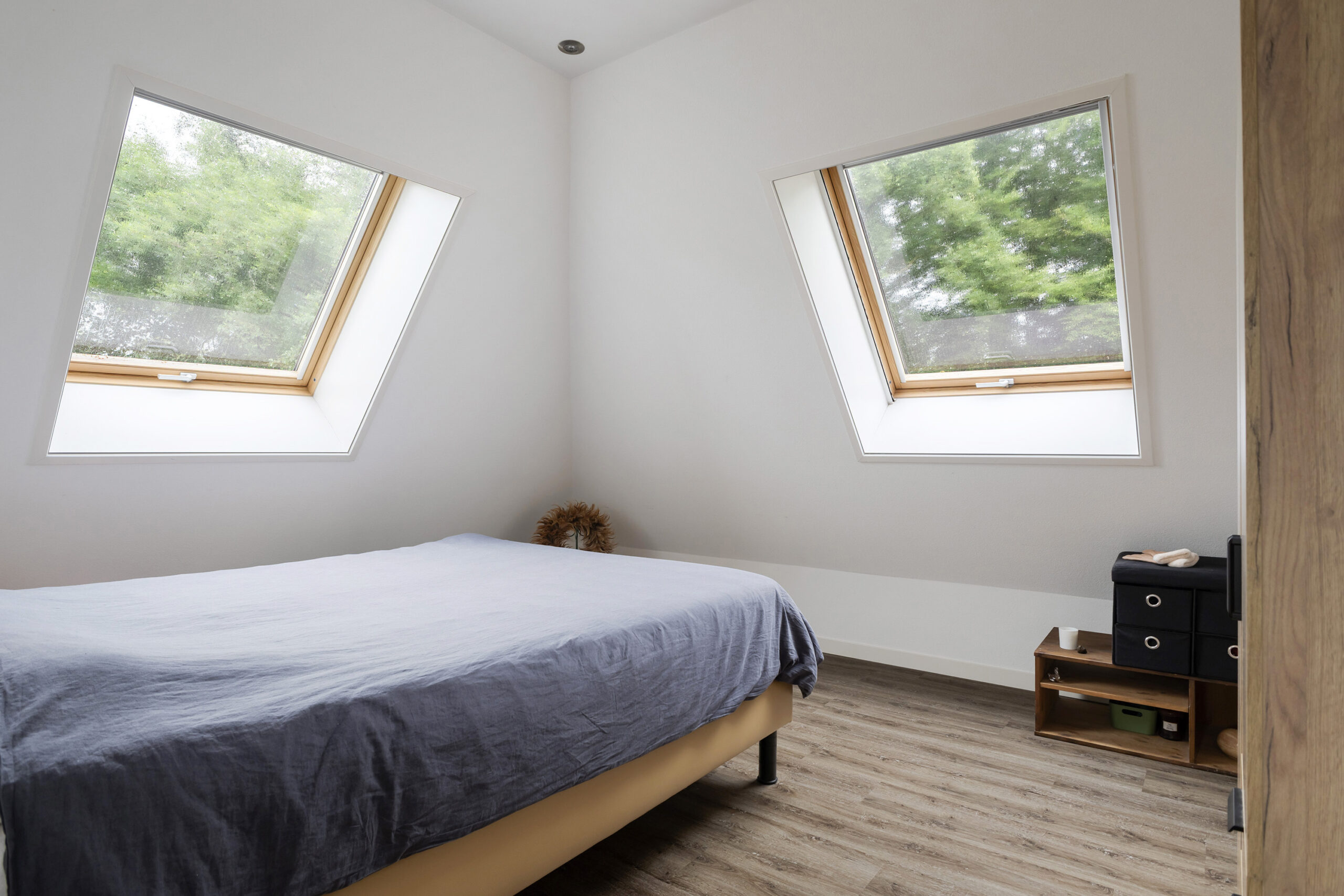 Aan de voorzijde bevinden zich twee slaapkamers, beide met twee dakramen, terwijl de vierde slaapkamer compacter is en een vaste trapopgang heeft naar de zolderverdieping.