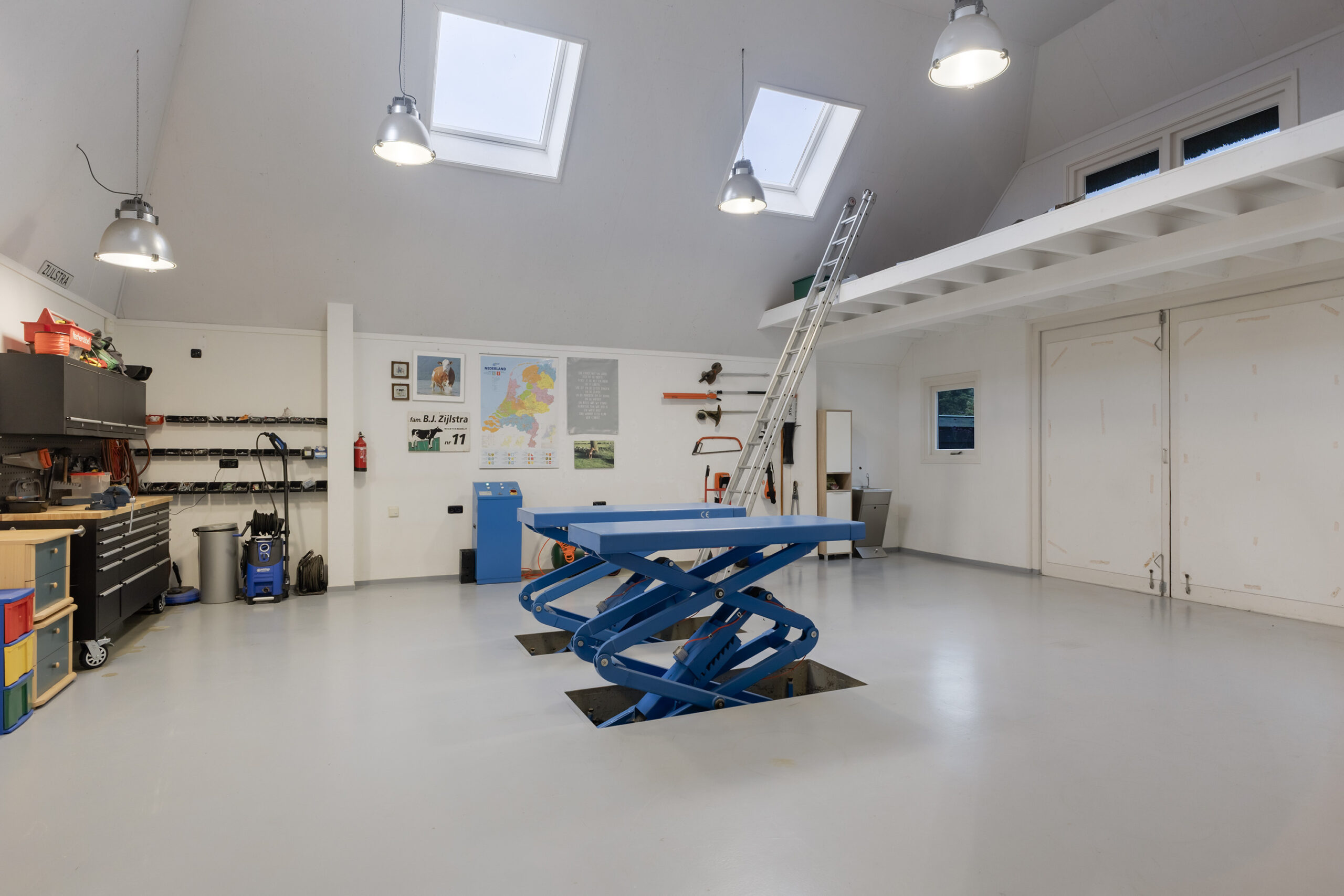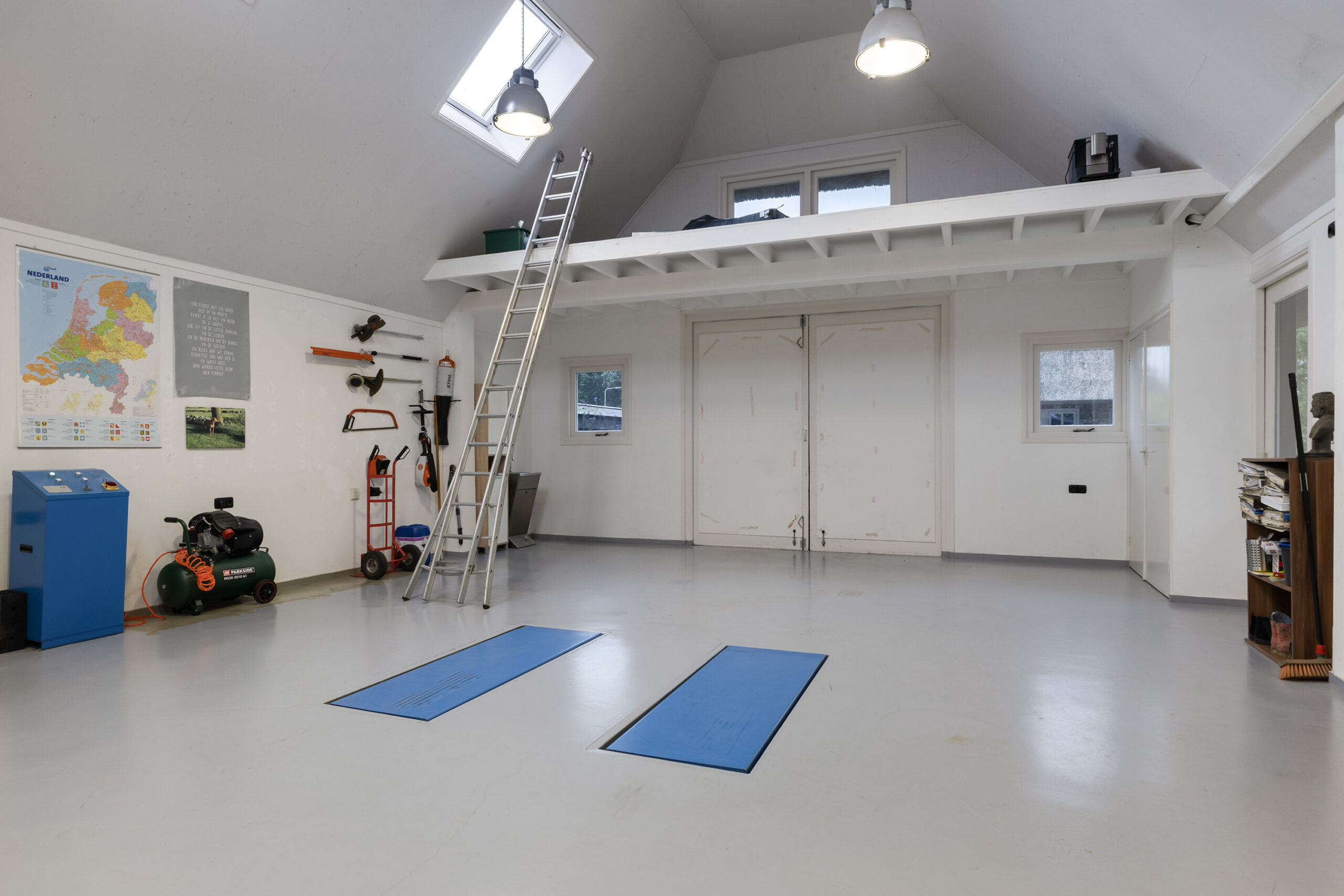 Achter op het erf staat een volledig geïsoleerd bijgebouw dat één geheel vormt met een berging (16,5 m²) met overkapping en een royale L-vormige garage (86 m²) met open vide. De garage is voorzien van vloerverwarming, een vloeistof dichte laag en twee elektrisch bedienbare hefbruggen. Tussen de berging en de garage bevindt zich een multifunctionele ruimte met eveneens vloerverwarming, een toilet en een kitchenette. Deze ruimte heeft dubbele toegangsdeuren en biedt binnendoor toegang tot de garage.