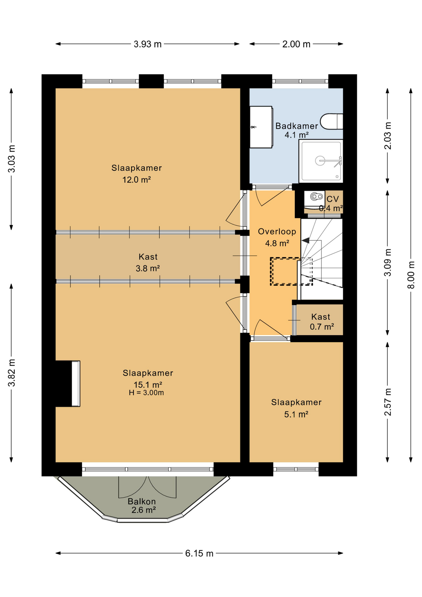 Op de verdieping bevinden zich 3 slaapkamers (15,1 m², 12 m² en 5,1 m²) en een moderne badkamer. Tussen de twee grootste slaapkamers, bevindt zich een ruime inbouwkast welke vanuit beide vertrekken te gebruiken is.