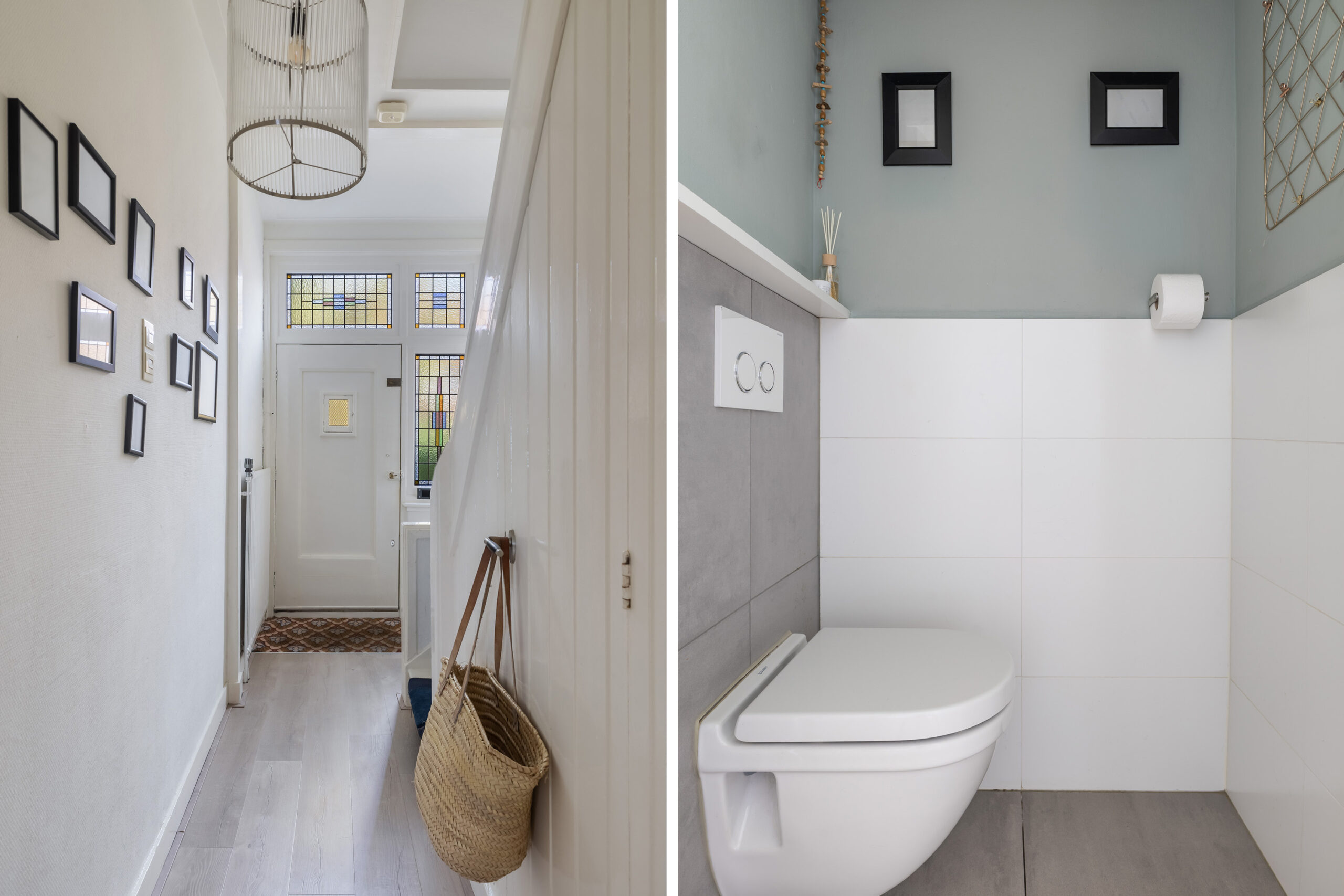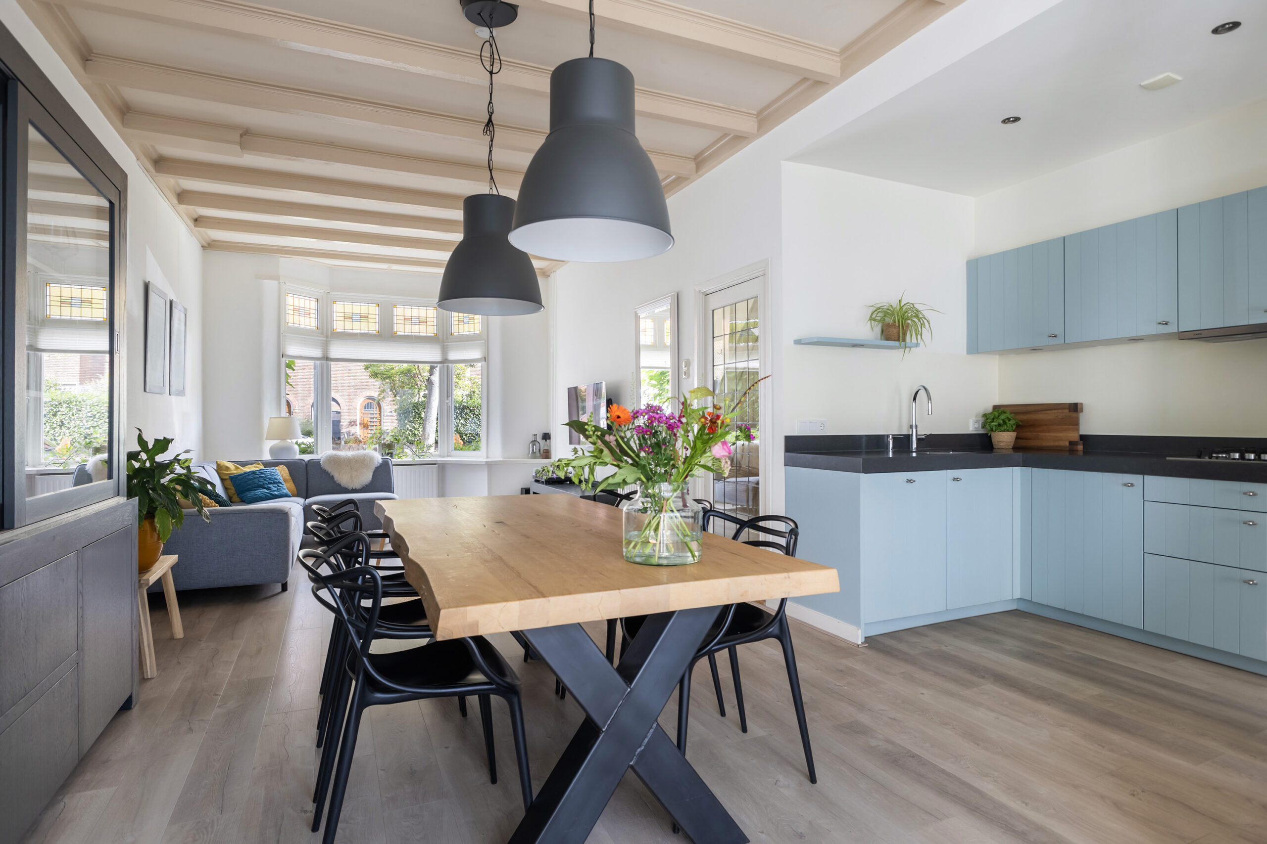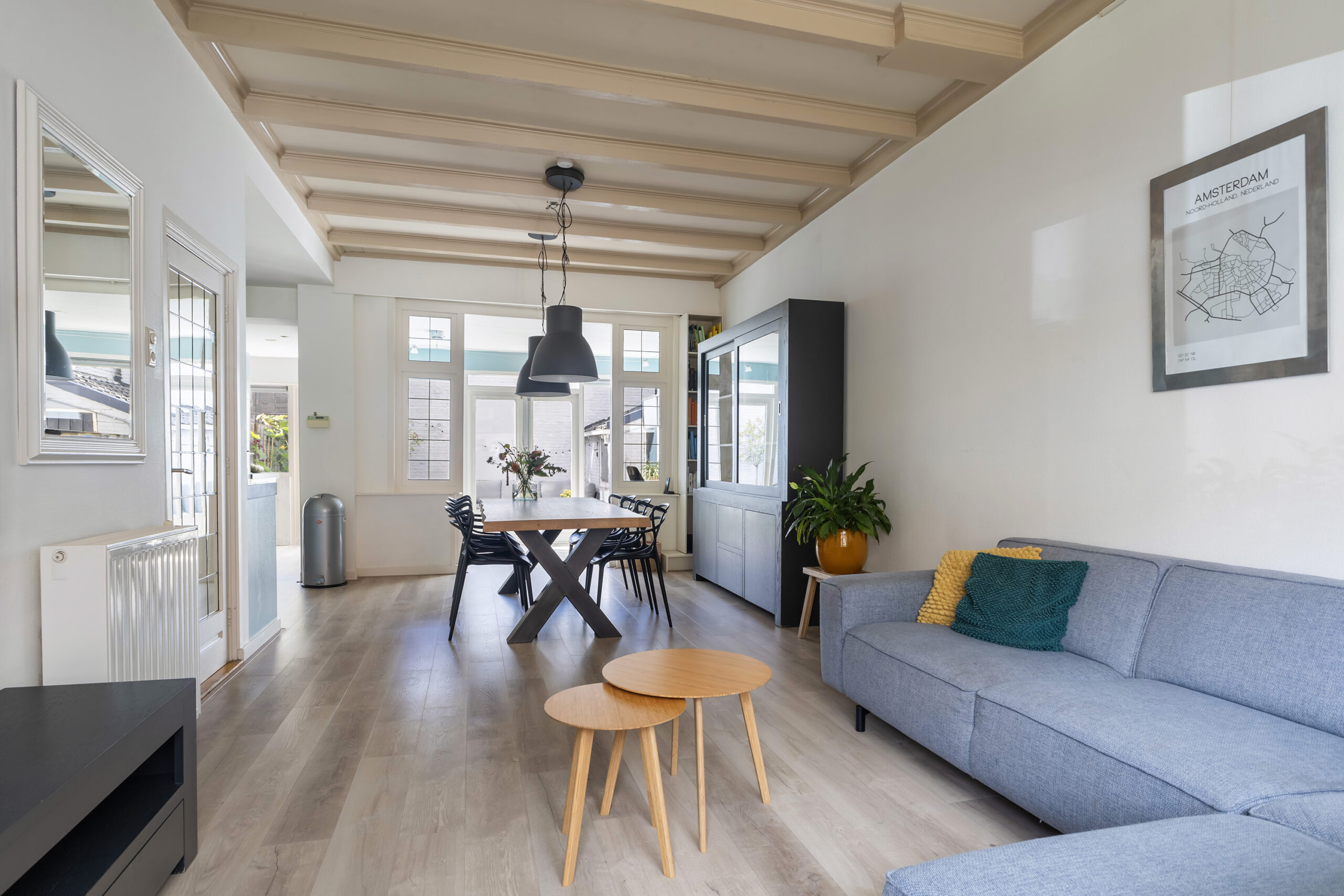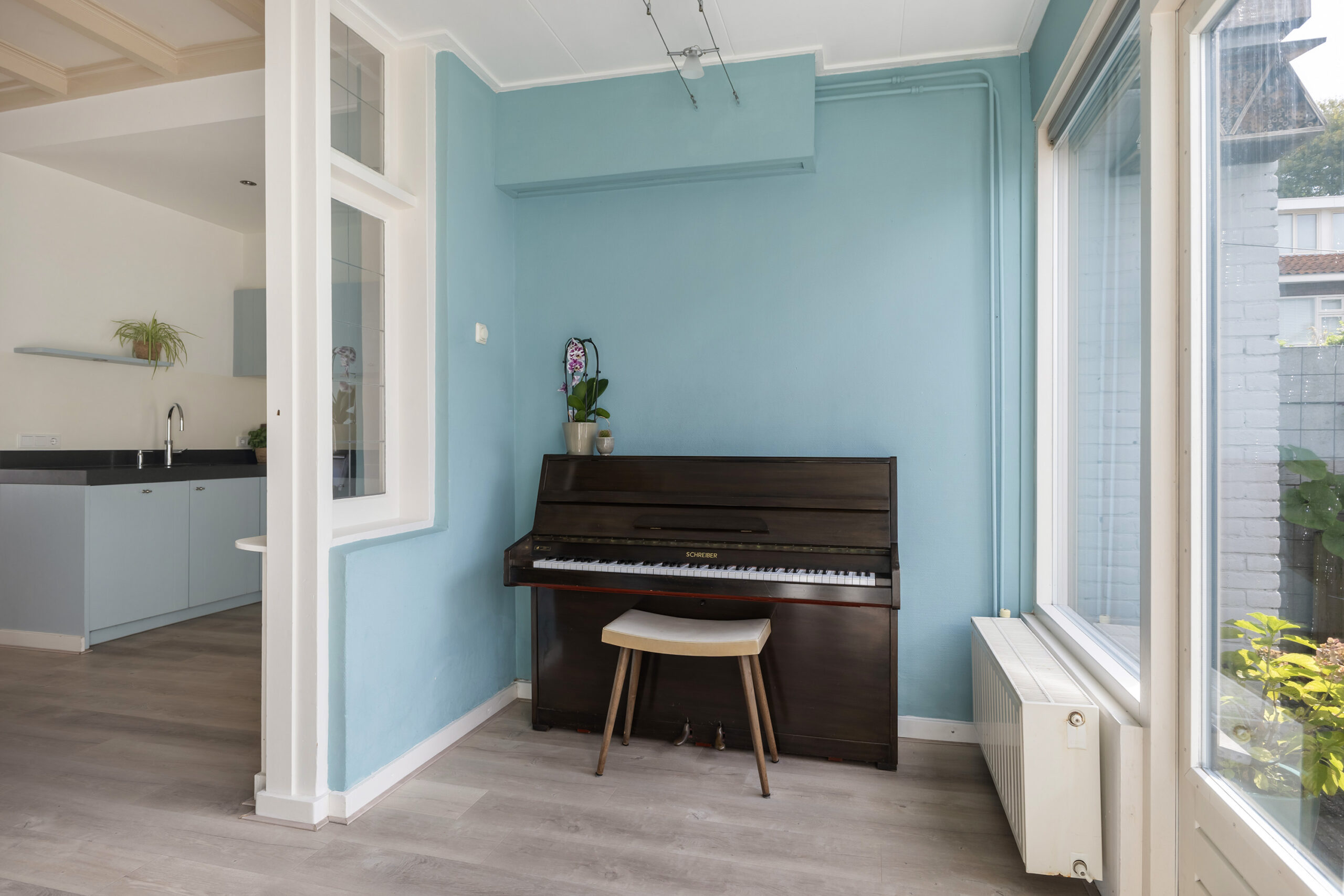 Middels de voortuin bereikbare entree met prachtige glas-in-lood ramen rondom de voordeur. De gang geeft toegang tot de berging onder de trap, het moderne toilet en de woonkamer. De sfeervolle woonkamer beschikt over een balkenplafond en heeft aan de voorzijde een erker met glas in lood ramen. Aangrenzend aan de woonkamer bevindt zich een aangebouwde achterkamer/serre, nu in gebruik als muziek/werkkamer of speelruimte voor de kinderen. De openslaande deuren geven toegang tot de achtertuin. De open keuken in hoekopstelling beschikt over een Quooker, Amerikaanse koelkast, vaatwasser en een gaskookplaat met afzuigkap. Doorloop naar de bijkeuken alwaar ook nog een gedeelte van de keuken, voorzien van een oven, werkblad en kastruimte en een deur naar de achtertuin.