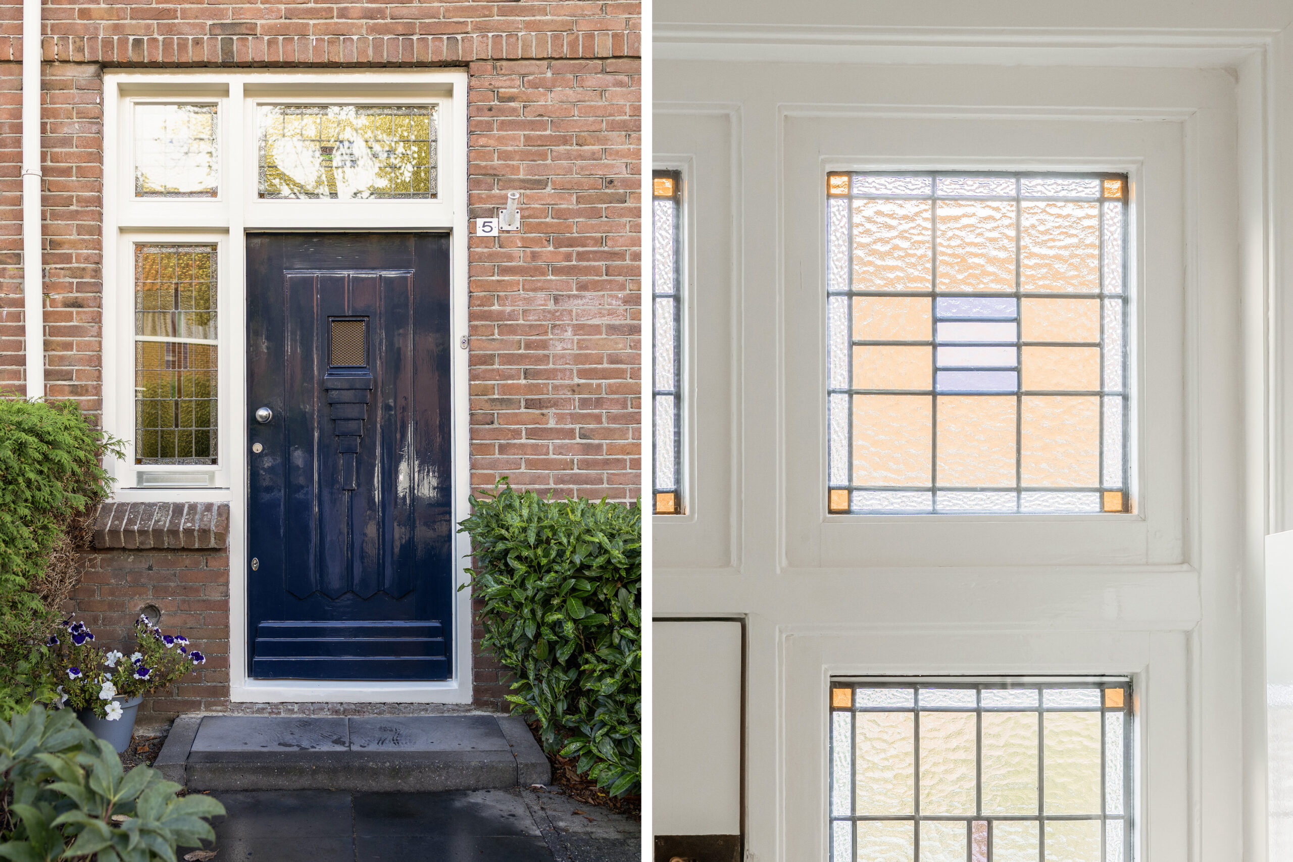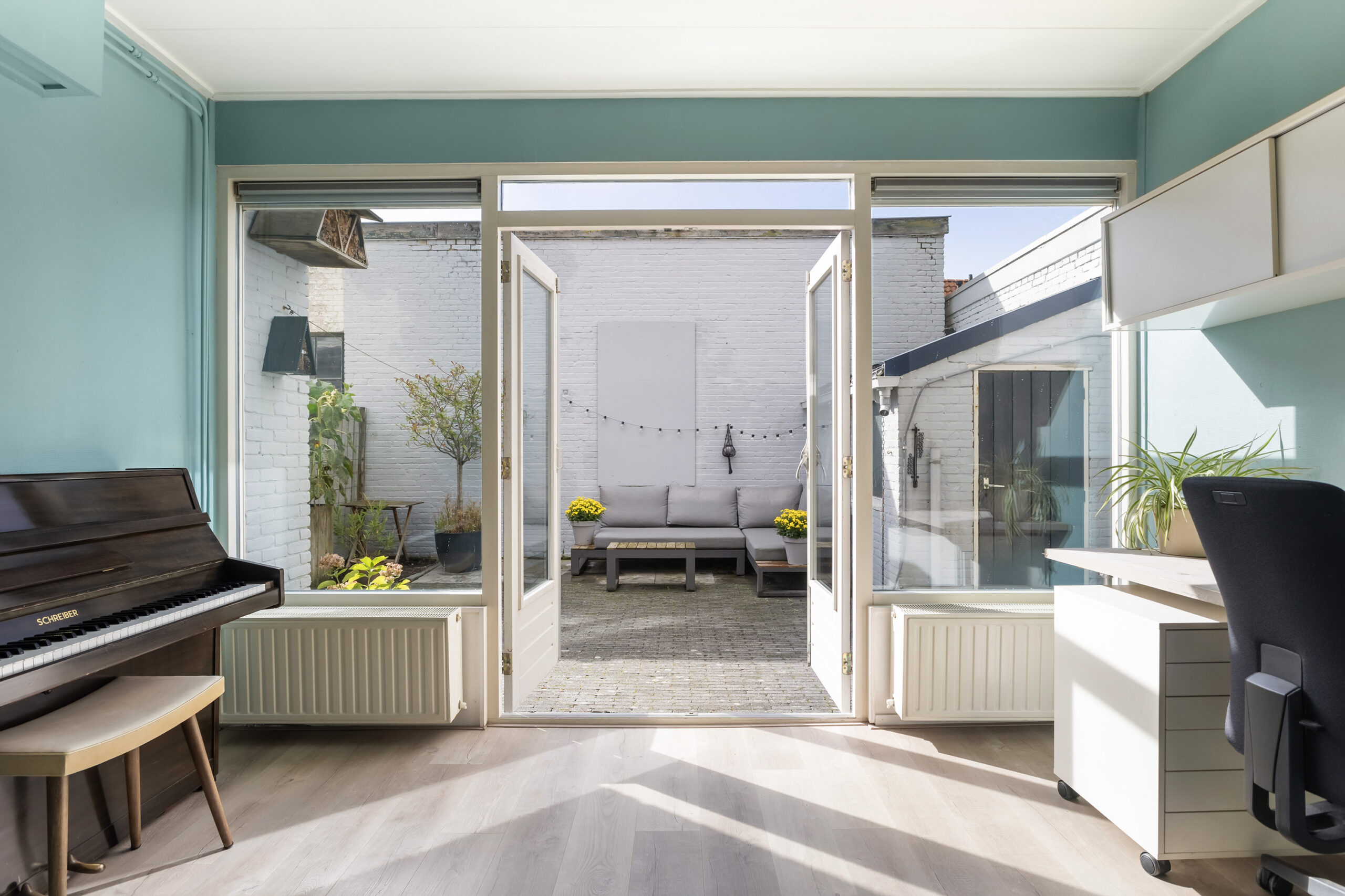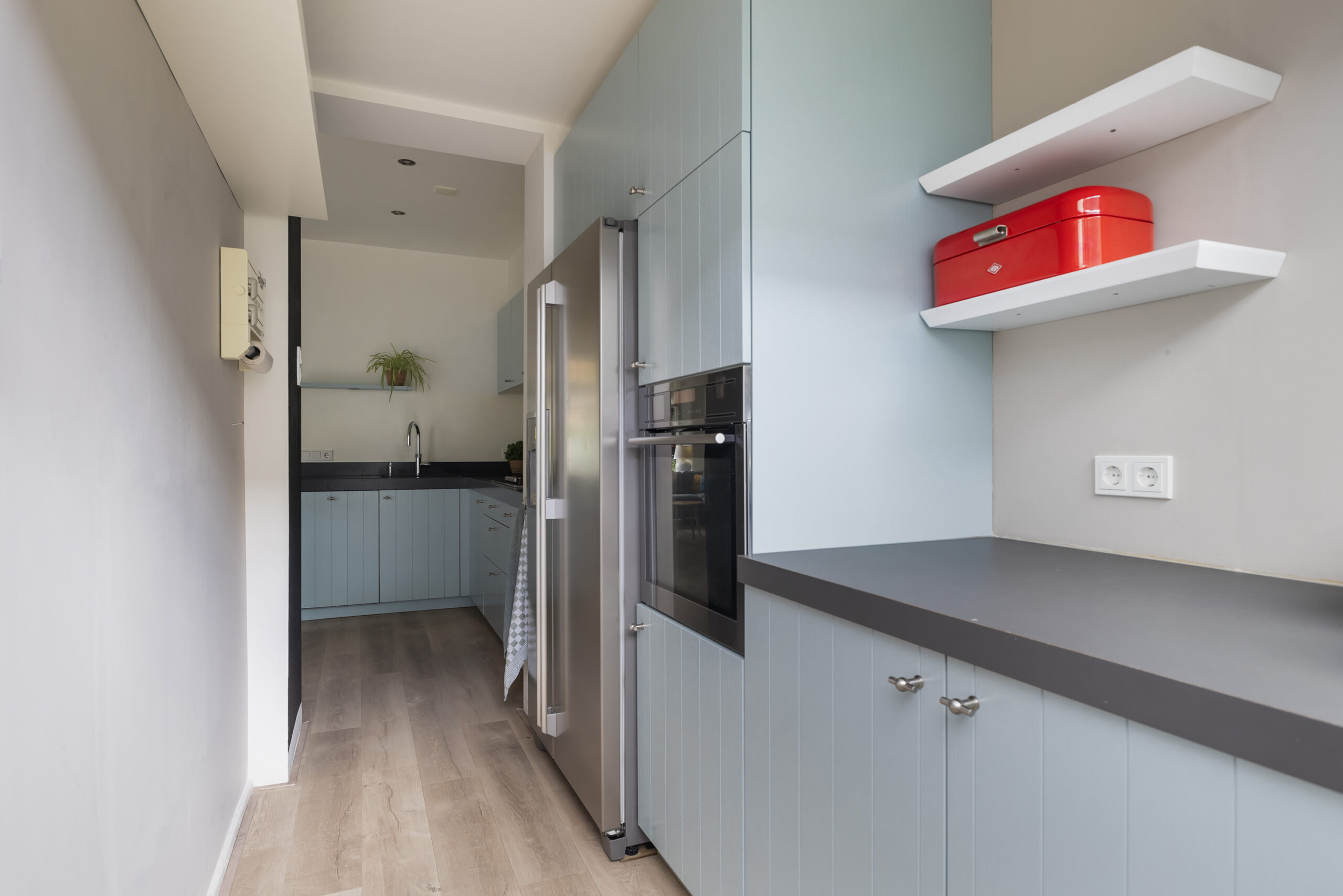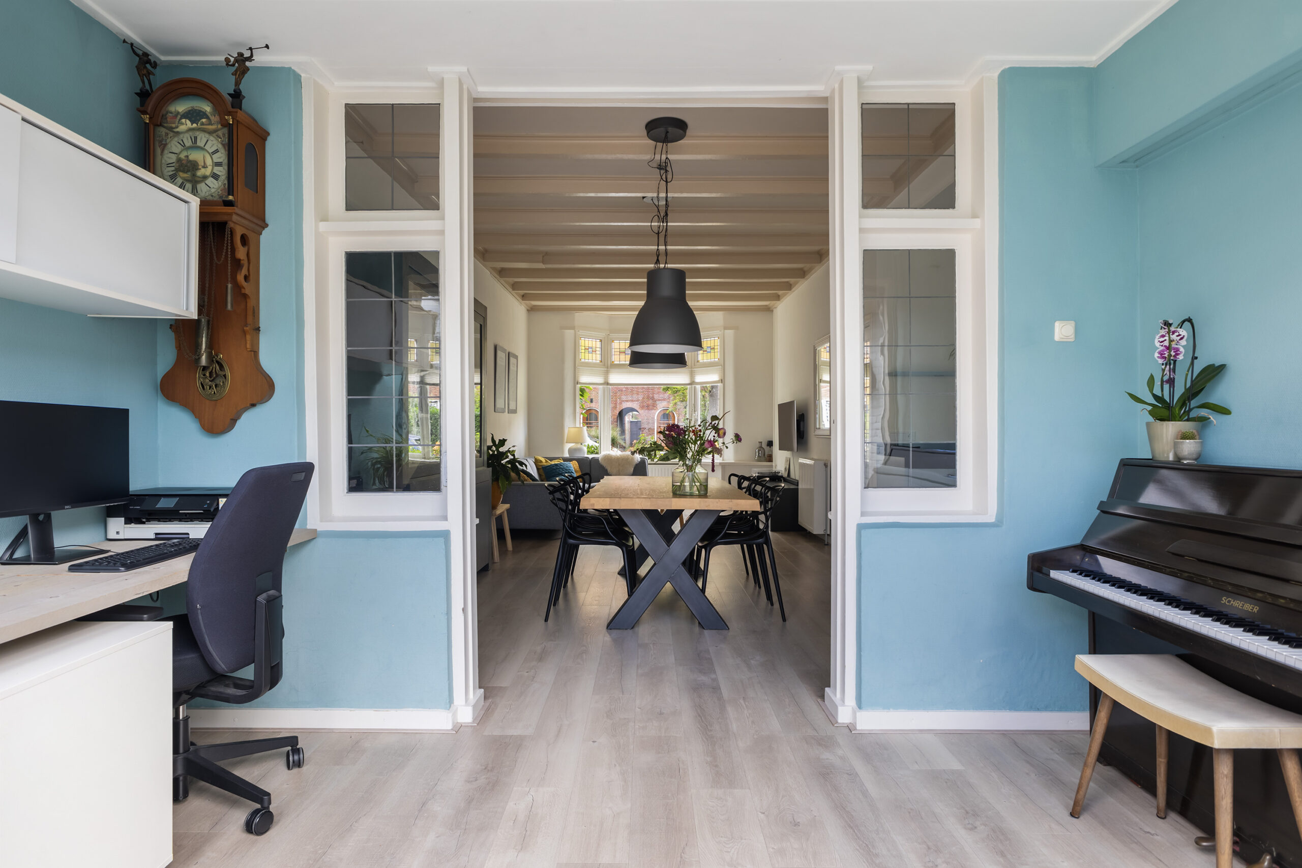 Middels de voortuin bereikbare entree met prachtige glas-in-lood ramen rondom de voordeur. De gang geeft toegang tot de berging onder de trap, het moderne toilet en de woonkamer. De sfeervolle woonkamer beschikt over een balkenplafond en heeft aan de voorzijde een erker met glas in lood ramen. Aangrenzend aan de woonkamer bevindt zich een aangebouwde achterkamer/serre, nu in gebruik als muziek/werkkamer of speelruimte voor de kinderen. De openslaande deuren geven toegang tot de achtertuin. De open keuken in hoekopstelling beschikt over een Quooker, Amerikaanse koelkast, vaatwasser en een gaskookplaat met afzuigkap. Doorloop naar de bijkeuken alwaar ook nog een gedeelte van de keuken, voorzien van een oven, werkblad en kastruimte en een deur naar de achtertuin.