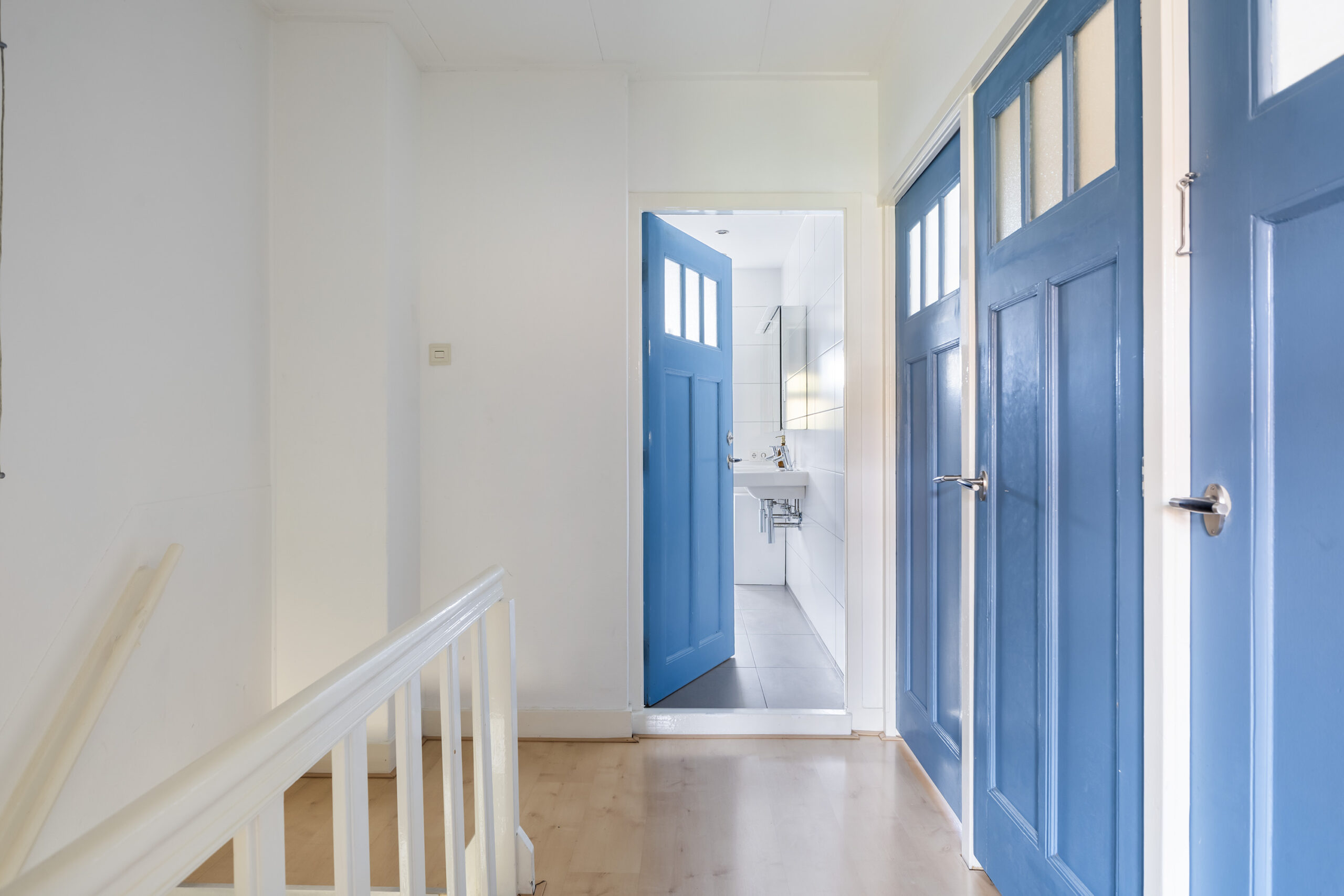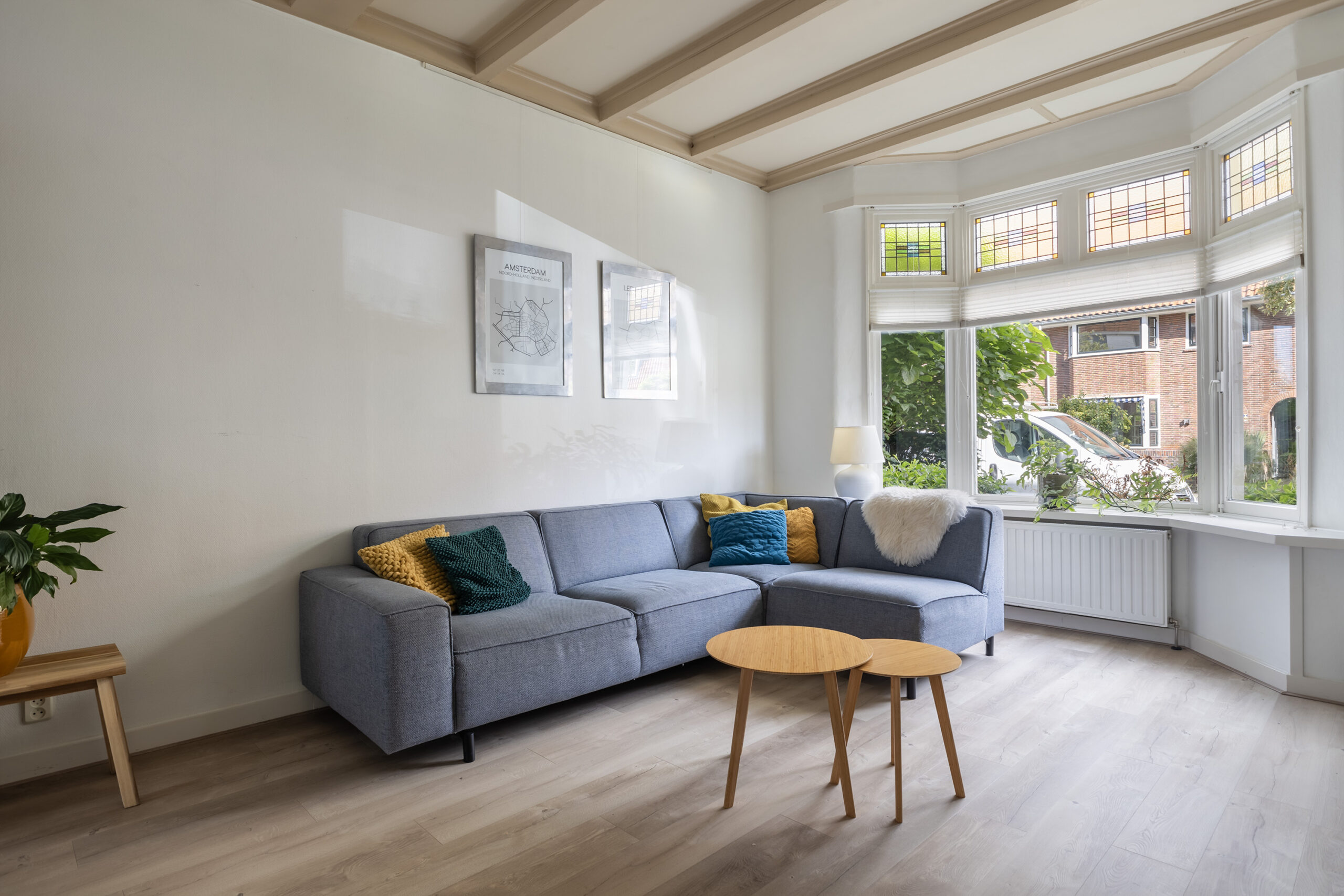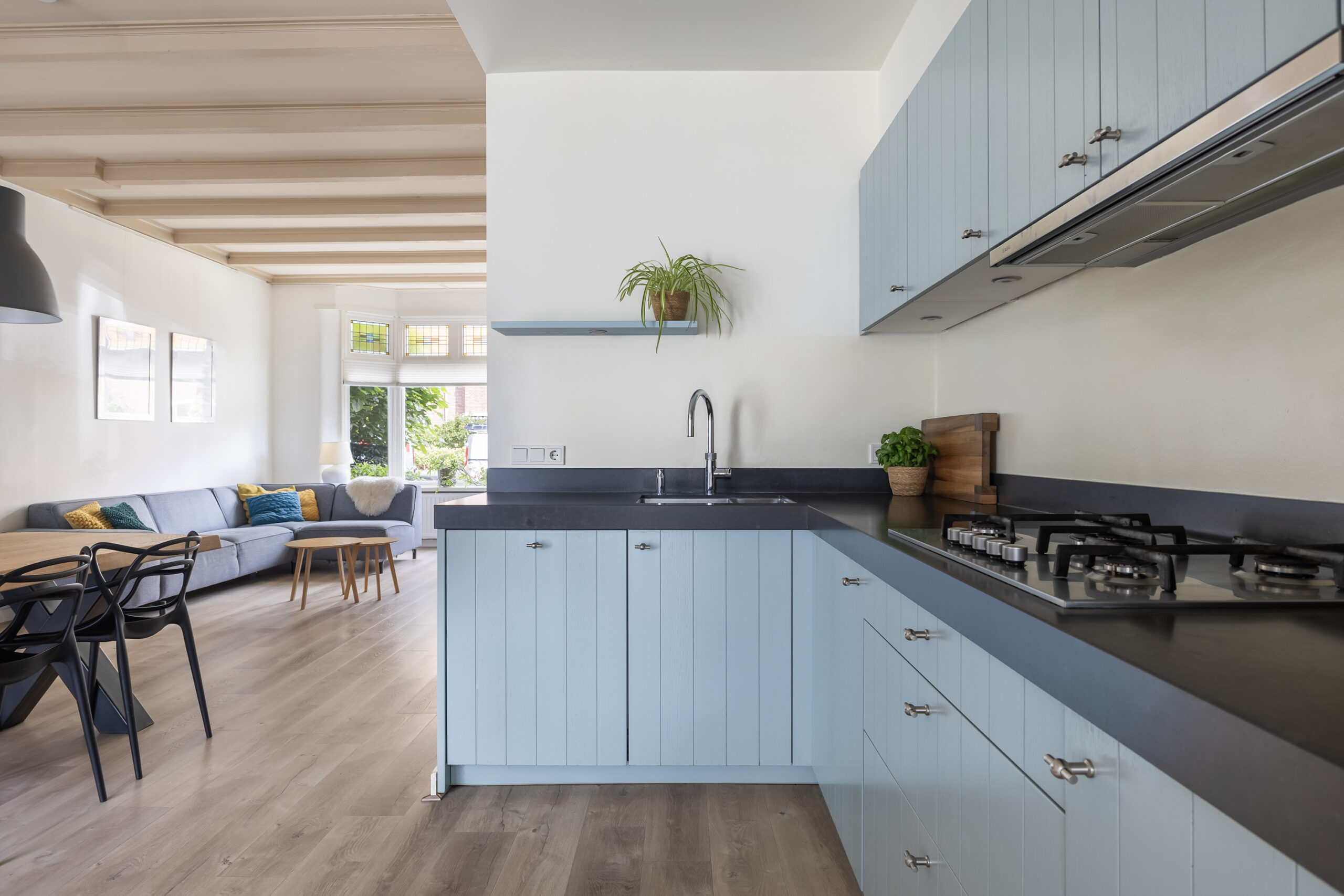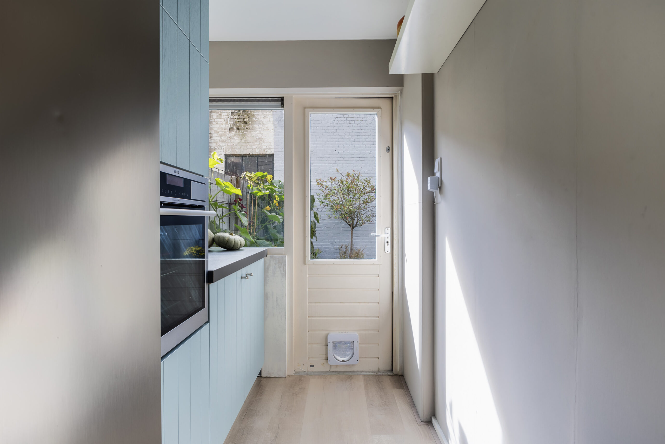 Middels de voortuin bereikbare entree met prachtige glas-in-lood ramen rondom de voordeur. De gang geeft toegang tot de berging onder de trap, het moderne toilet en de woonkamer. De sfeervolle woonkamer beschikt over een balkenplafond en heeft aan de voorzijde een erker met glas in lood ramen. Aangrenzend aan de woonkamer bevindt zich een aangebouwde achterkamer/serre, nu in gebruik als muziek/werkkamer of speelruimte voor de kinderen. De openslaande deuren geven toegang tot de achtertuin. De open keuken in hoekopstelling beschikt over een Quooker, Amerikaanse koelkast, vaatwasser en een gaskookplaat met afzuigkap. Doorloop naar de bijkeuken alwaar ook nog een gedeelte van de keuken, voorzien van een oven, werkblad en kastruimte en een deur naar de achtertuin.