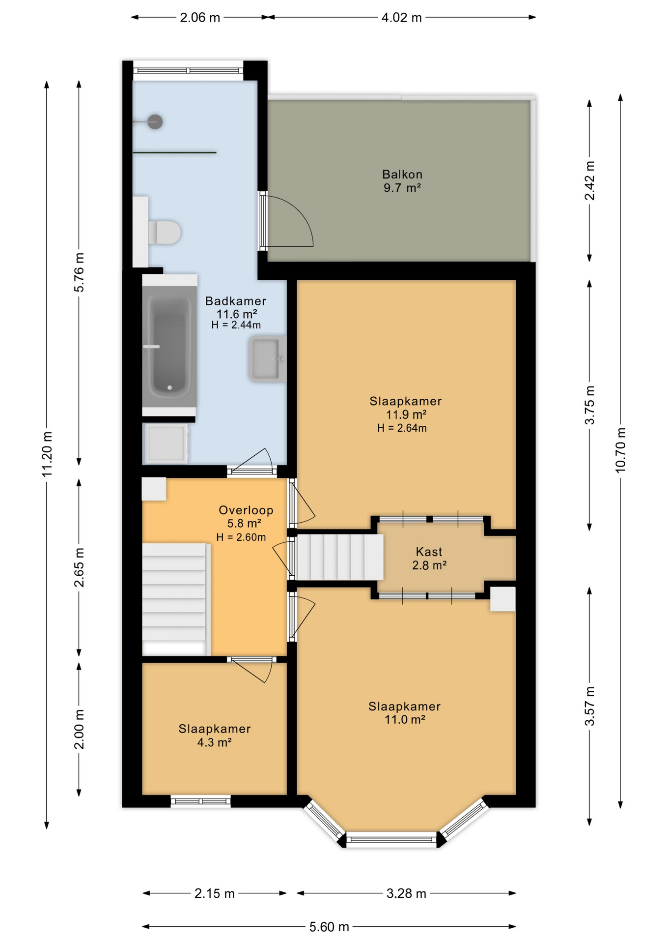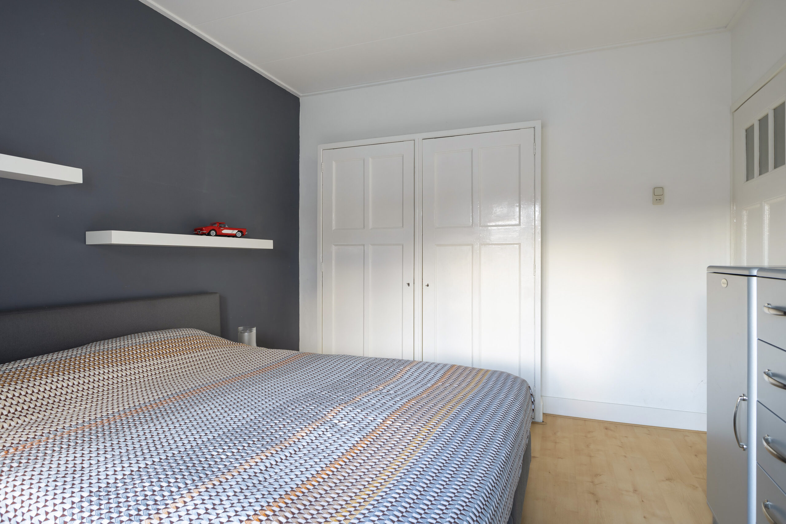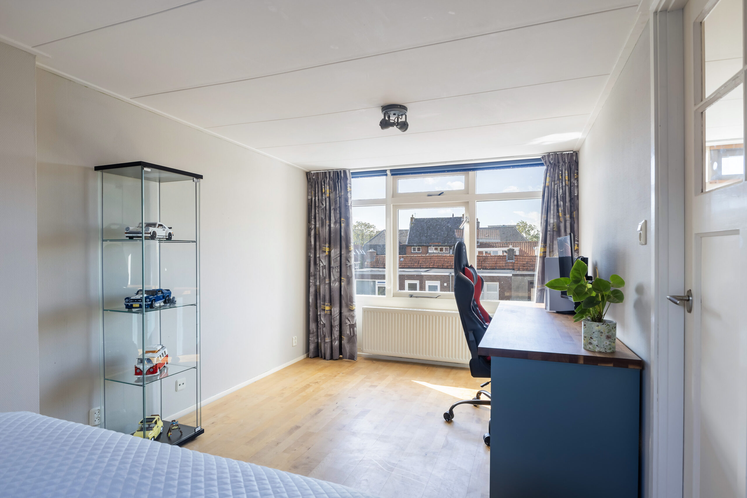 De middels de sierlijke trap bereikbare overloop geeft toegang tot de drie slaapkamers, de badkamer en de trap naar de tweede verdieping. Aan de voorzijde liggen de 1e en 2e slaapkamer van resp. 4,3 m² en een van 11,0 m² waarvan de grootste is voorzien van een erker en vaste kast. De 3e slaapkamer ligt aan de achterzijde, is bijna 12 m² groot en beschikt tevens over een vaste kast. Door het realiseren van een uitbouw is er een zéér ruime badkamer ontstaan. Er is een ligbad, 2e toilet, dubbele wastafel en een ruime inloopdouche met twee aparte douches. Tevens bevindt zich hier de wasmachineopstelling en is er een deur naar het balkon.