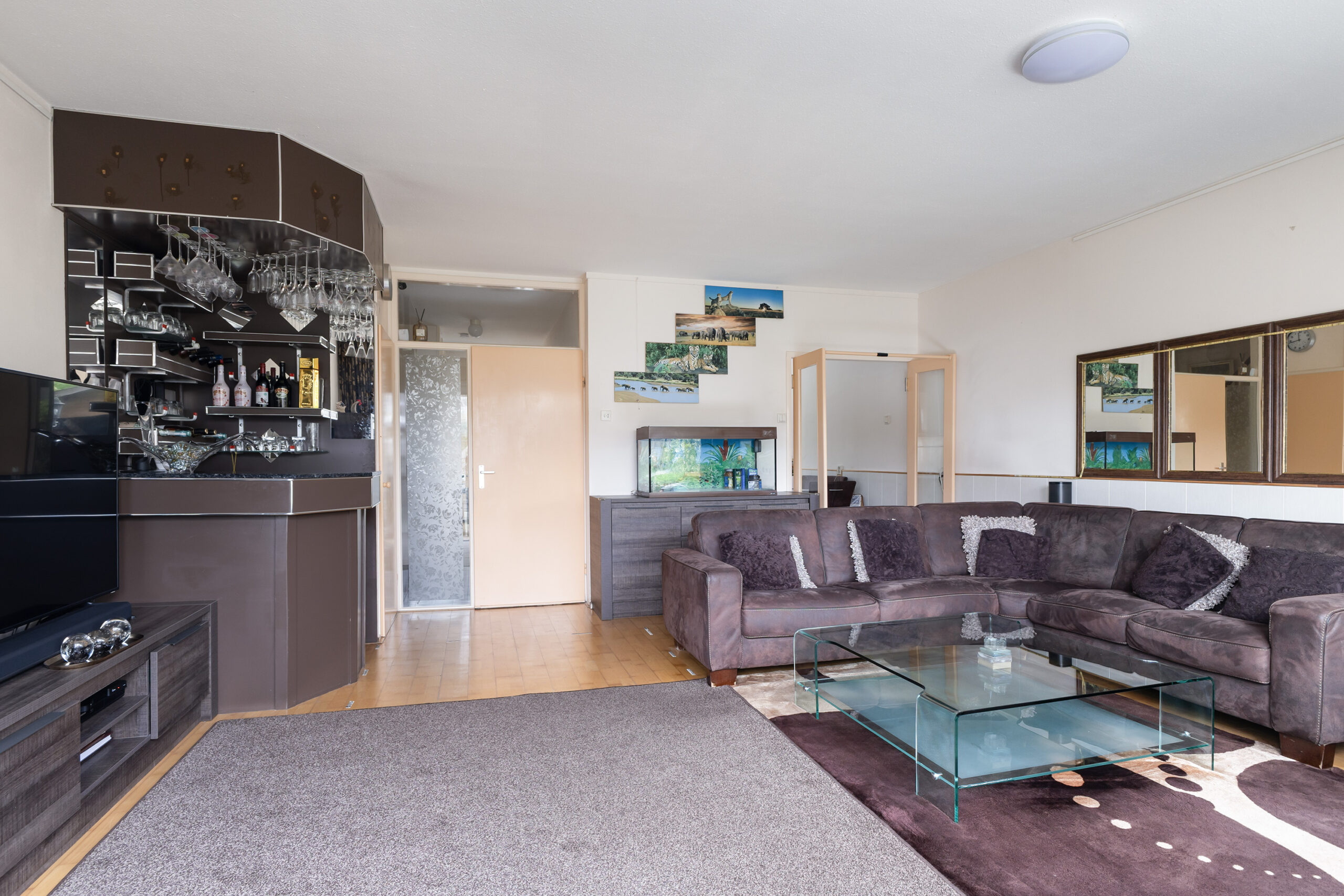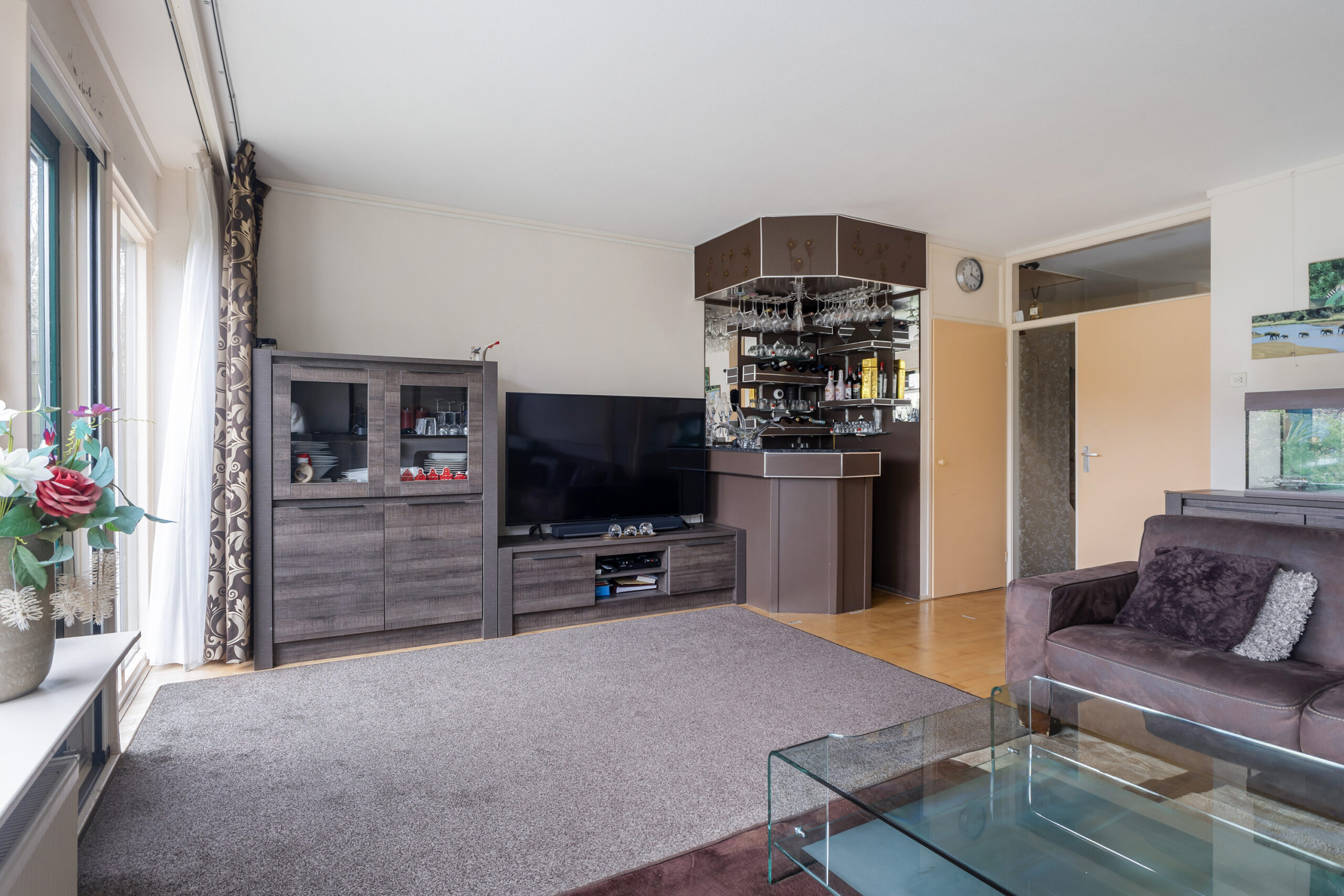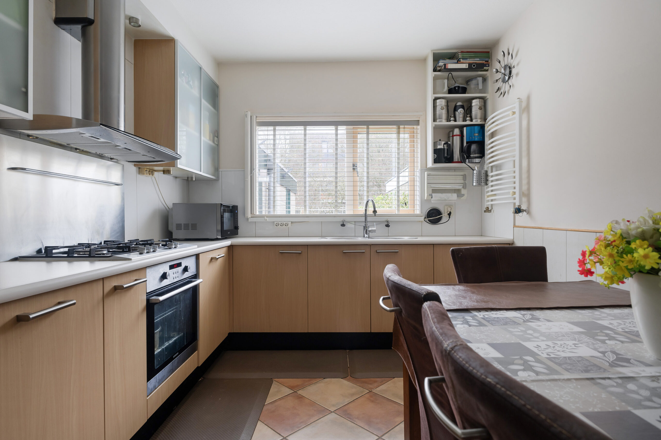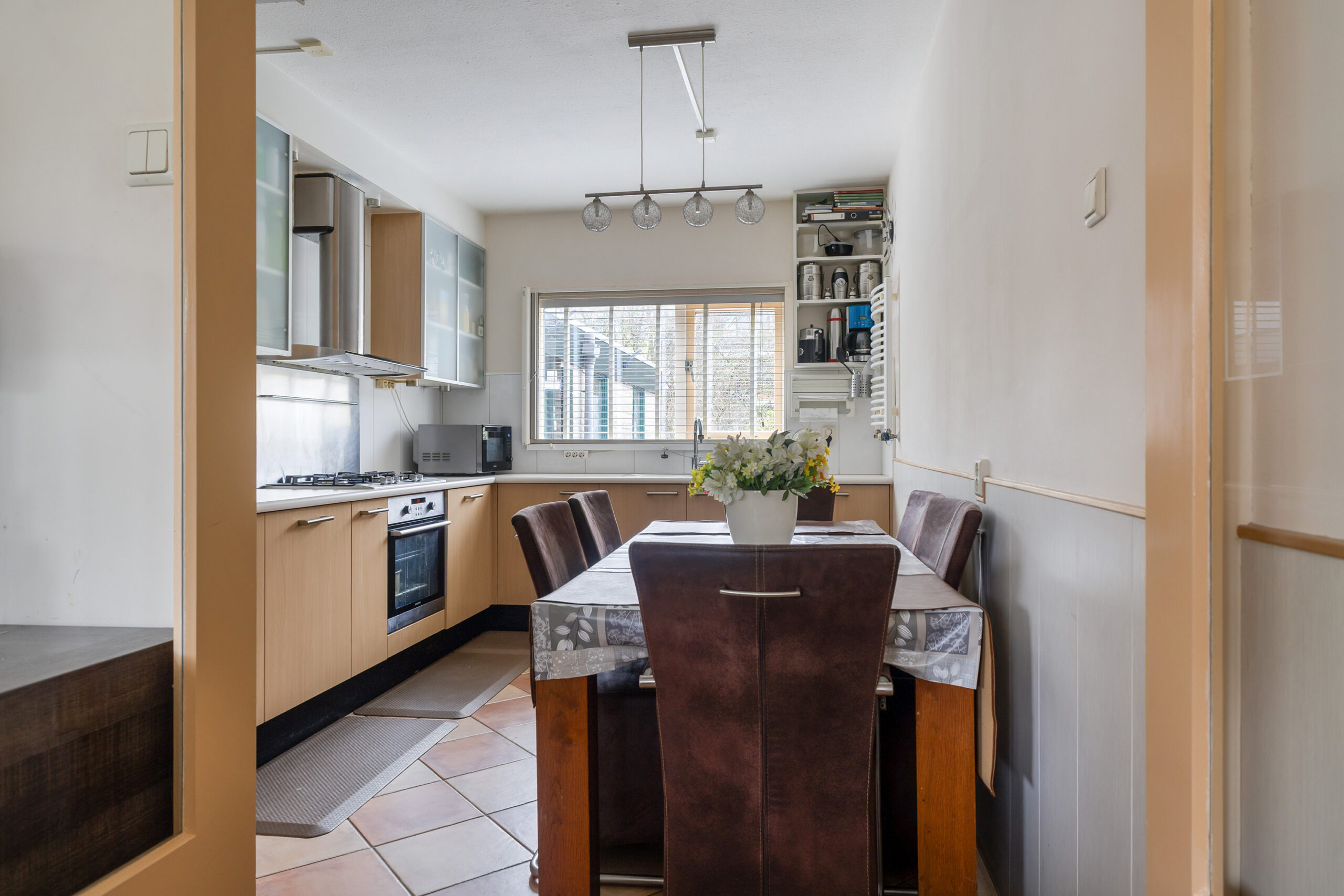 – lichte woonkamer met dichte keuken voorzien van inbouwapparatuur
