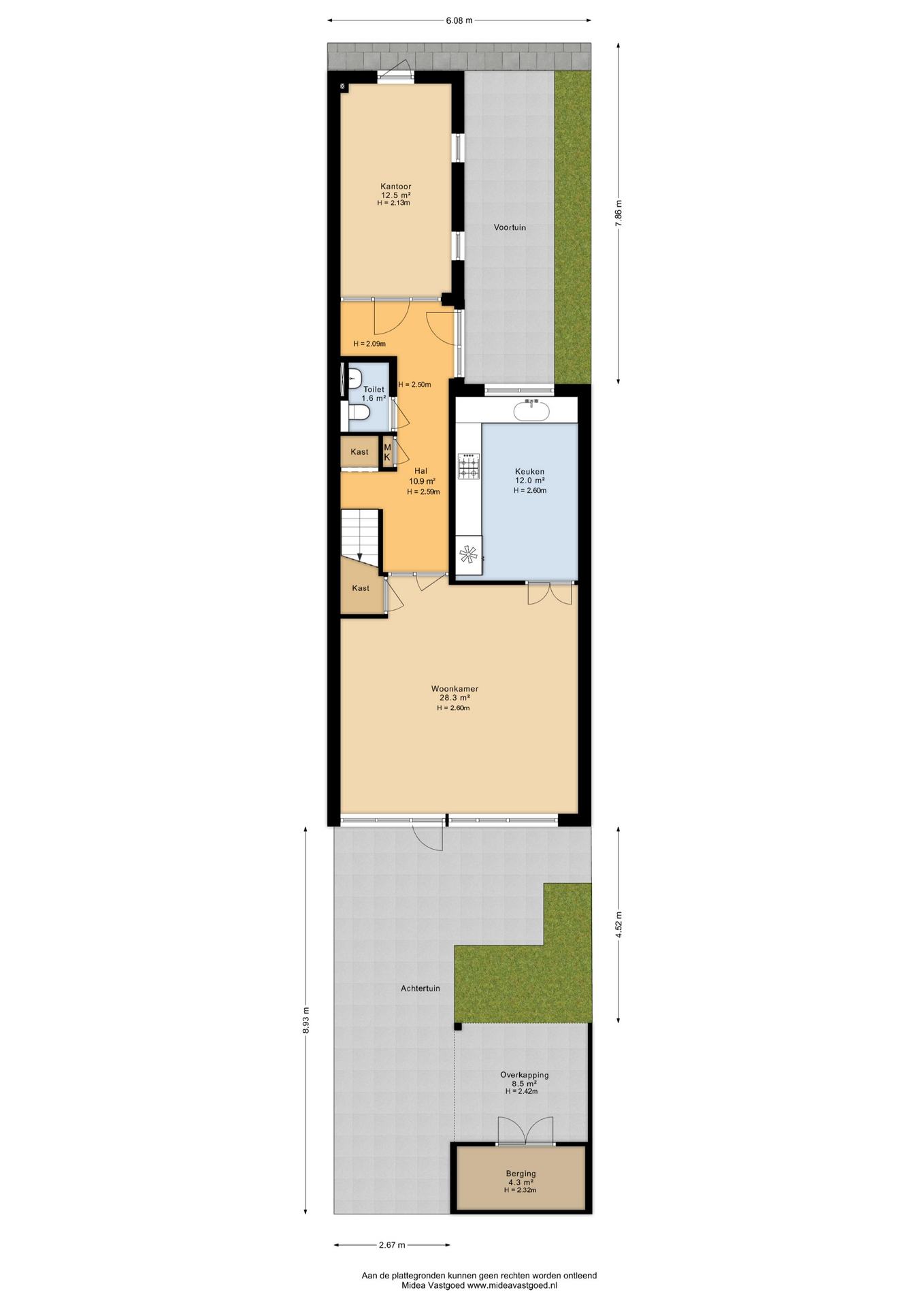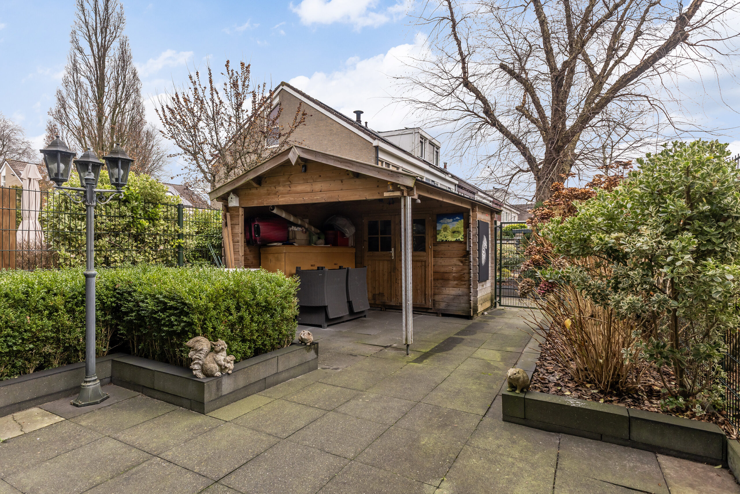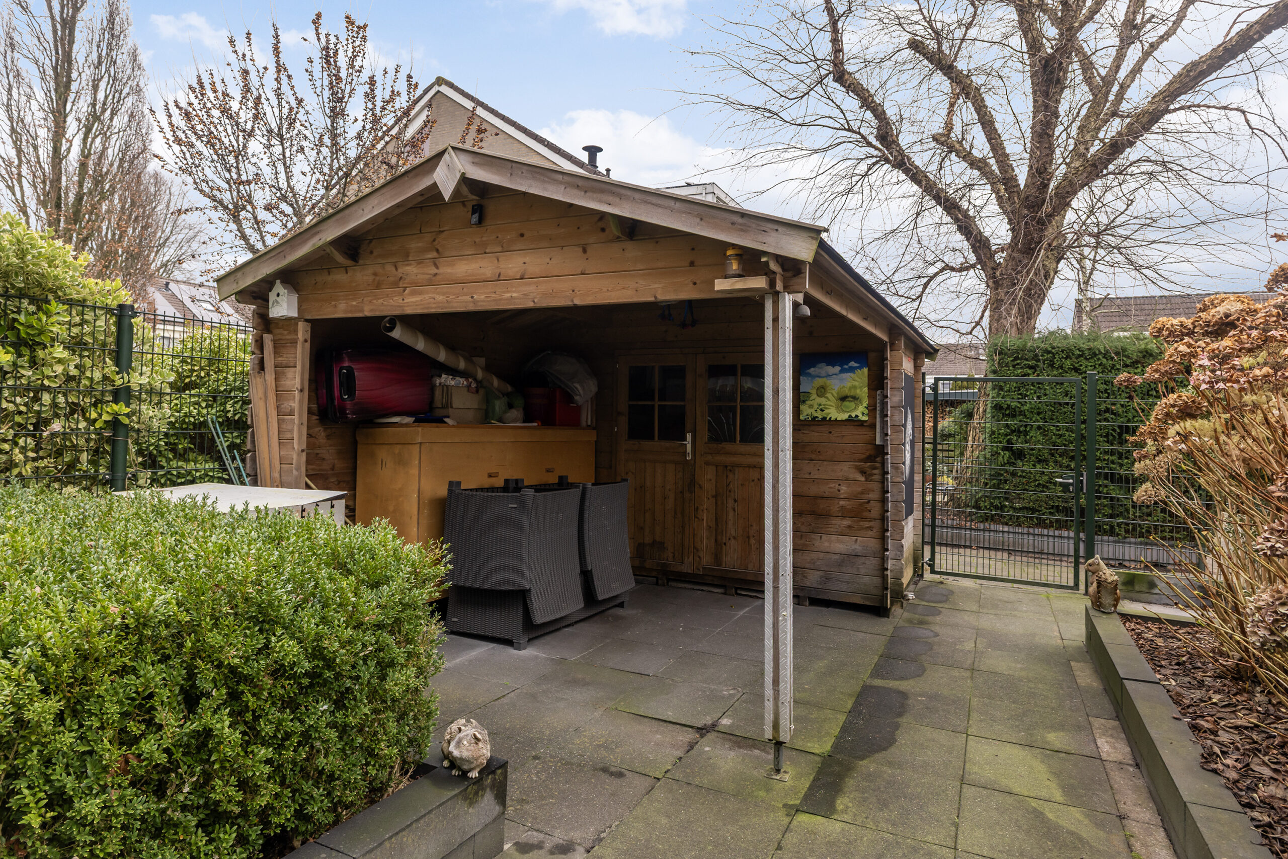 – achtertuin op het oosten voorzien van vrijstaande houten berging en een achterom