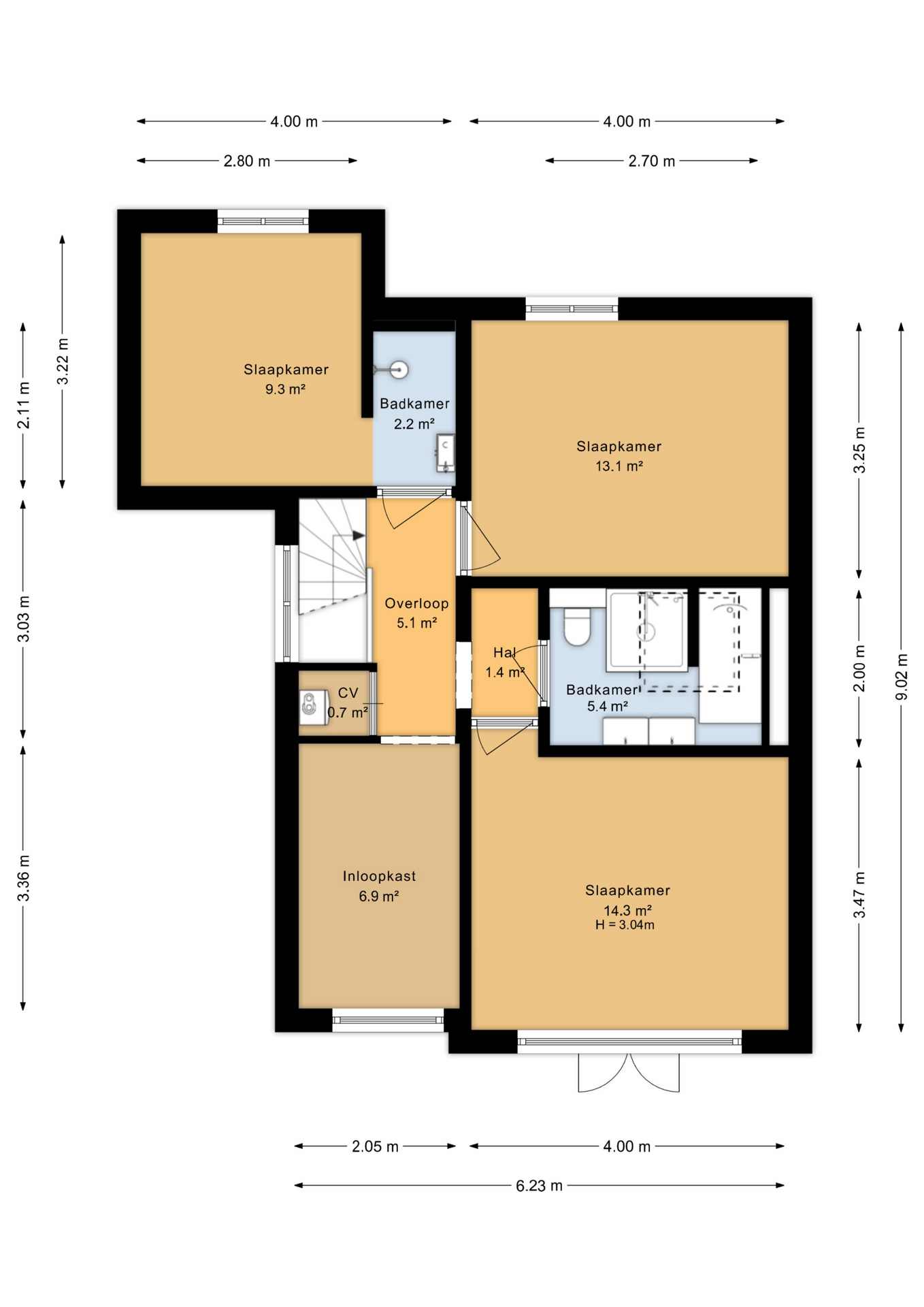 Via een prachtige trappartij bereikbare overloop met aparte cv ruimte en toegang tot de overige vertrekken. De 1e slaapkamer is gelegen aan de voorzijde en is ruim 14m² groot en heeft dubbele deuren naar het balkon. Middels de overloop is de badkamer toegankelijk met een dubbele wastafel, 2e toilet, douche en ligbad. Tevens aan de voorzijde, bevindt zich de inloopkast van bijna 7 m², indien gewenst is hier ook een (4e) slaapkamer van de maken. Aan de achterzijde liggen de 2e en 3e slaapkamer van respectievelijk 9,3 m² en 13,1 m² groot. De masterbedroom heeft een 2e badkamer, met douche en wastafel.