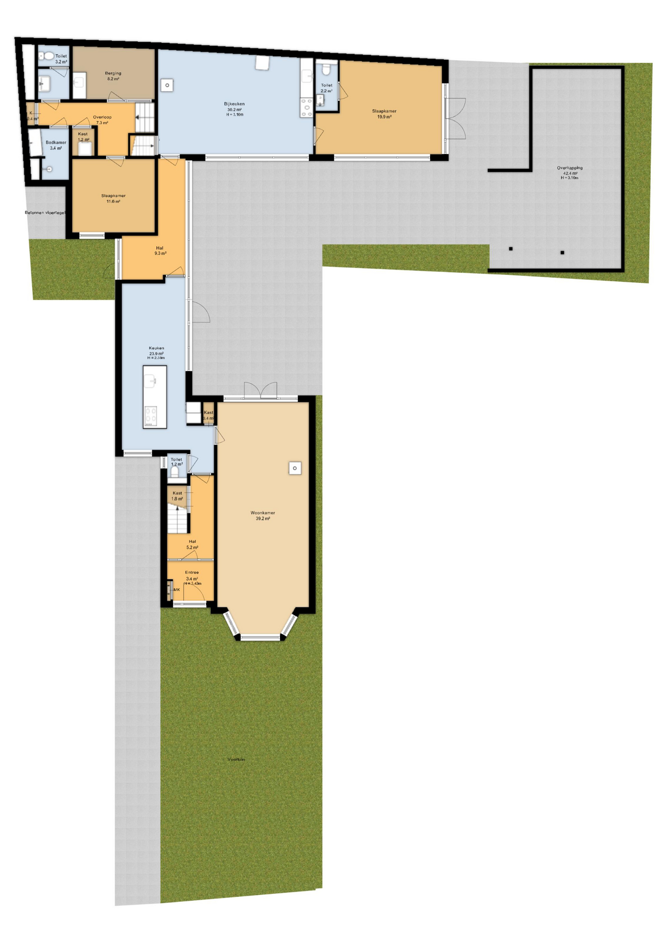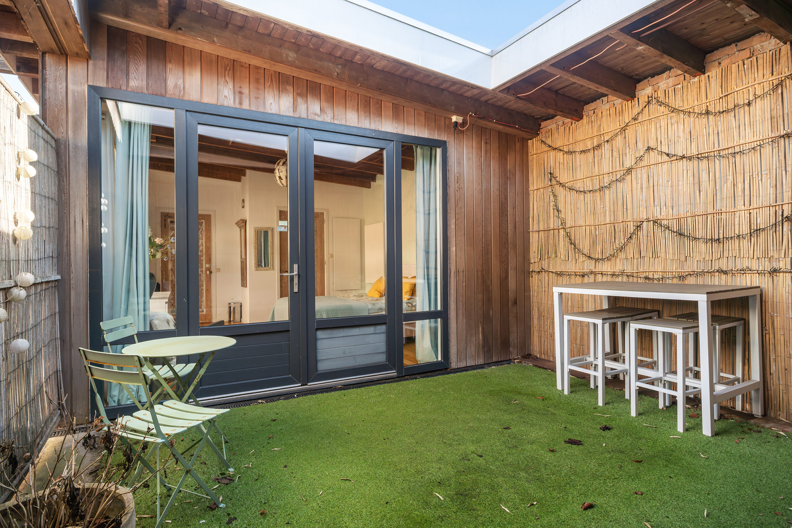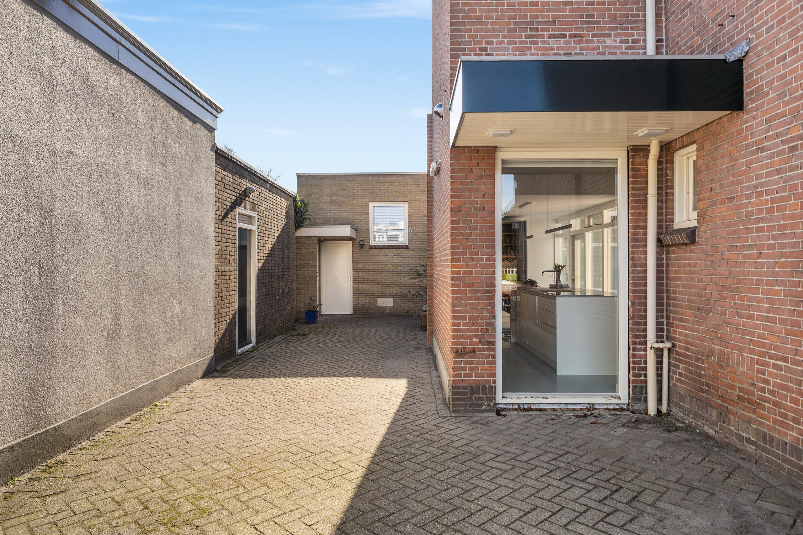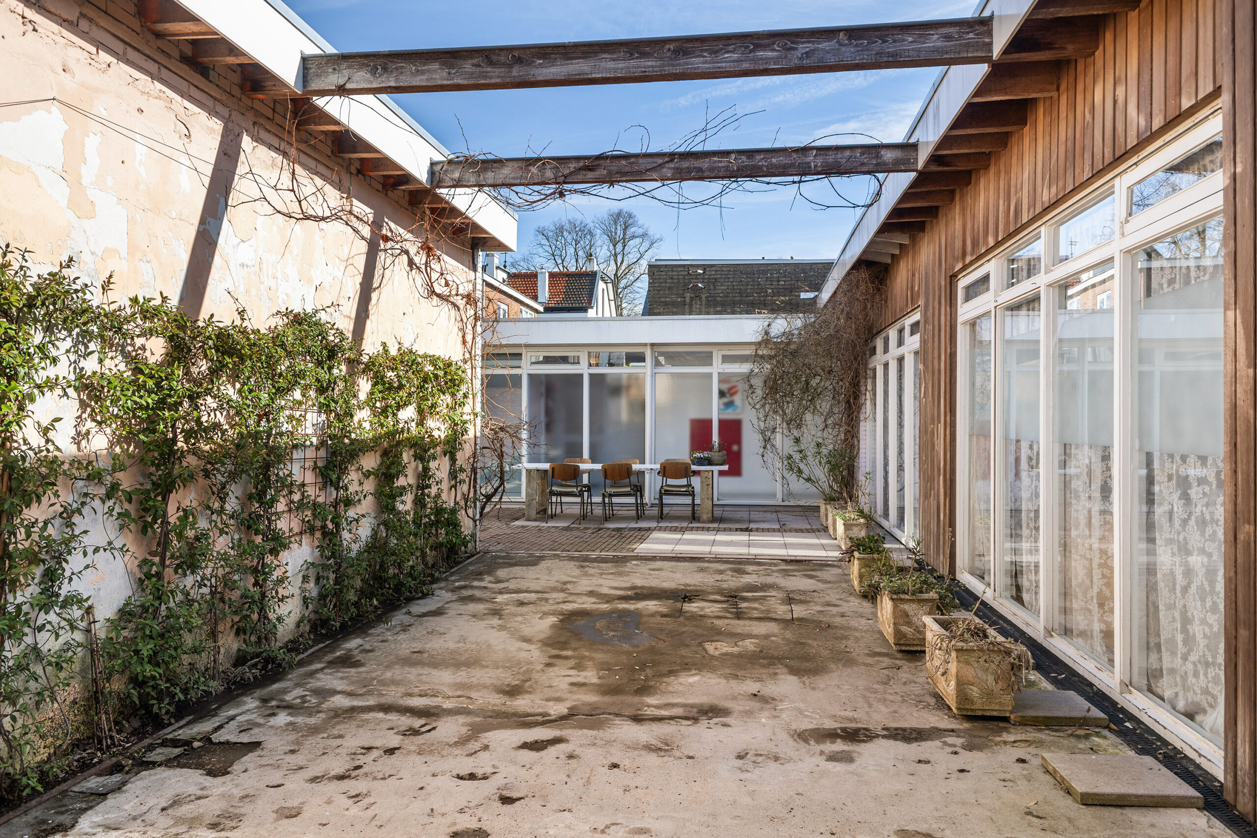 De volledig bestraatte achtertuin is gesitueerd op het zonnige zuiden en is vanuit de woonkamer, de keuken én vanuit het gastenverblijf toegankelijk. Er zijn diverse zithoekjes en daarnaast is er een royale overkapping (ruim 42m²). Voor het gastenverblijf is er een knusse ‘eigen’ tuin.