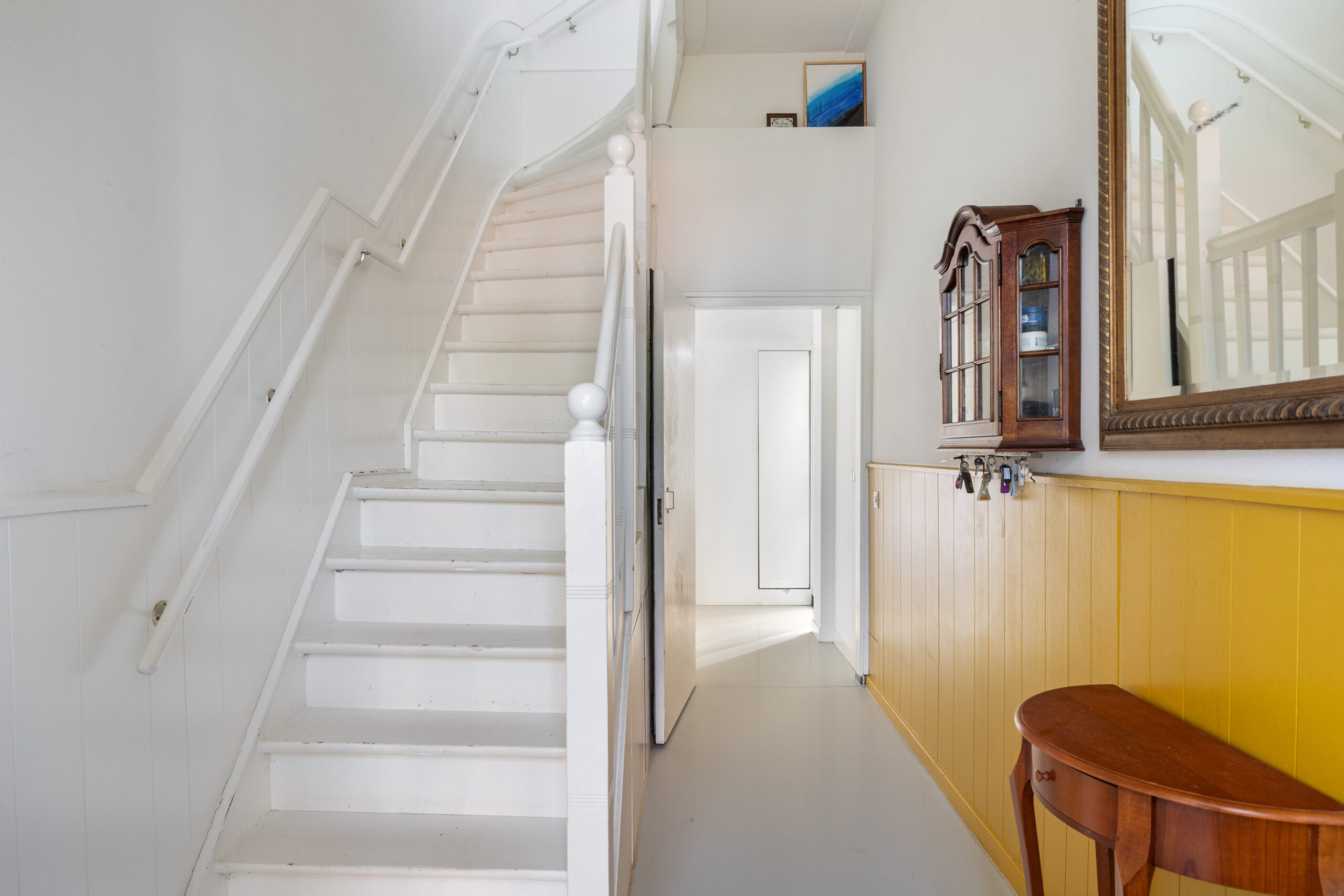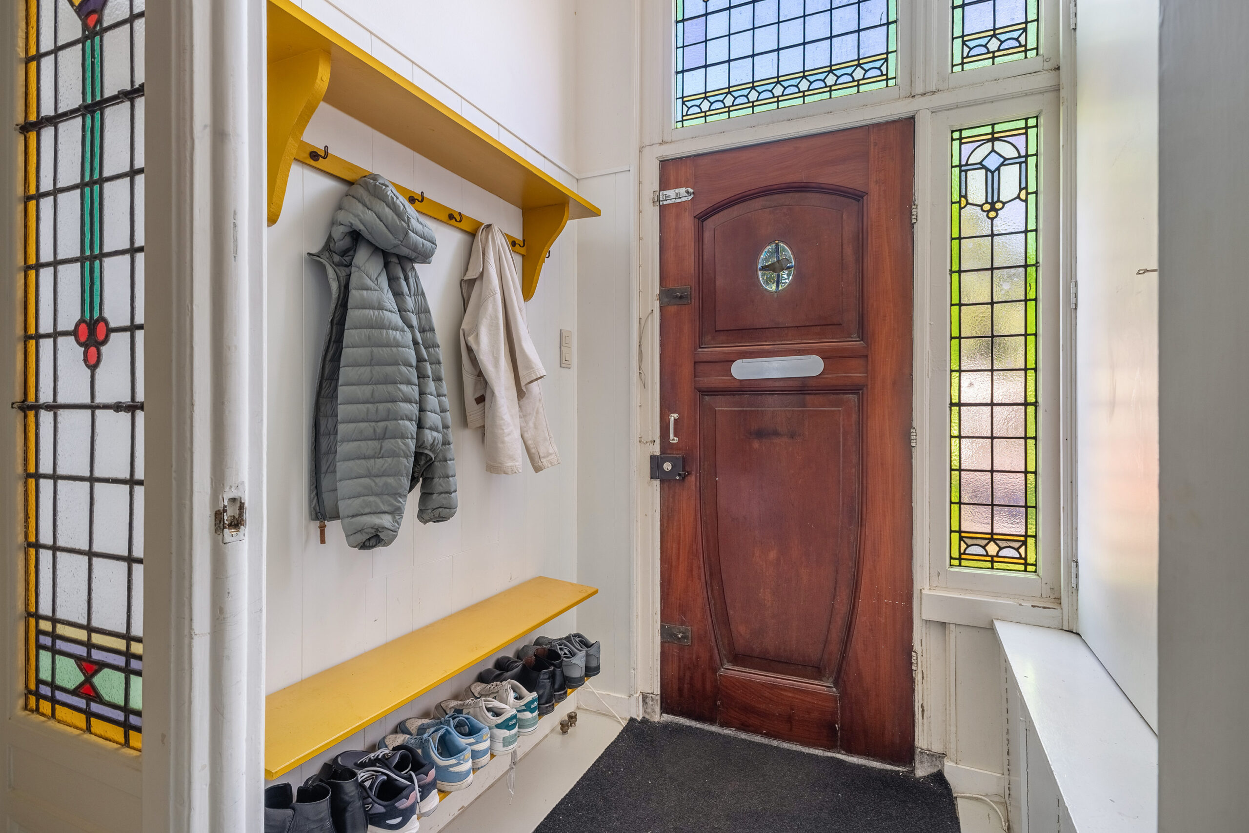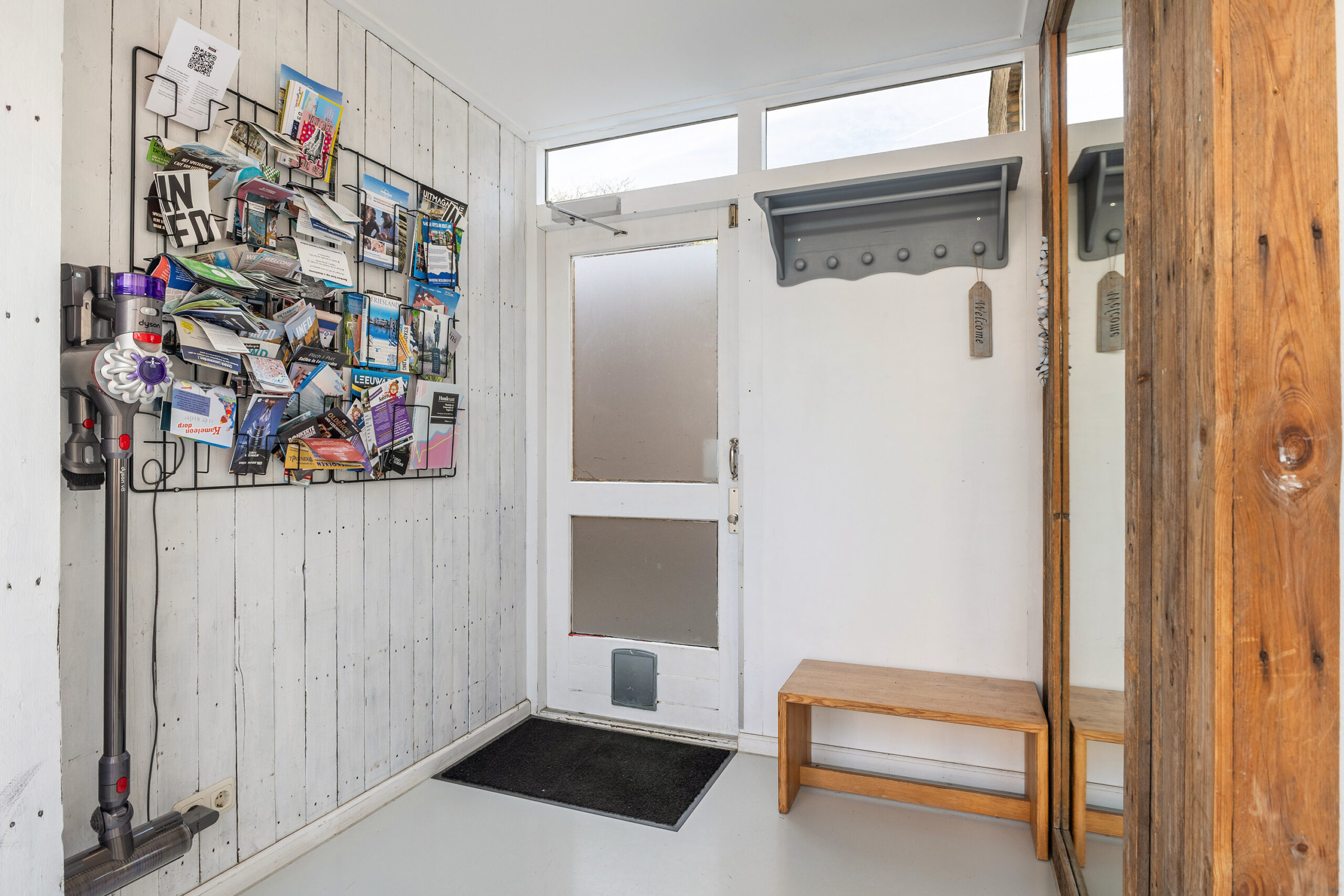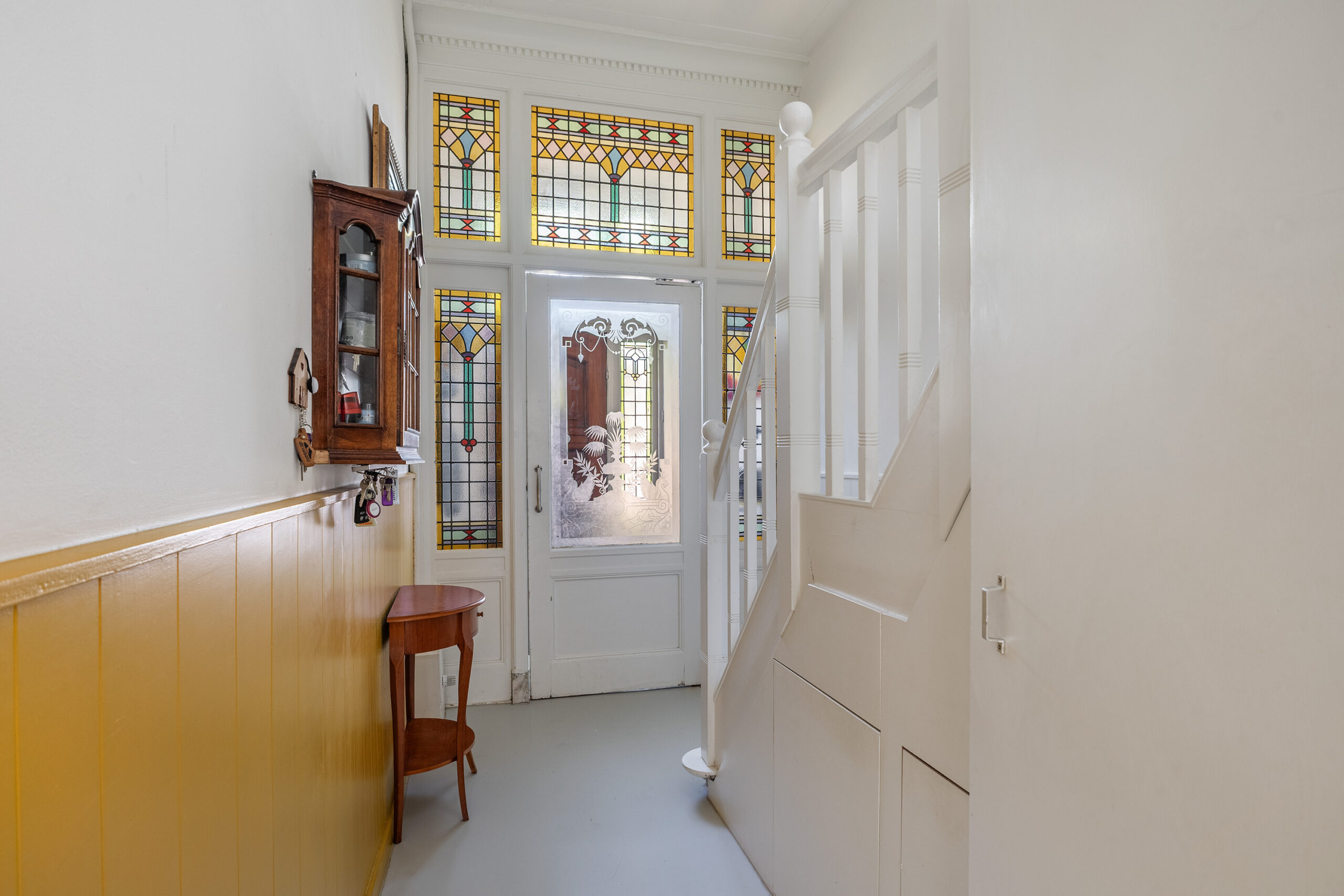 Middels de statige voordeur met glas-in-lood raampartij is de entree in het tochtportaal. Via een glazendeur is er een doorloop naar de hal alwaar het toilet en de trapopgang met ondergelegen provisieruimte.