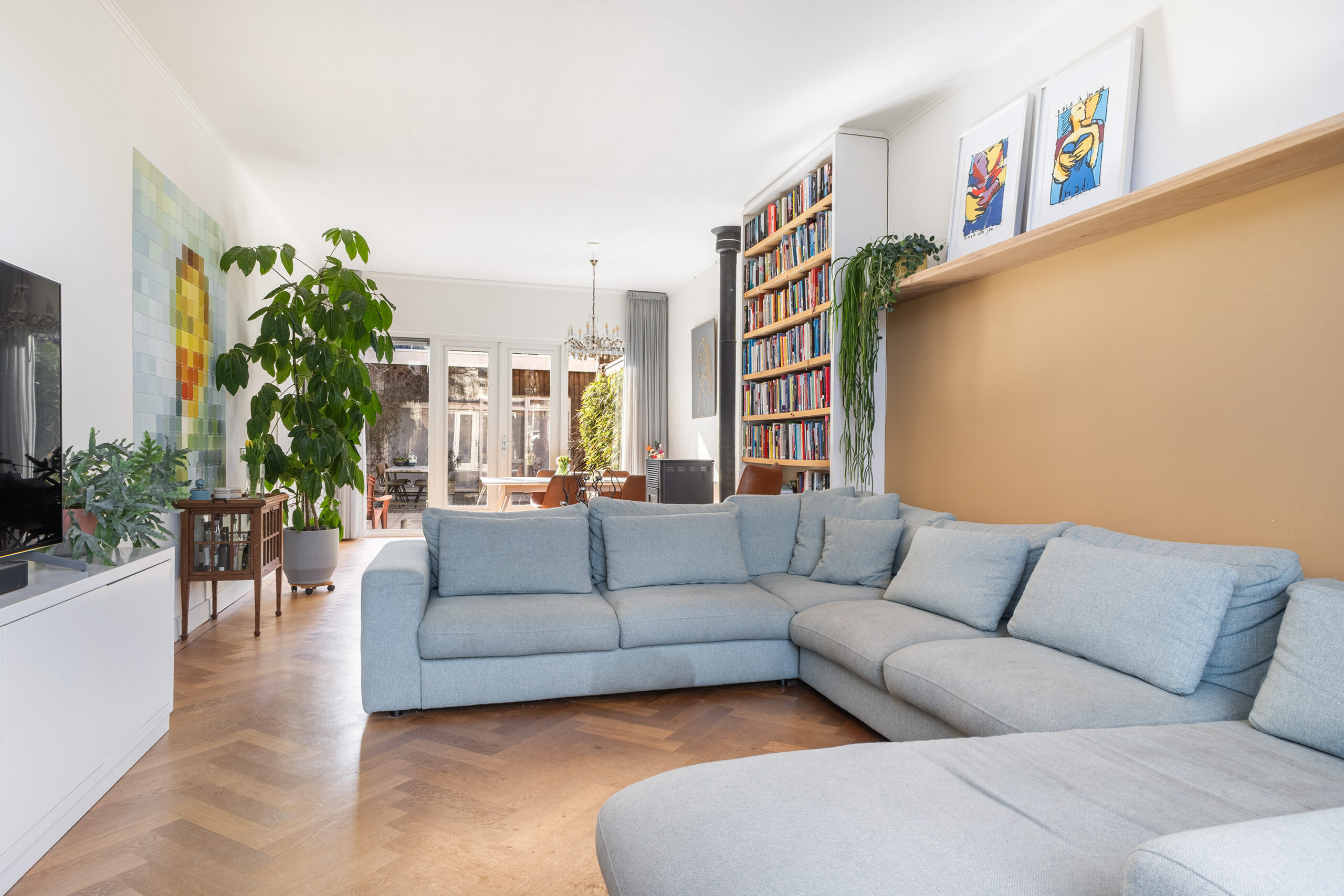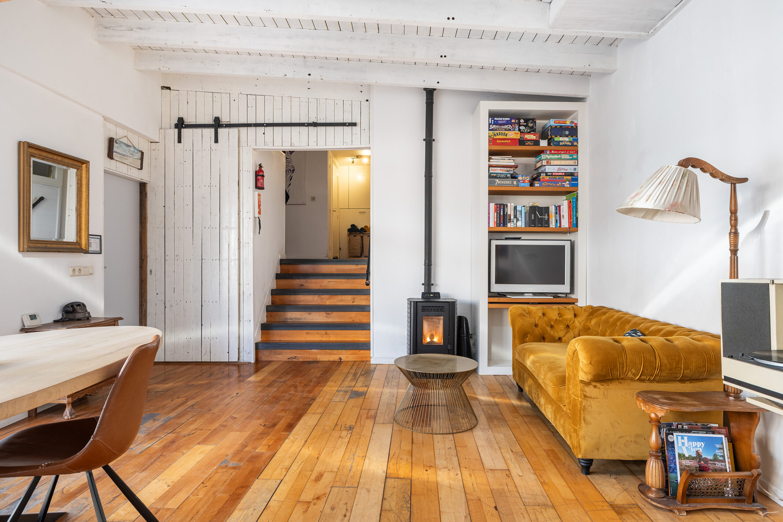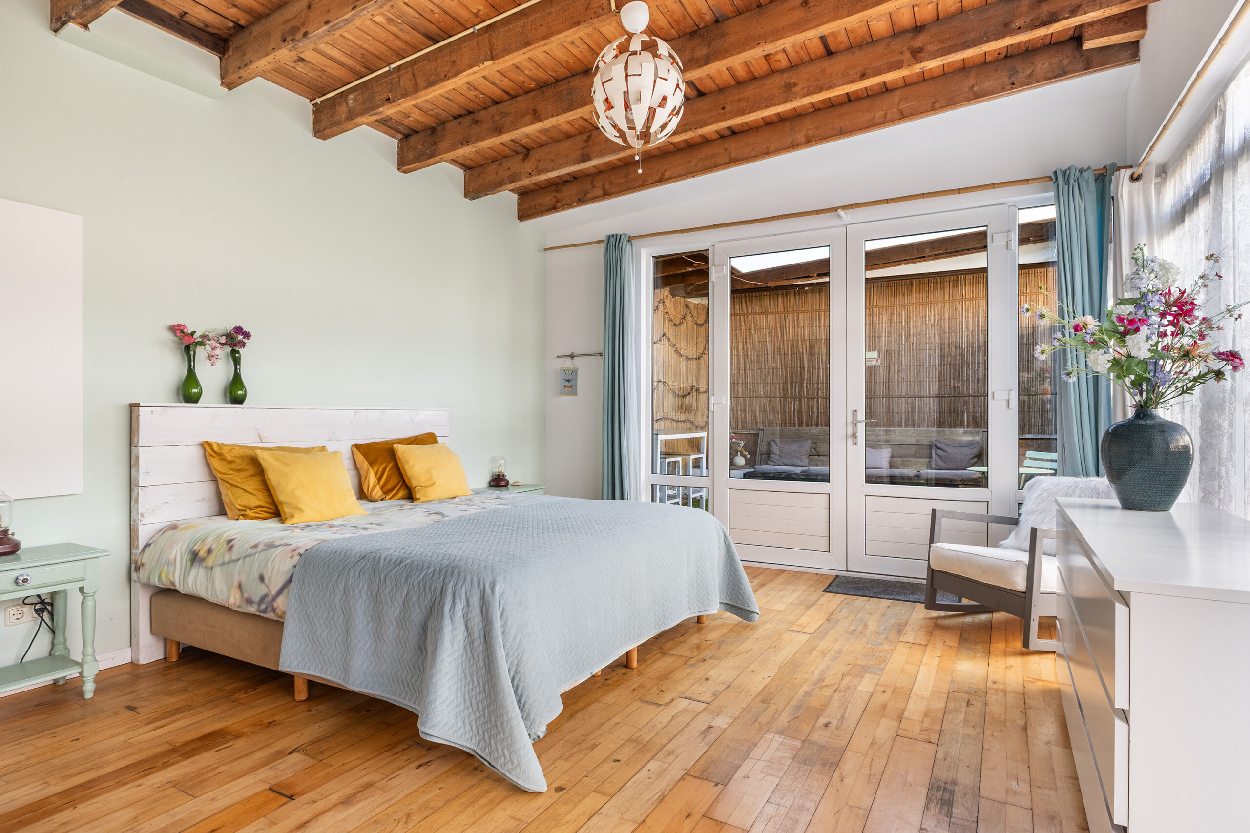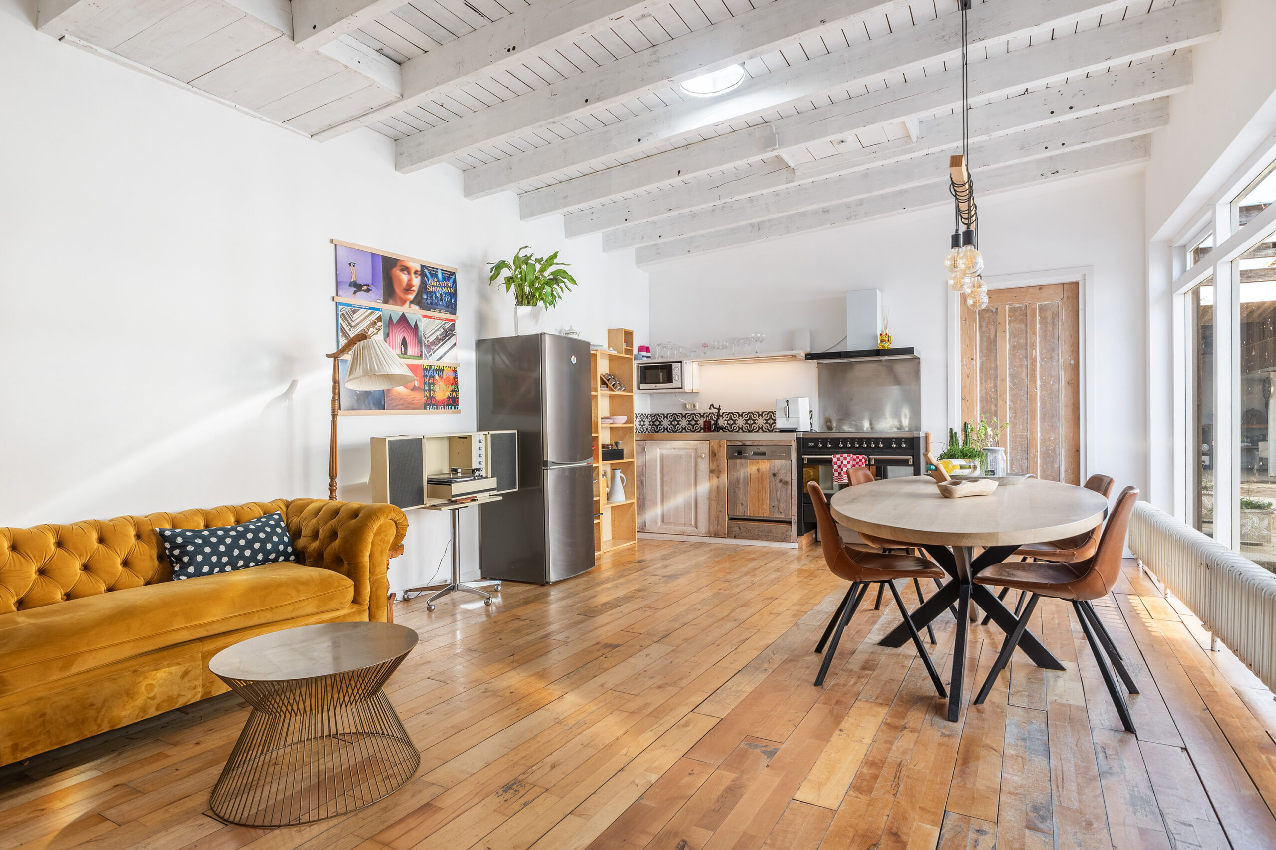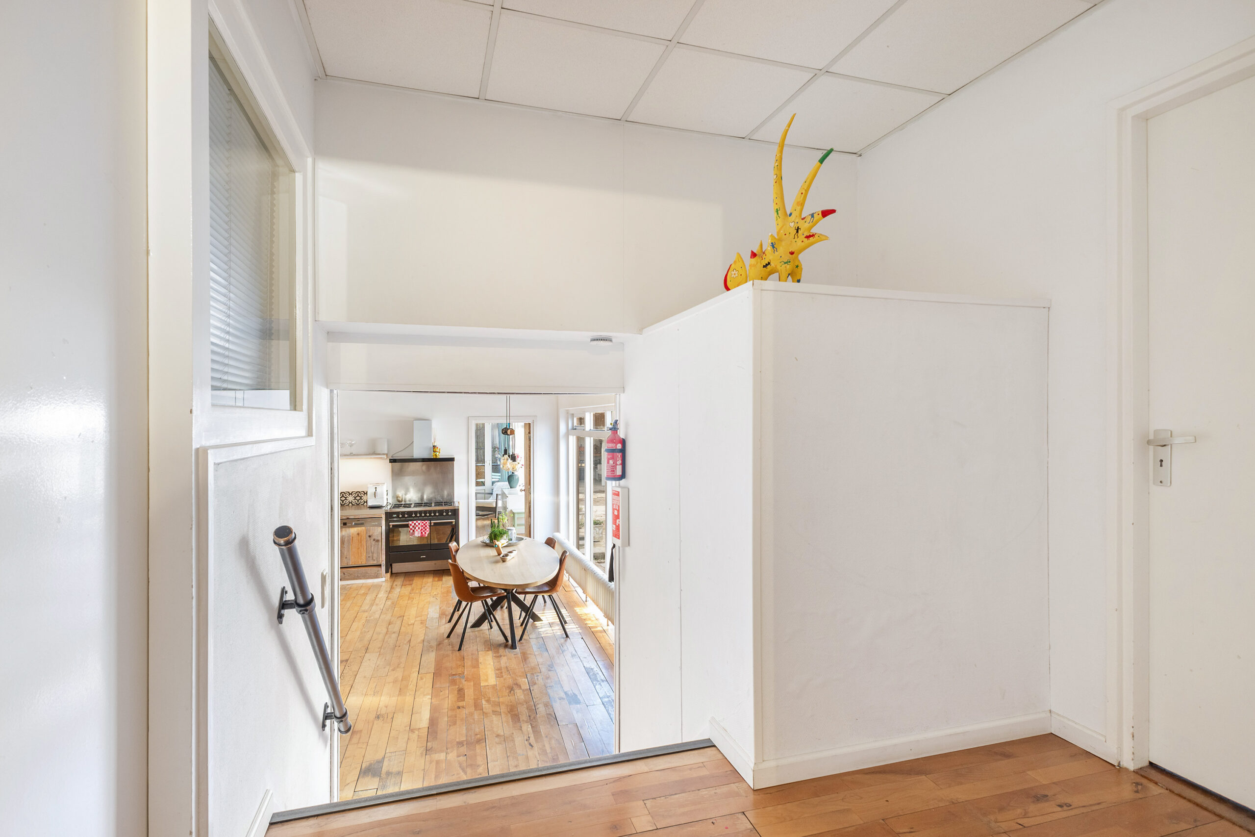 De sfeervolle en ruime doorzonwoonkamer heeft aan de voorzijde een erker, er ligt een mooie houten visgraatvloer en aan de achterzijde zijn er openslaande deuren naar de achtertuin. De woonkamer wordt middels cv en een pelletkachel verwarmd. Vanuit de achterkamer is er een doorloop naar de moderne en lichte keuken met een kook- en spoeleiland, een apparatuur wand en veel ruimte in lades en kasten. Door de aanwezigheid van de grote raampartijen en de loopdeur naar de tuin, is de keuken een heerlijk licht vertrek. Achter de keuken bevindt zich een hal met toegang naar het ruime gastenverblijf/kantoorruimtes. Tevens is er vanaf de oprit, ook een eigen ingang naar het gastenverblijf/kantoorruimtes.